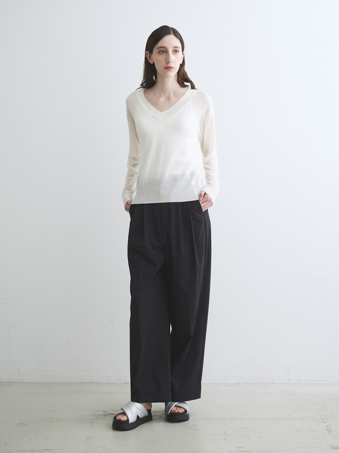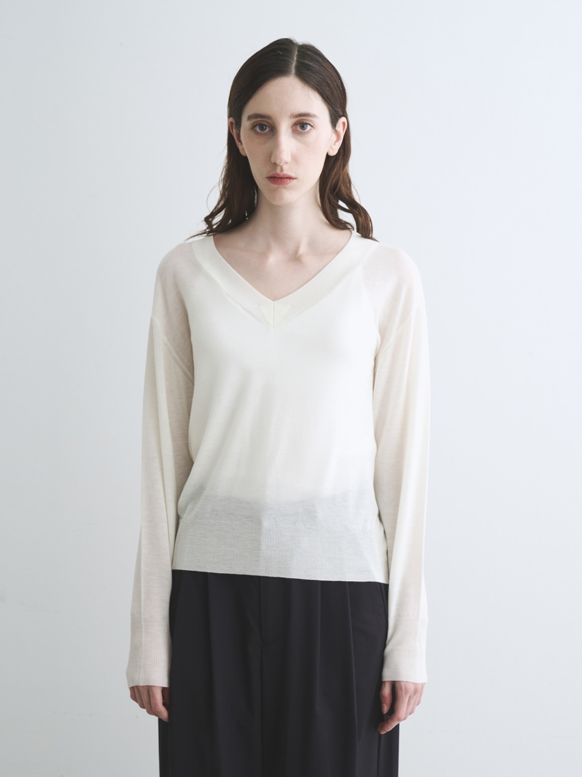 水溶性の糸を一緒に編立て、製品にしてから洗うことでふんわり軽いタッチを実現したエアーニット製法のセーター。その名の通りエアリーでとろけるような着心地を叶えます。抜け感のあるVネックは、シャープさにほどよい女性らしさを加え、ハンサムな着こなしに。同素材のカーディガンも展開しております。 quality:アクリル42%,ウール30%,ナイロン28% country:中国