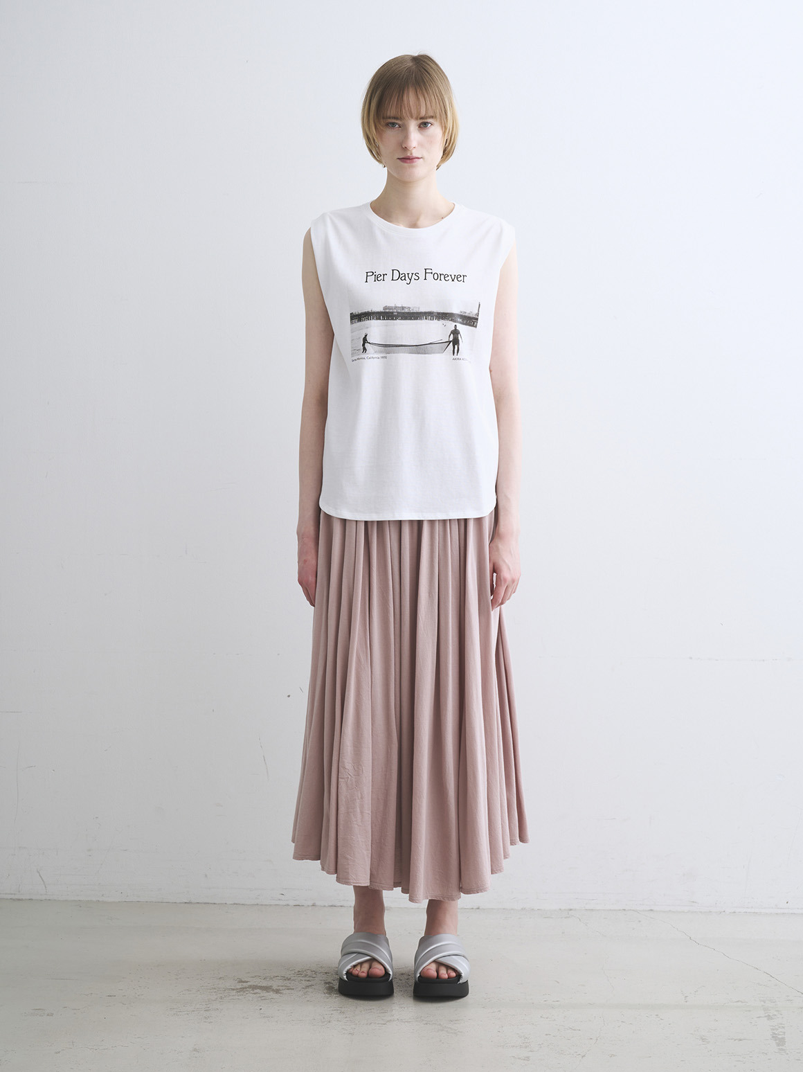 日常を切り取ったカリフォルニアの風景が着こなしに圧倒的な雰囲気をもたらしてくれる一枚です。Black&Whiteのフィルム写真はどこかノスタルジックで着こなしを大人らしくシフト。