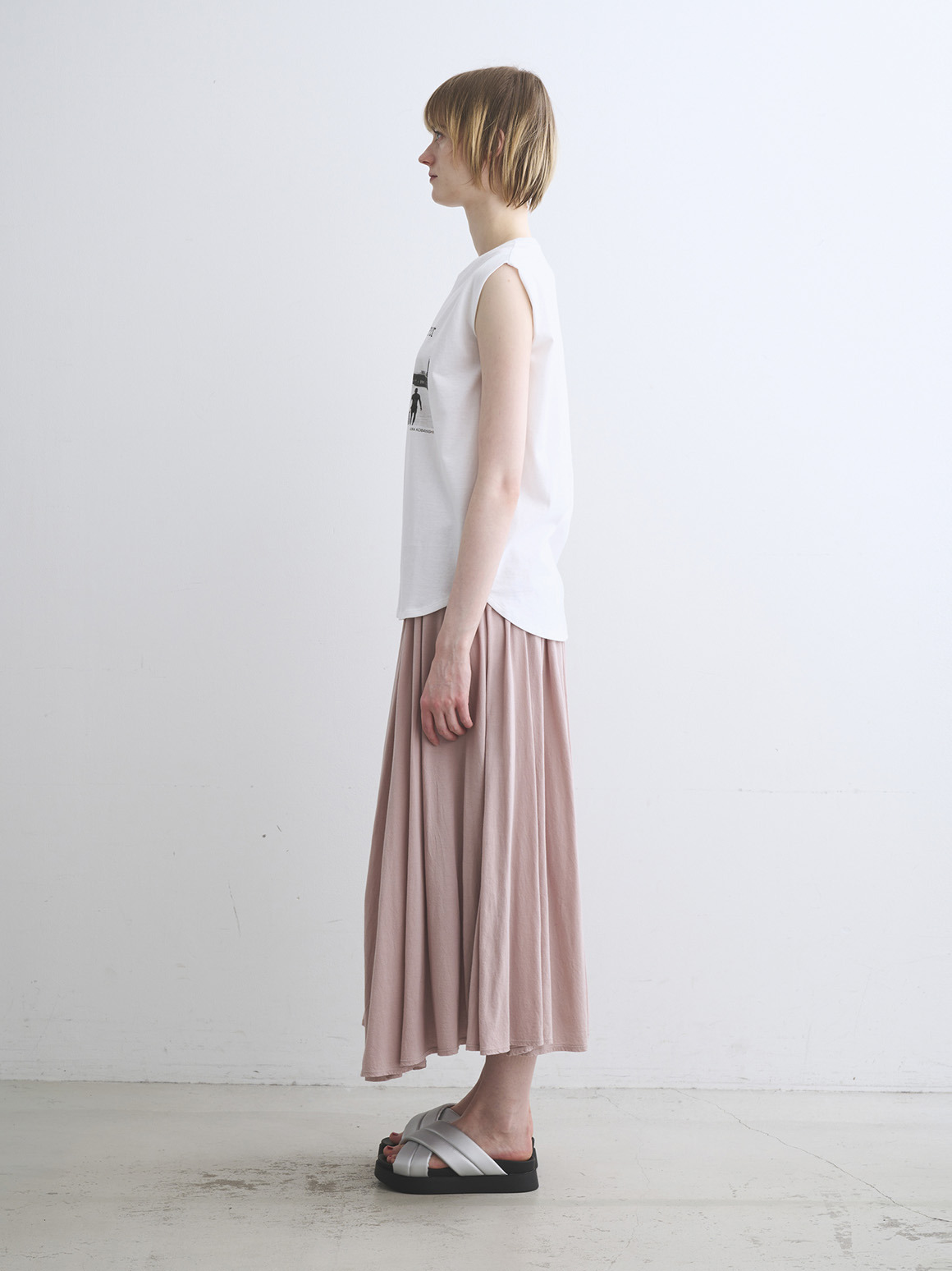 ショルダータックの入ったタンクトップは二の腕周りを自然にカバー。すっきりとしたシルエットを実現します。
