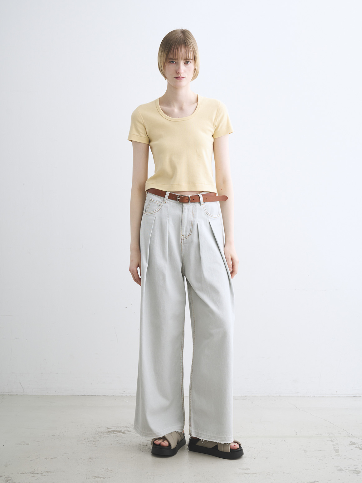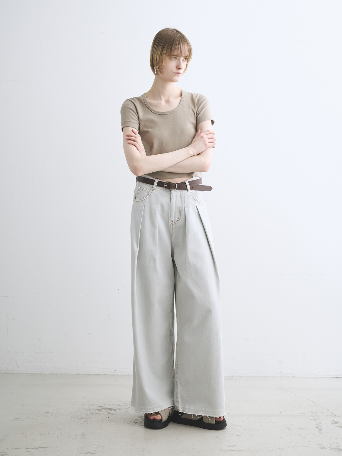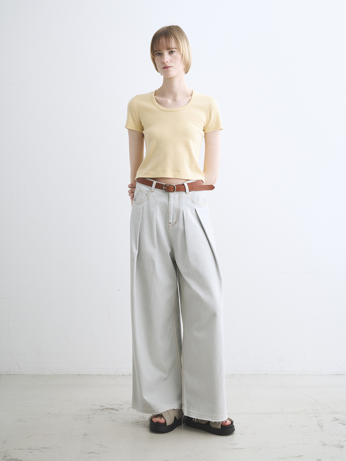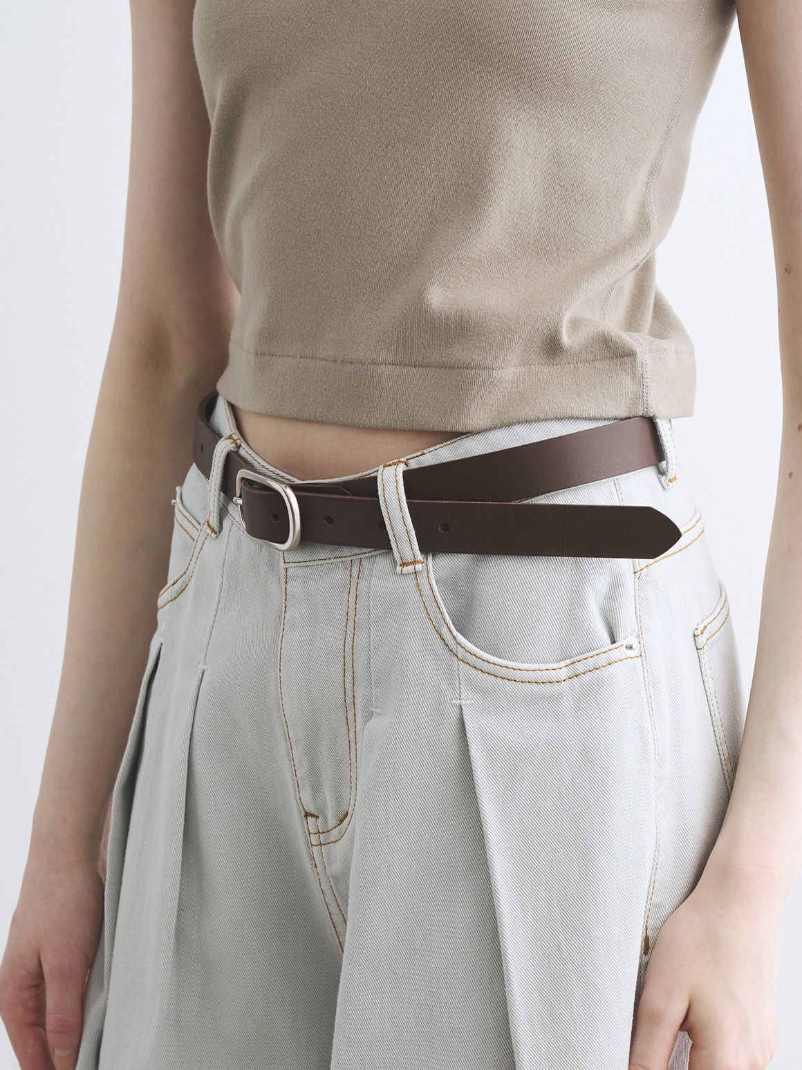 使うほどに馴染み、こなれていく革の魅力をお楽しみいただける革ベルト。太すぎず、細すぎない、女性のスタイリングに合わせやすいナローデザイン。マットな金具は癖が無く、アクセサリー感覚でポイントになりながらも強調しすぎないほどよいバランスで着用できます。ウエストの調整だけでなく、1点投入でぐっと雰囲気が出るため、Tシャツとパンツのシンプルコーディネートの際におすすめ。ホール数が多いので、ウエストマークしてボトムスをぎゅっと引き上げたいたいときにも、緩めに締めて腰で履くスタイルにも対応。