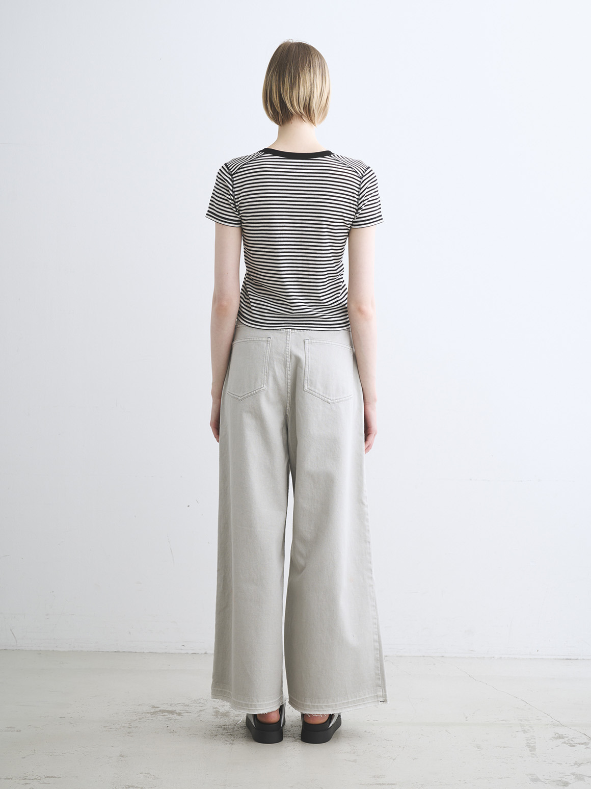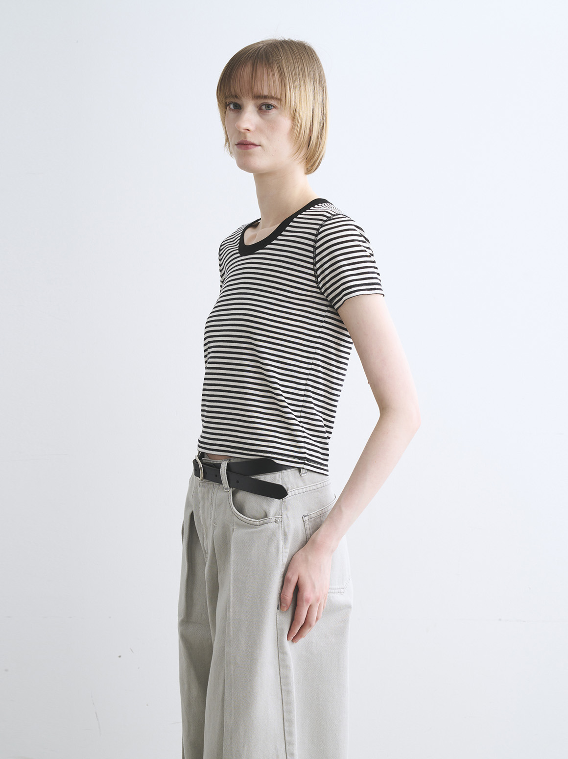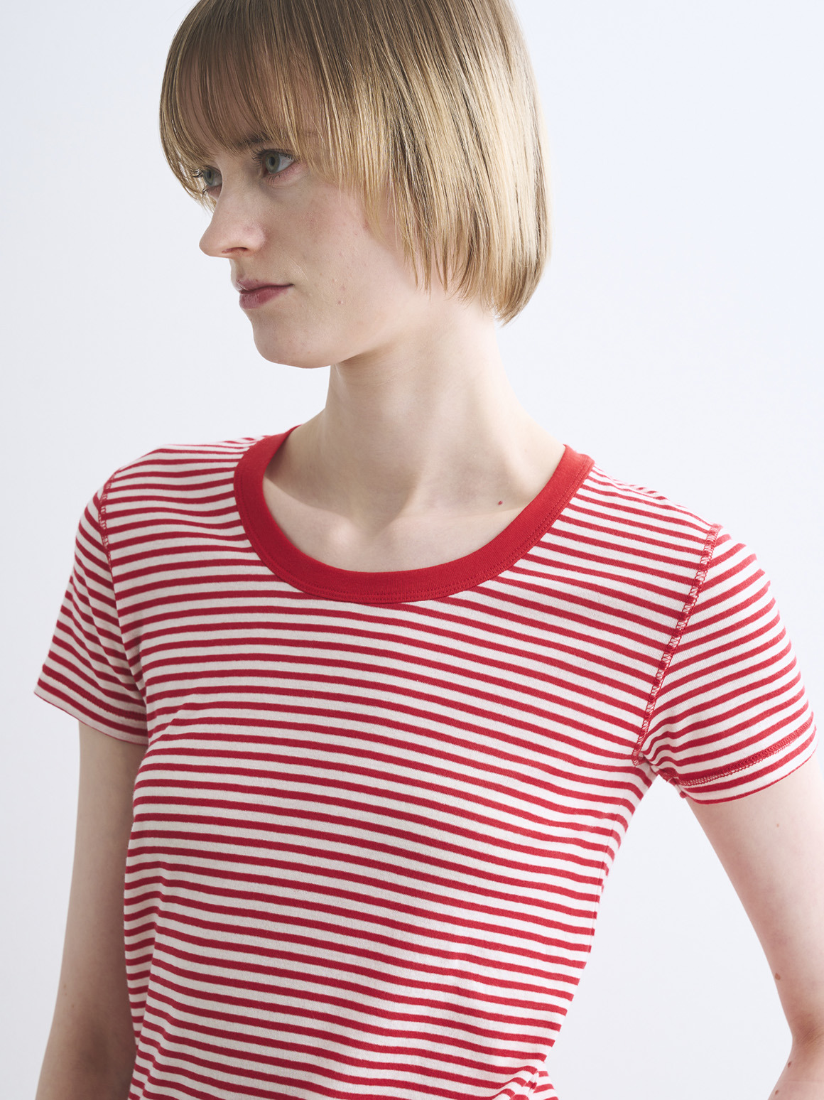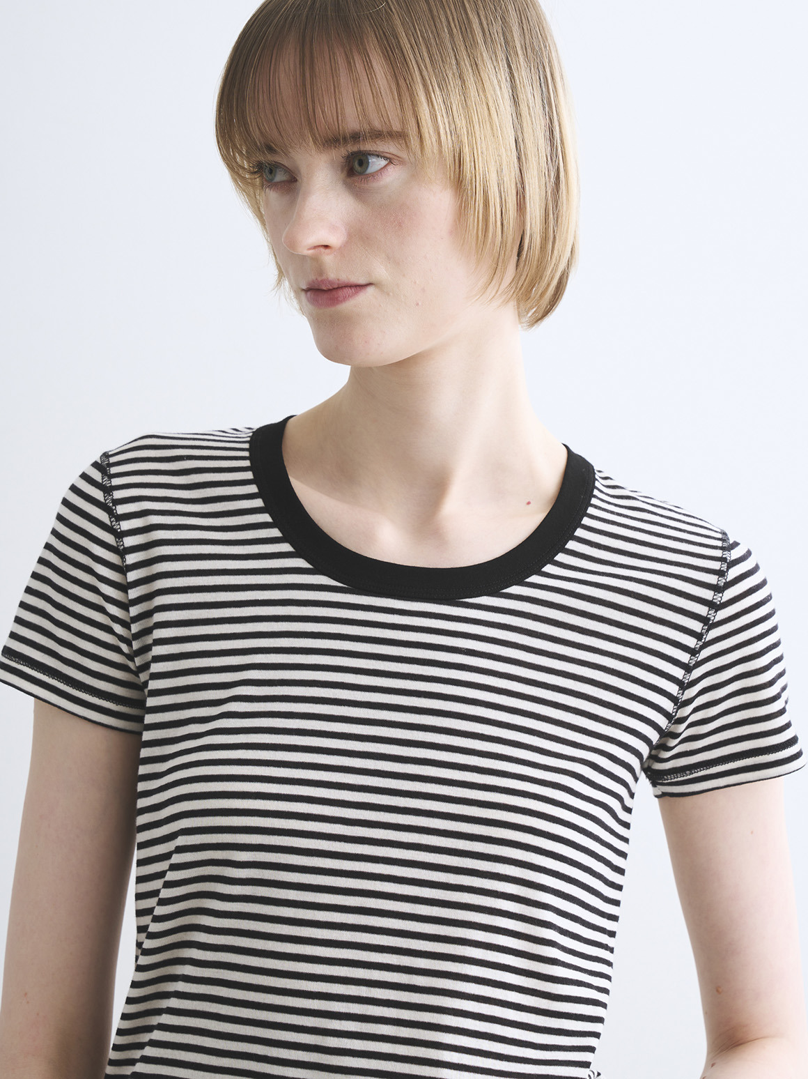 肌触りにこだわった新作カットソー。80番手の極細のコットン糸にストレッチ性を持たせた、伸びやかなジャージー素材を使用。薄く繊細な生地であってもだれにくく、特殊加工によりもっちりとした柔らかな風合いに仕上げております。トラベルラインのレーヨンジャージーと似た質感を持ちながら、極細のコットンによりエアリーさを感じられ、滑らか派の方にもふんわり派の方にも満足いただける一枚。ジェシカネックのクロップド丈で、タックイン要らずでハイウエストのパンツやスカートと好バランス。トレンドを感じる軽やかさがありながら、安心して着用いただける絶妙なレングスです。