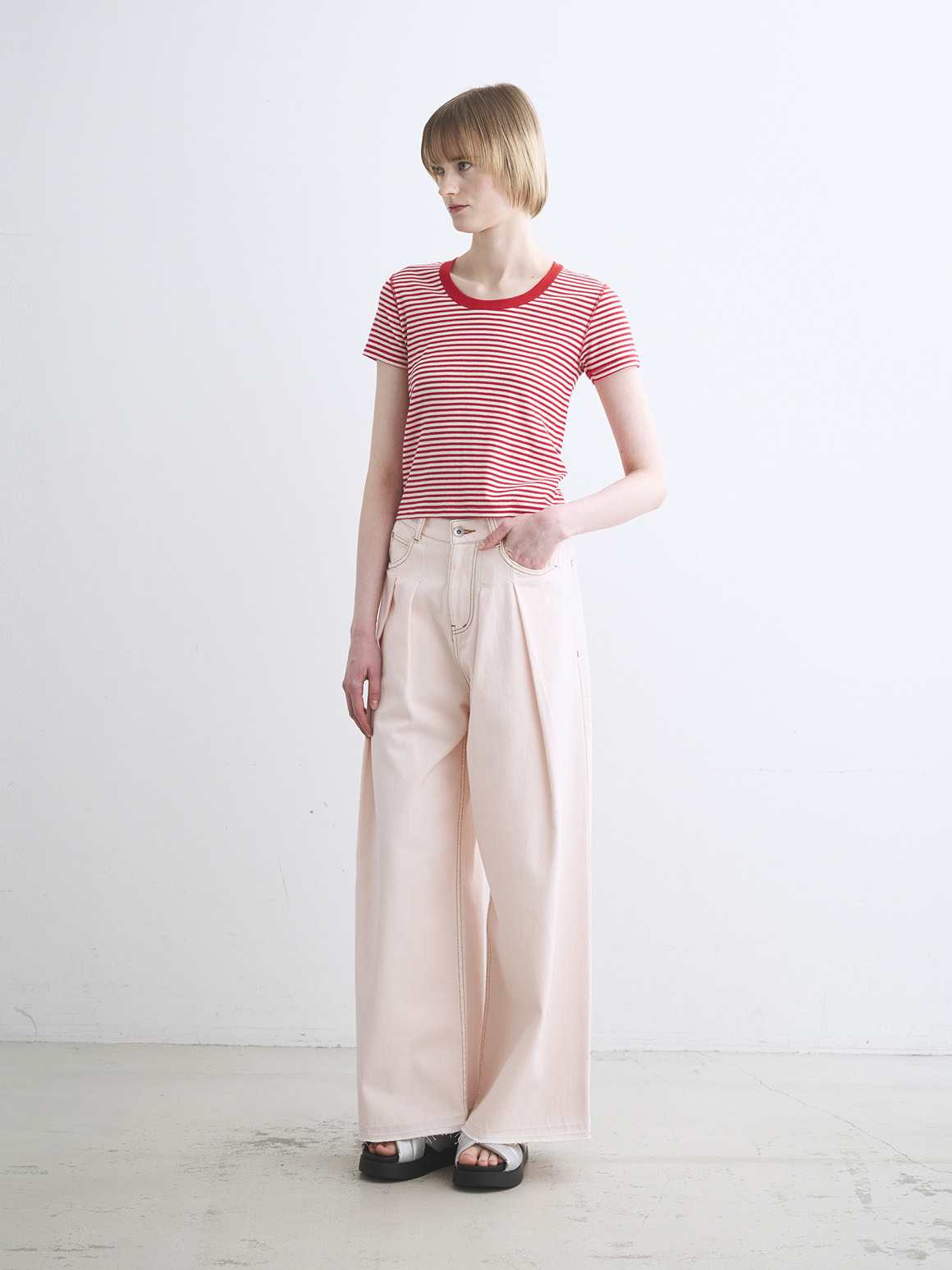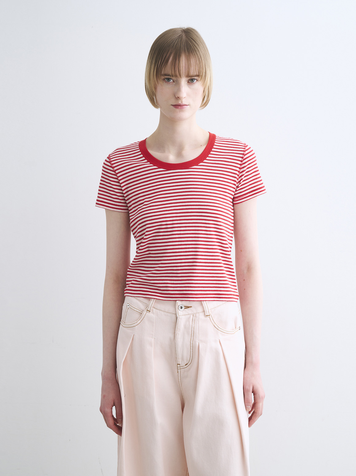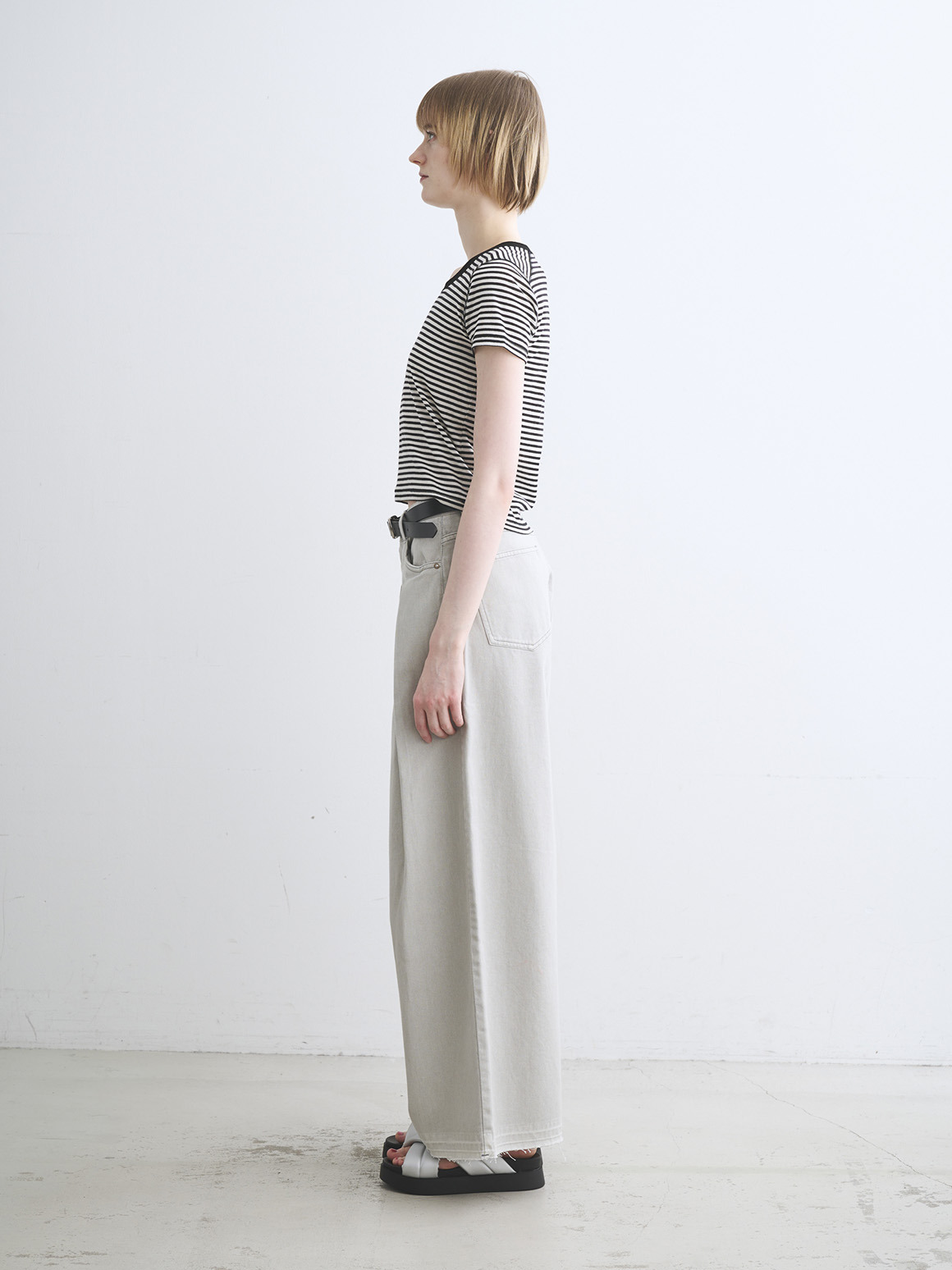 肌触りにこだわった新作カットソー。80番手の極細のコットン糸にストレッチ性を持たせた、伸びやかなジャージー素材を使用。薄く繊細な生地であってもだれにくく、特殊加工によりもっちりとした柔らかな風合いに仕上げております。トラベルラインのレーヨンジャージーと似た質感を持ちながら、極細のコットンによりエアリーさを感じられ、滑らか派の方にもふんわり派の方にも満足いただける一枚。ジェシカネックのクロップド丈で、タックイン要らずでハイウエストのパンツやスカートと好バランス。トレンドを感じる軽やかさがありながら、安心して着用いただける絶妙なレングスです。