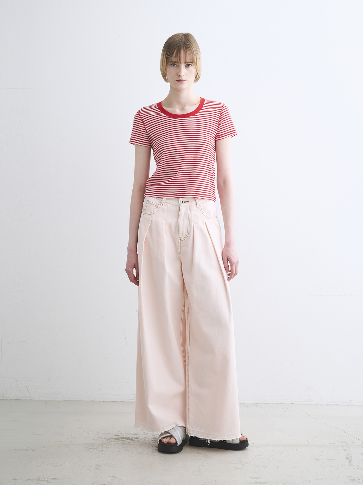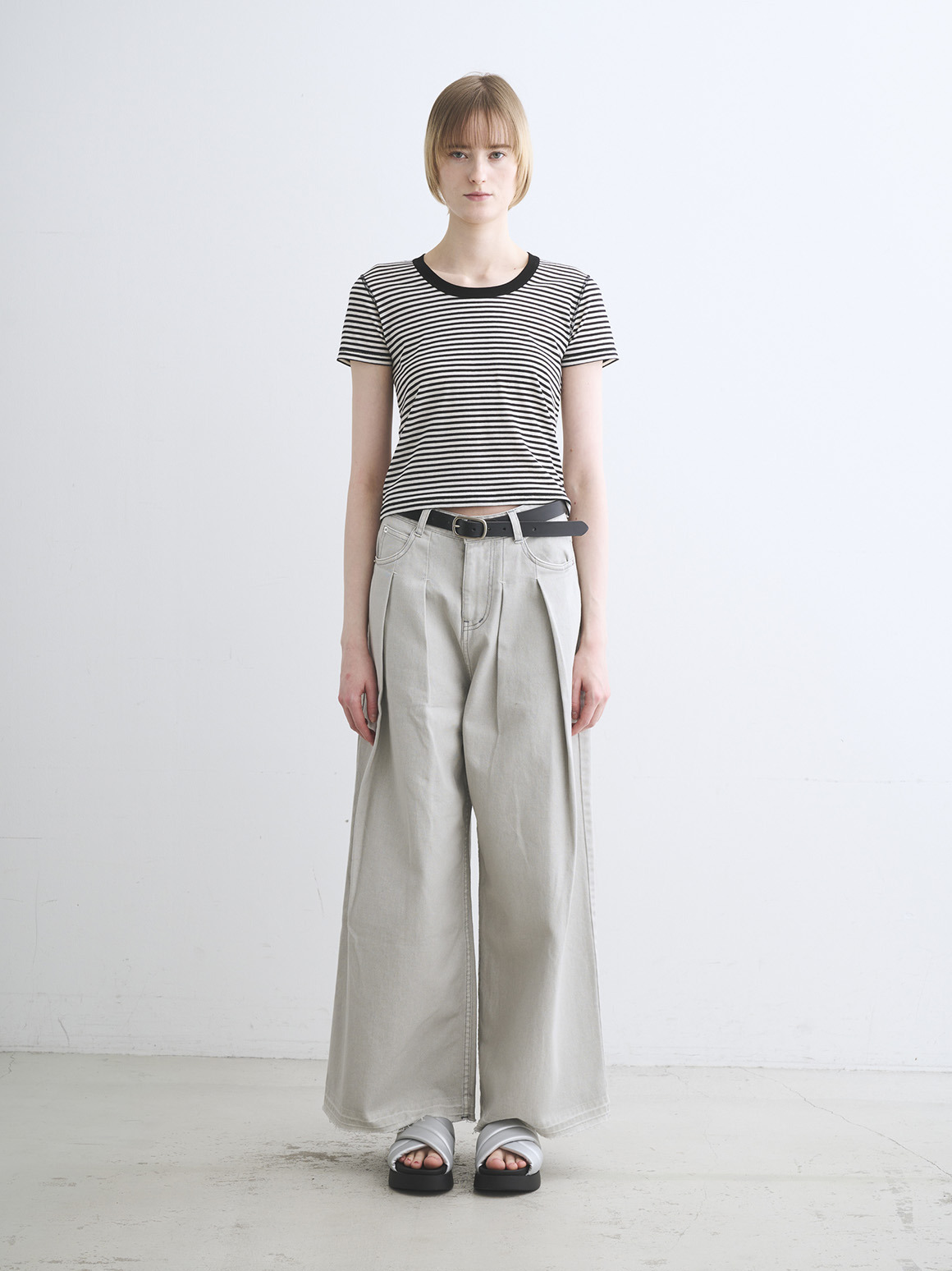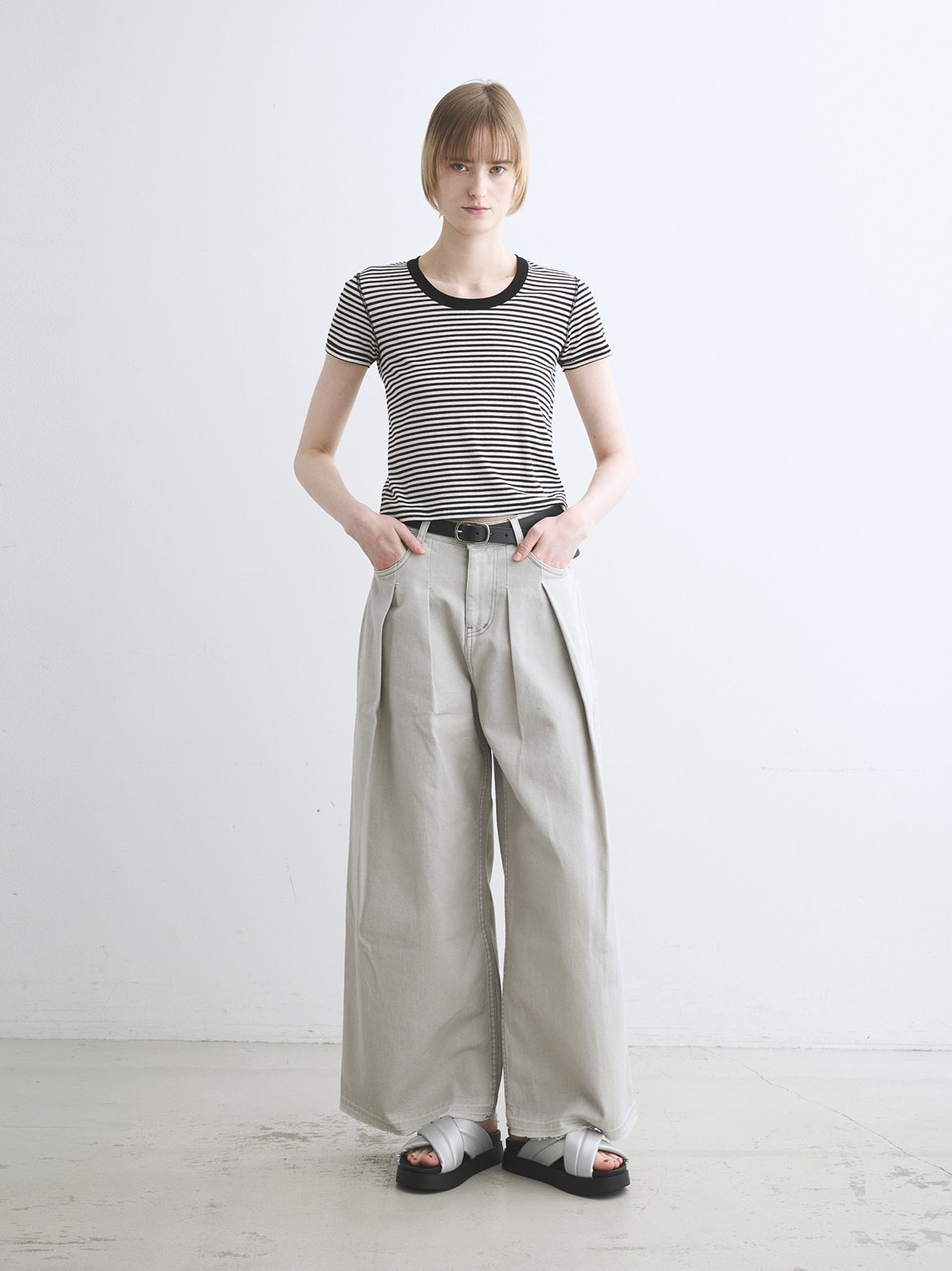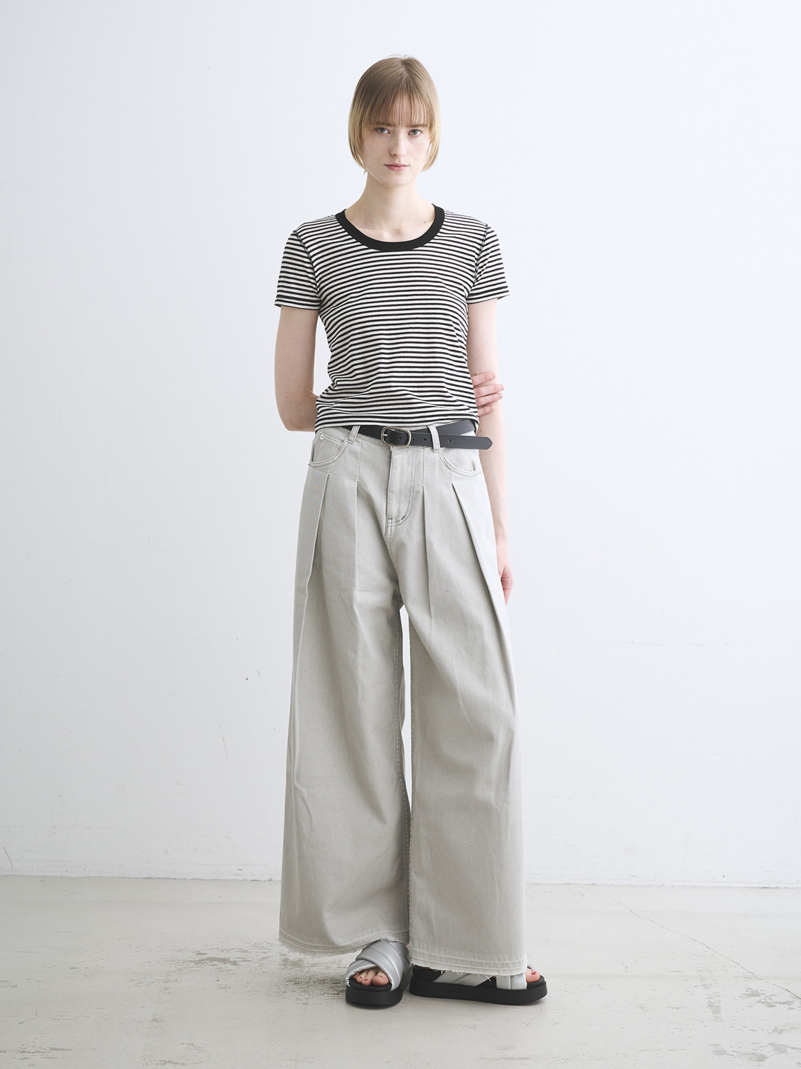 肌触りにこだわった新作カットソー。80番手の極細のコットン糸にストレッチ性を持たせた、伸びやかなジャージー素材を使用。薄く繊細な生地であってもだれにくく、特殊加工によりもっちりとした柔らかな風合いに仕上げております。トラベルラインのレーヨンジャージーと似た質感を持ちながら、極細のコットンによりエアリーさを感じられ、滑らか派の方にもふんわり派の方にも満足いただける一枚。ジェシカネックのクロップド丈で、タックイン要らずでハイウエストのパンツやスカートと好バランス。トレンドを感じる軽やかさがありながら、安心して着用いただける絶妙なレングスです。