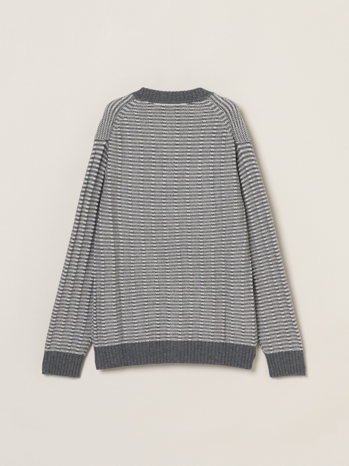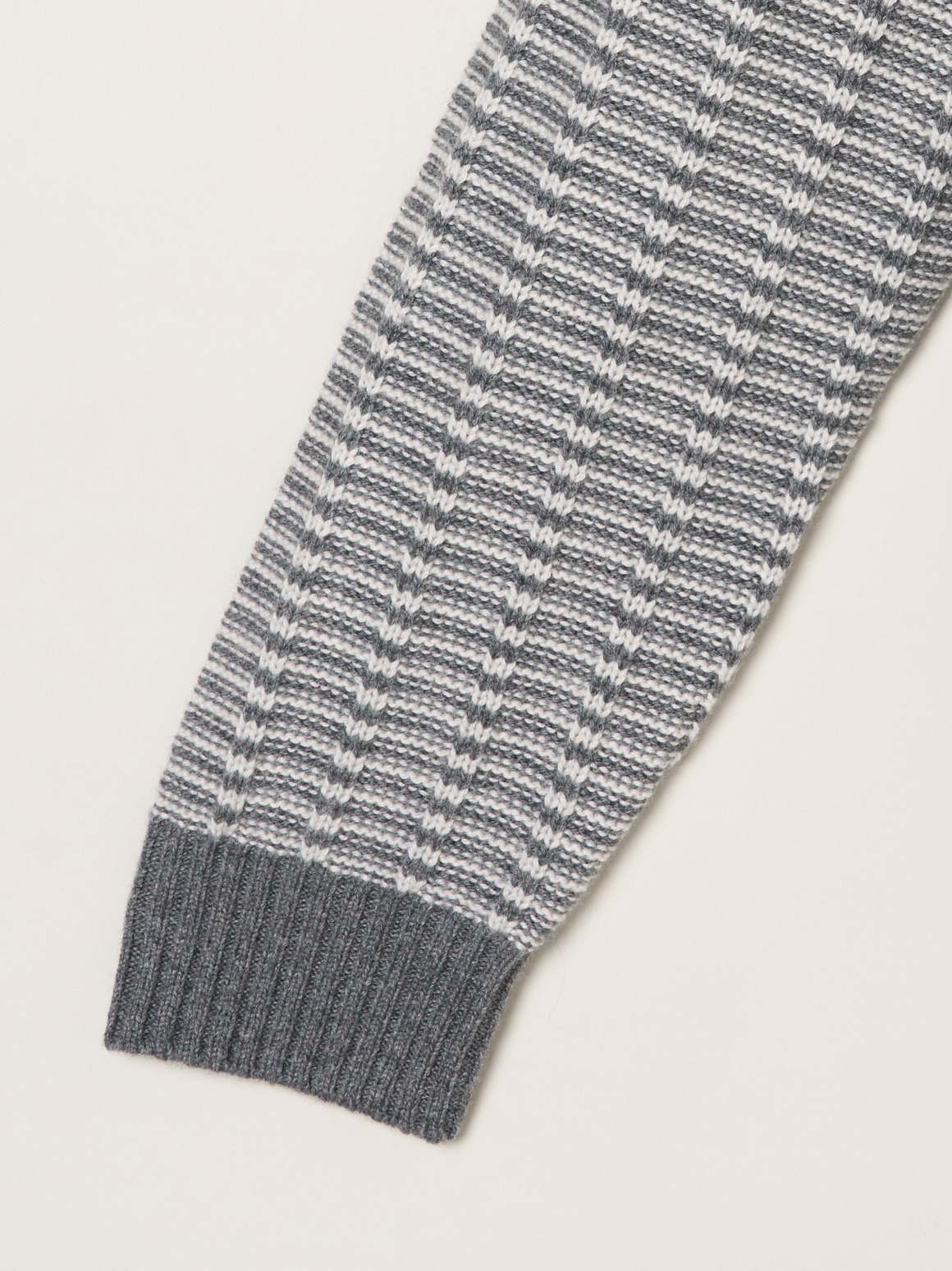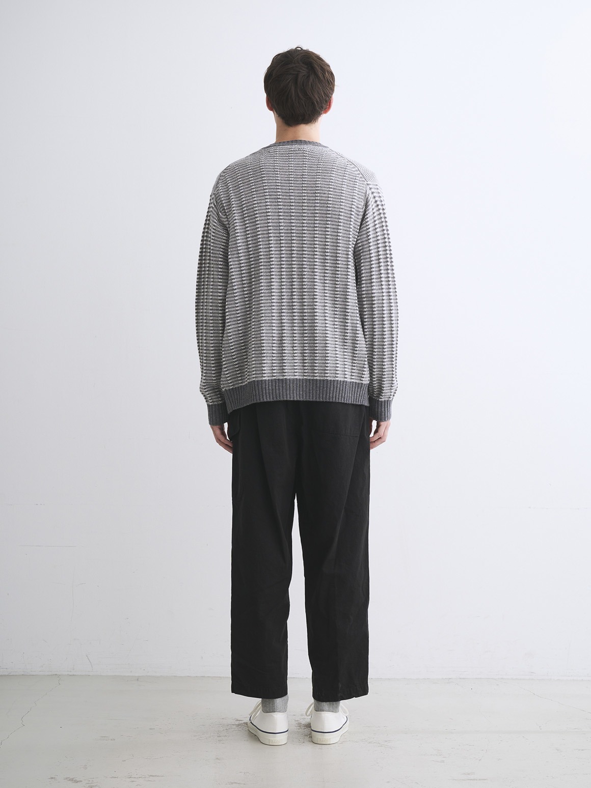 針抜きボーダーの裏目を使用し、シンプルな中に大人の遊びを表現したテクニカルなセーター。