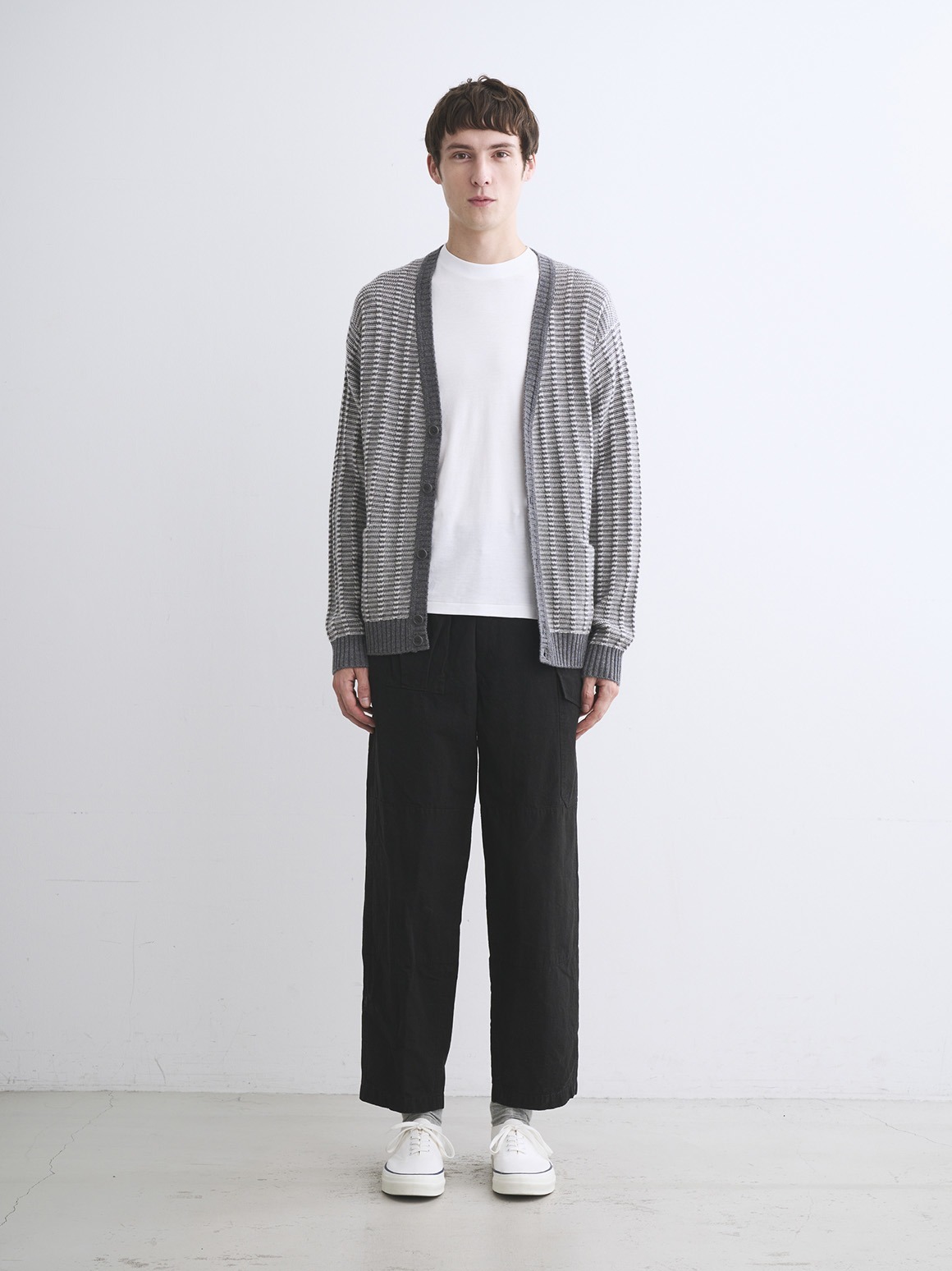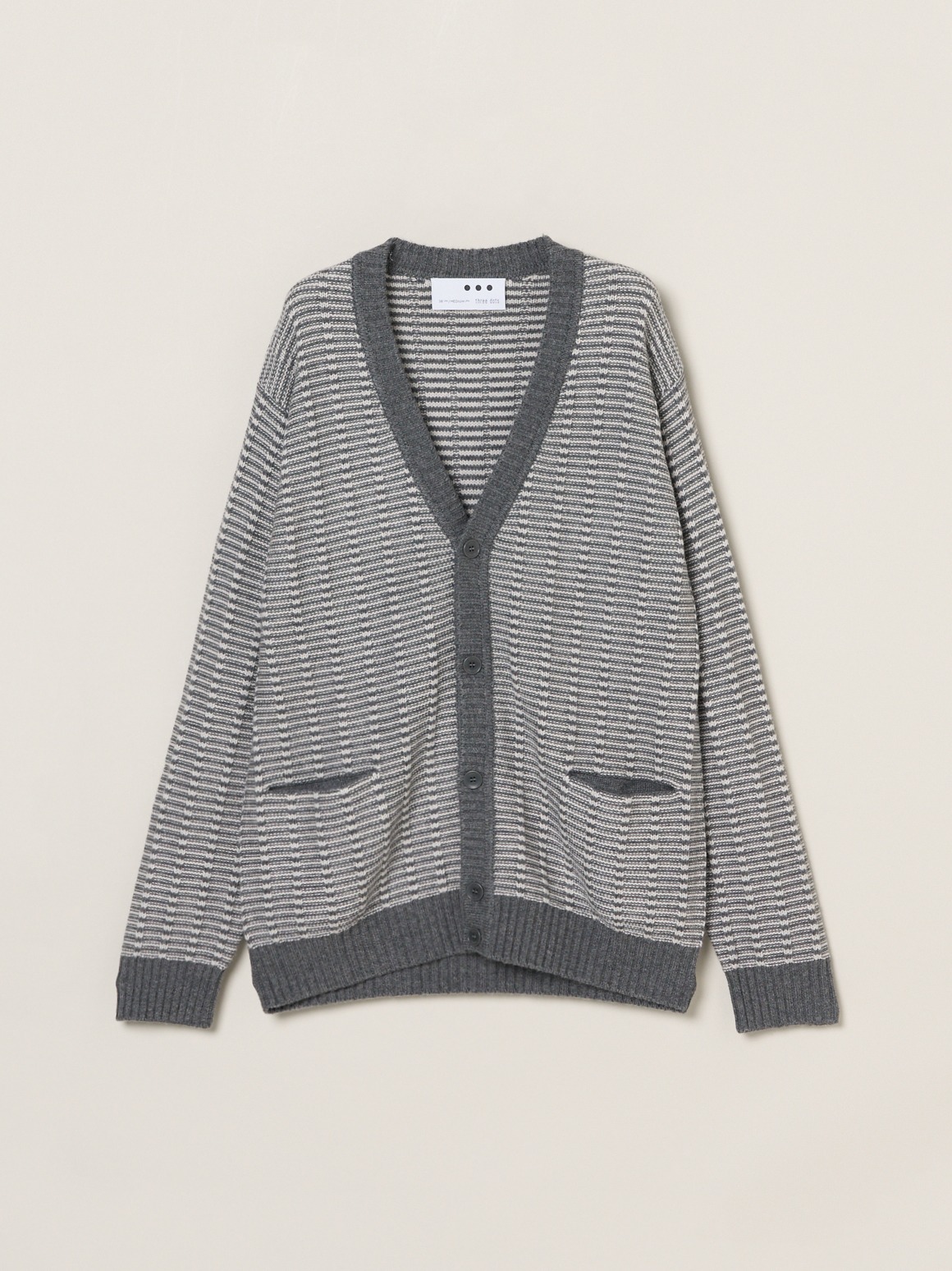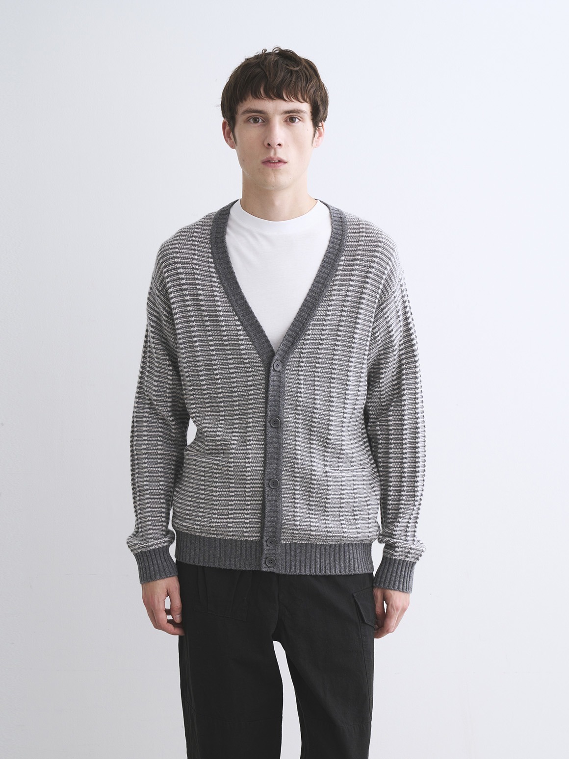 ボーダーの中に縦ストライプが走る模様が特徴で、フワッと軽く着心地の良さが特徴で、Vネックのカーディガンは、シャツやタートルネックとの相性も良く、秋冬のレイヤードスタイルにも活躍する万能アイテムです。