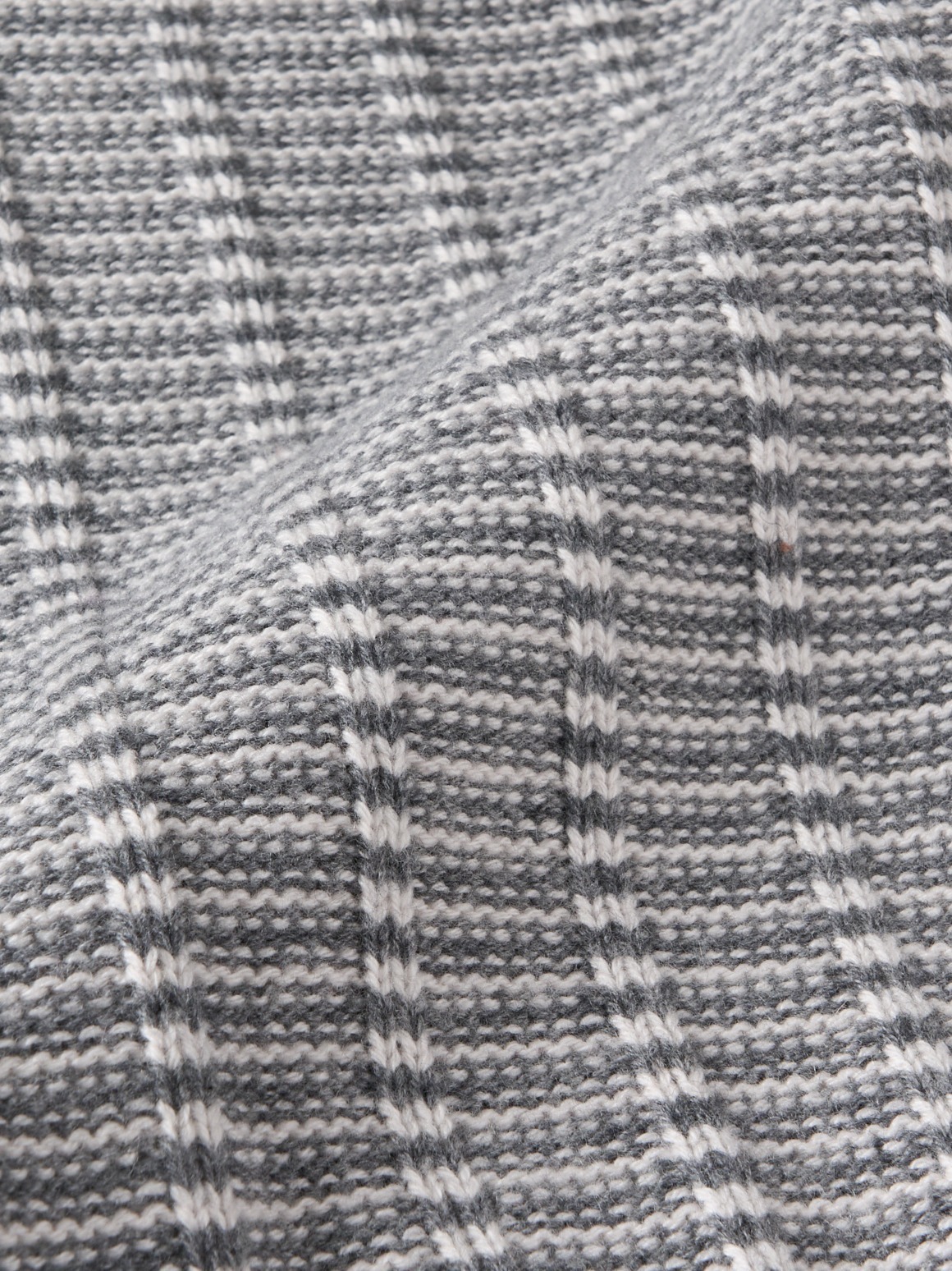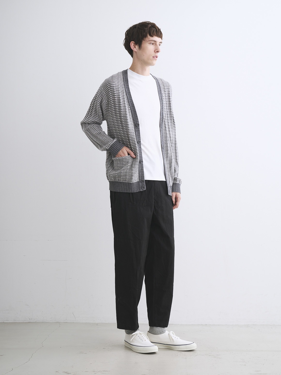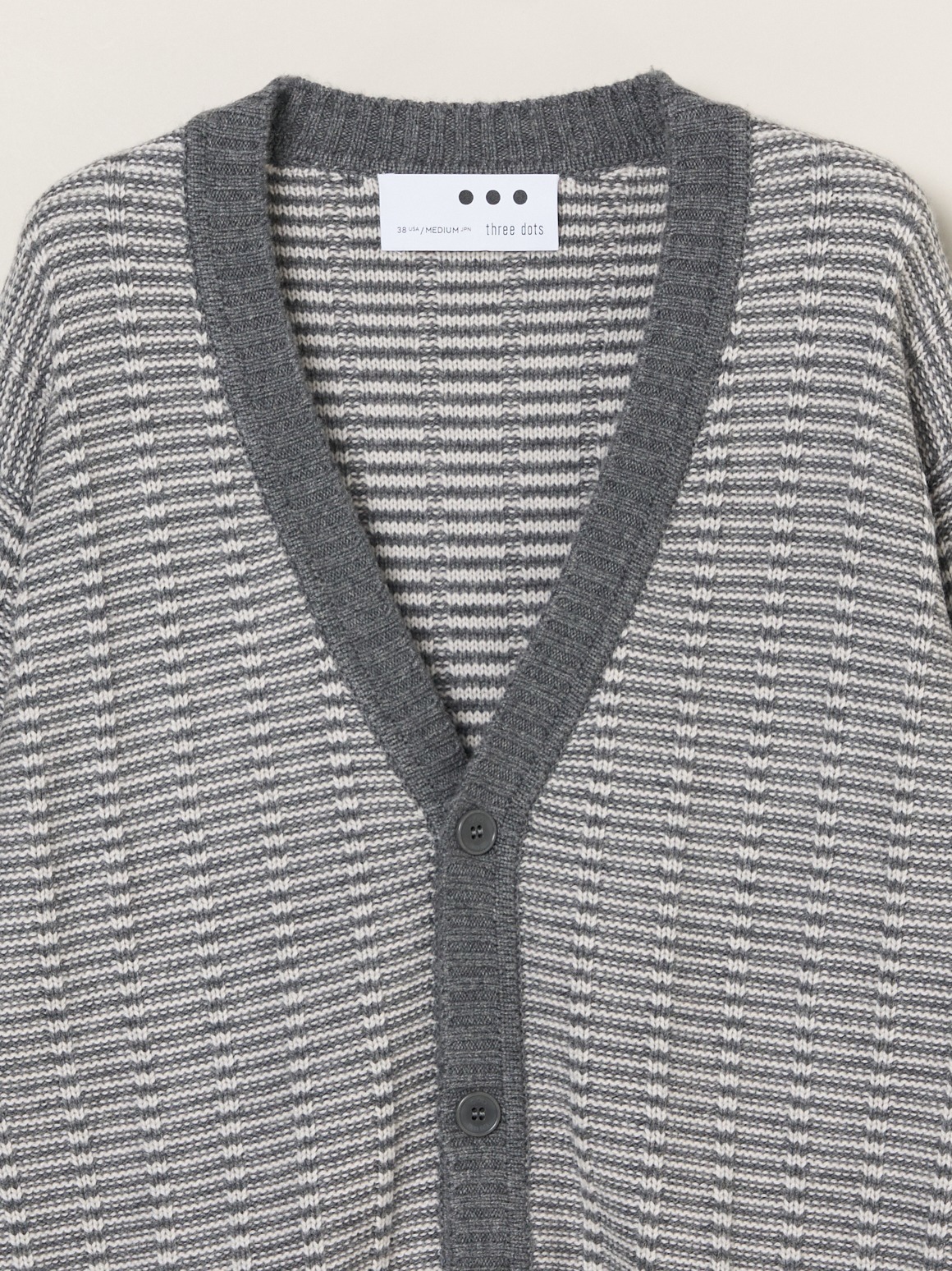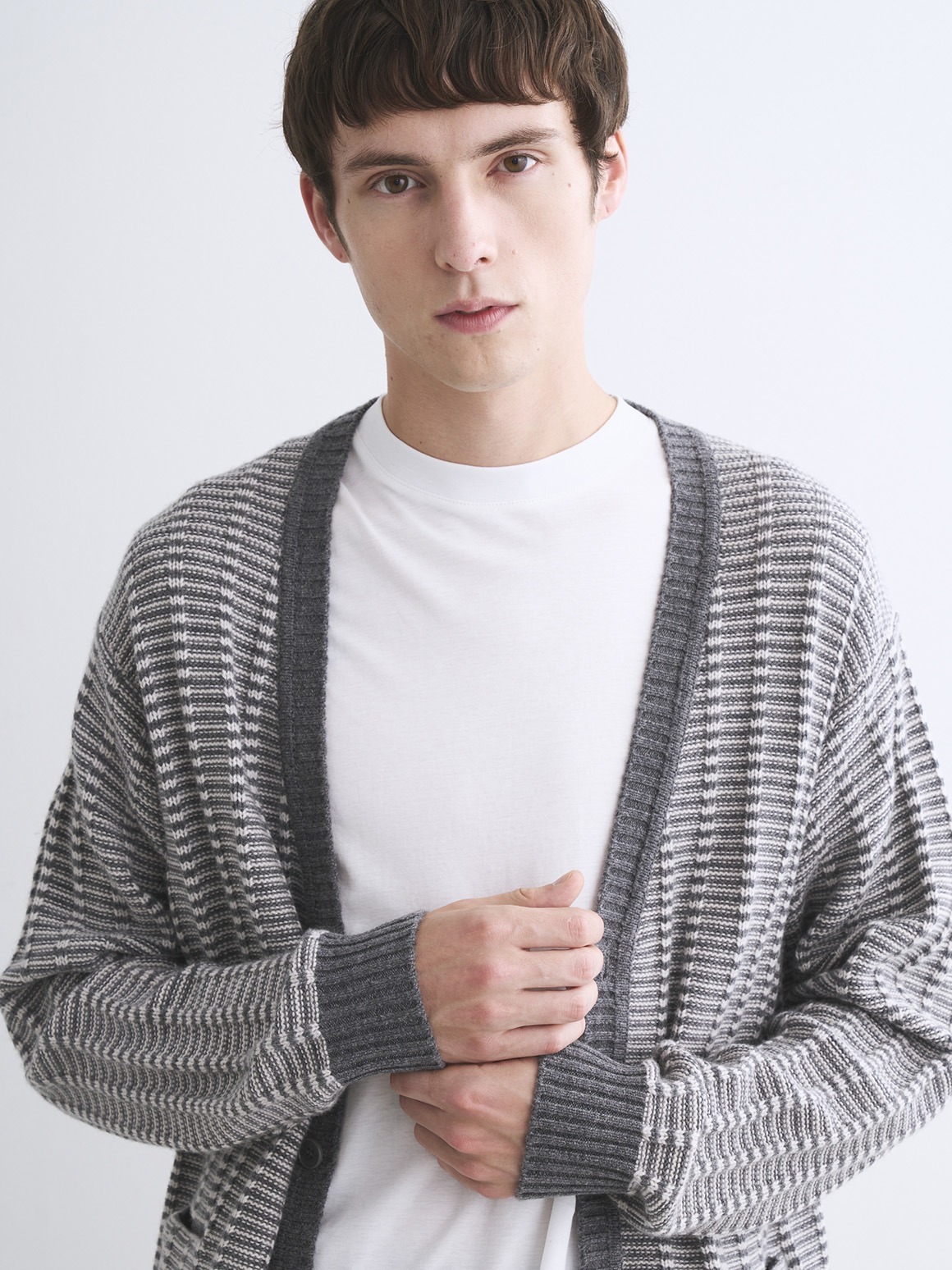 ボーダーの中に縦ストライプが走る模様が特徴で、フワッと軽く着心地の良さが特徴で、Vネックのカーディガンは、シャツやタートルネックとの相性も良く、秋冬のレイヤードスタイルにも活躍する万能アイテムです。