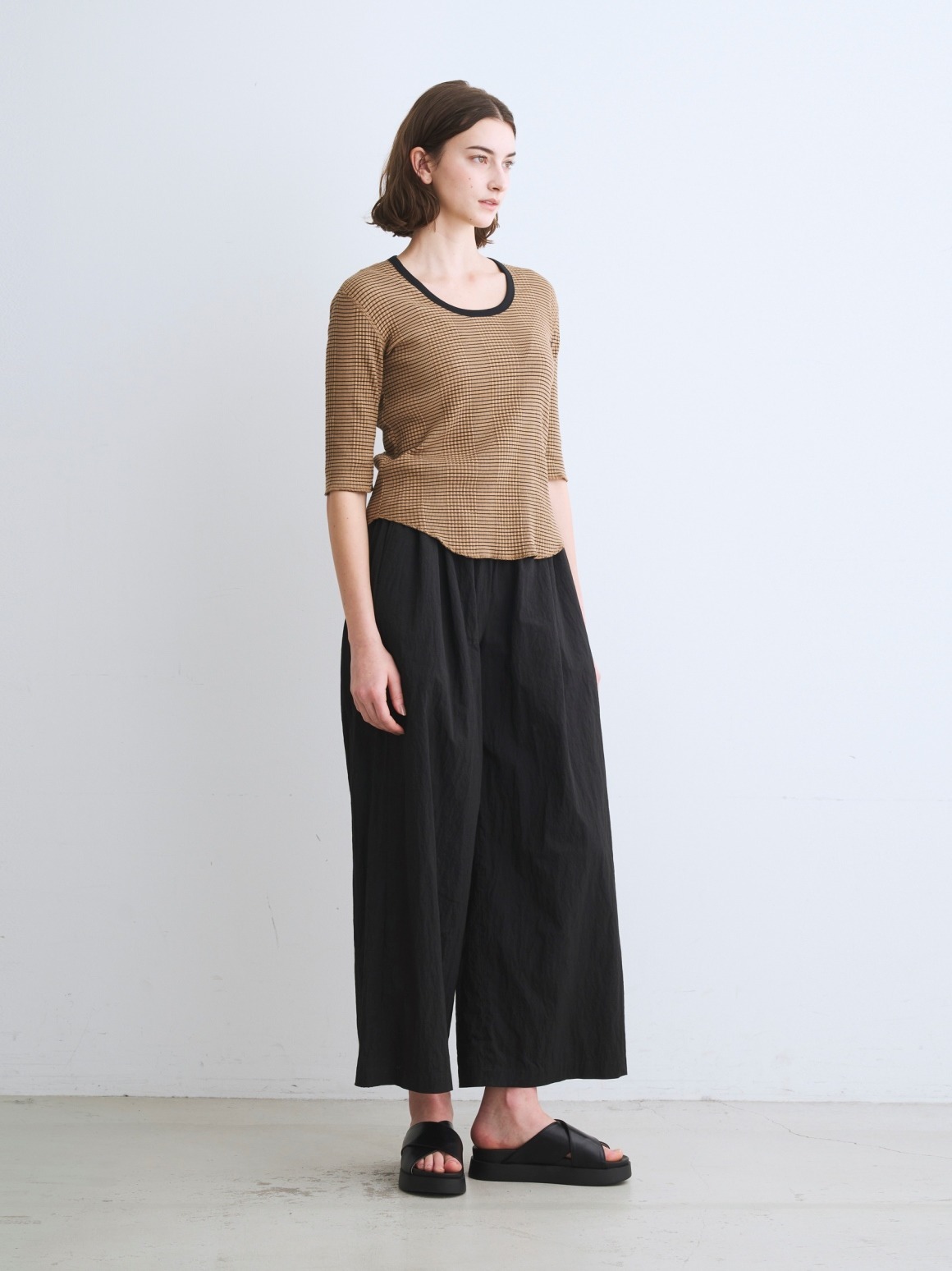 ボーダーでもカジュアル過ぎず、フェミニンにも着こなせます。ネックはジェシカモデルのUライン。ジャストフィットですが、5分袖なのでカバー力も〇。