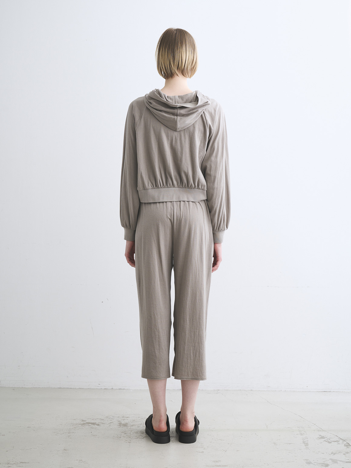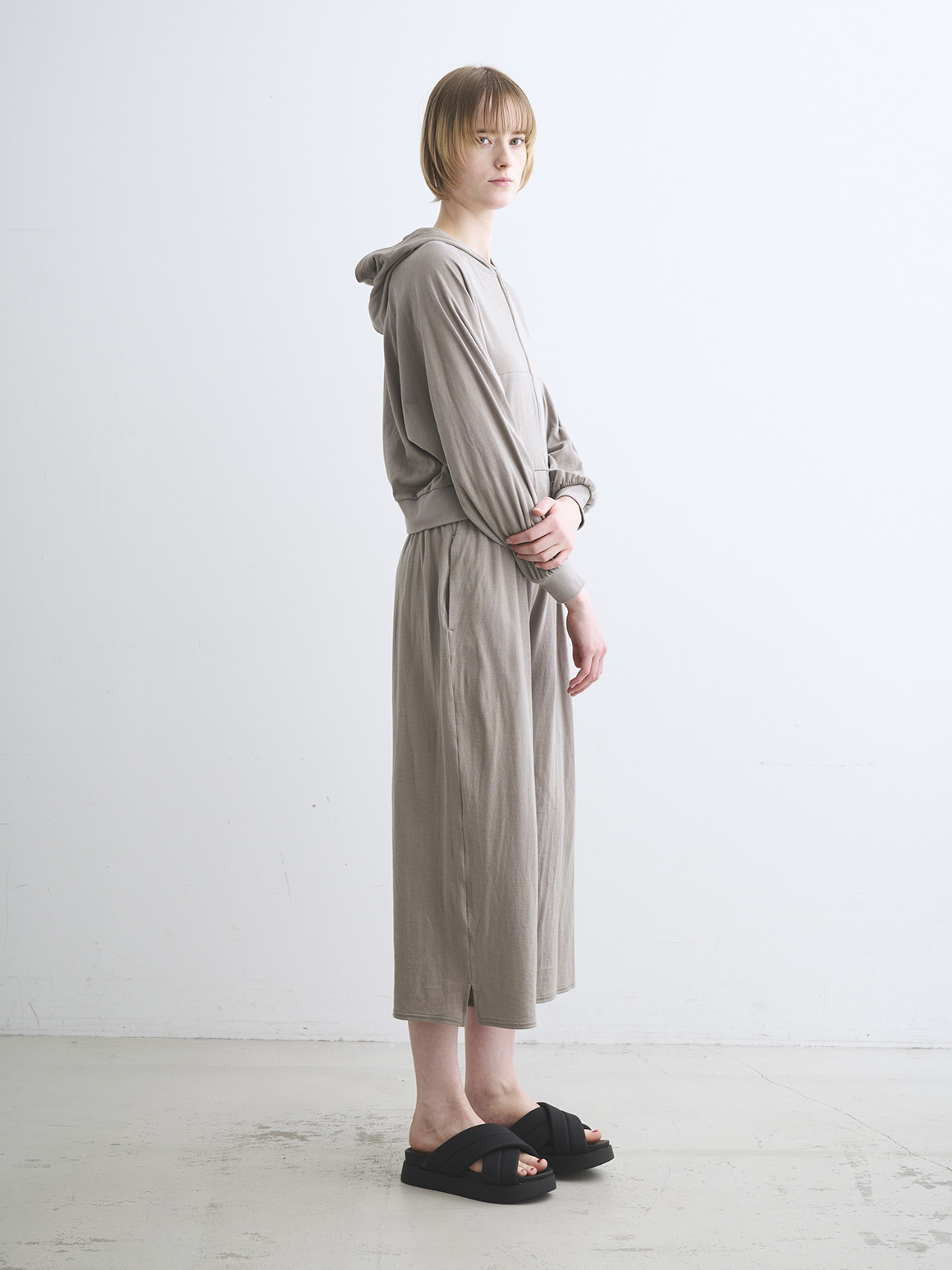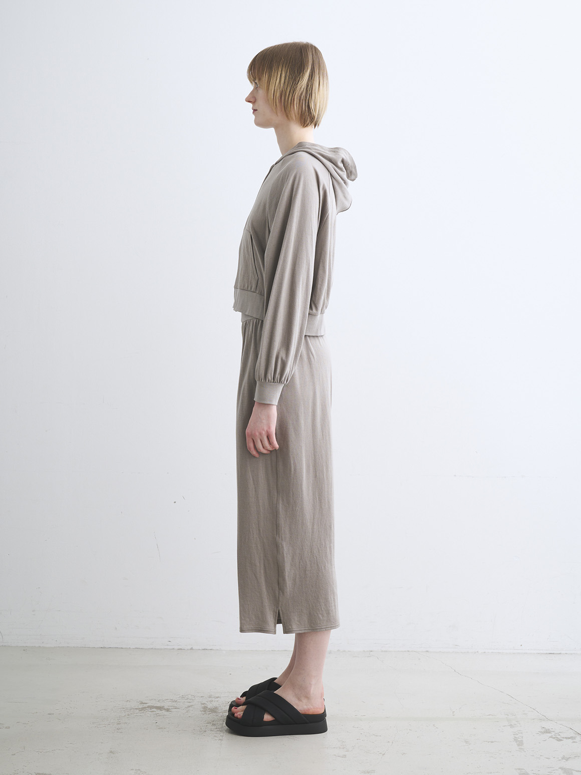 非常に薄い2枚のガーゼを2枚接結した柔らかな素材です。接結仕立てなのでホワイト以外は透け感も気にならずに着用可能。やや短めの着丈でドレスやボリュームの出るボトムス、ワイドパンツとも好相性。
