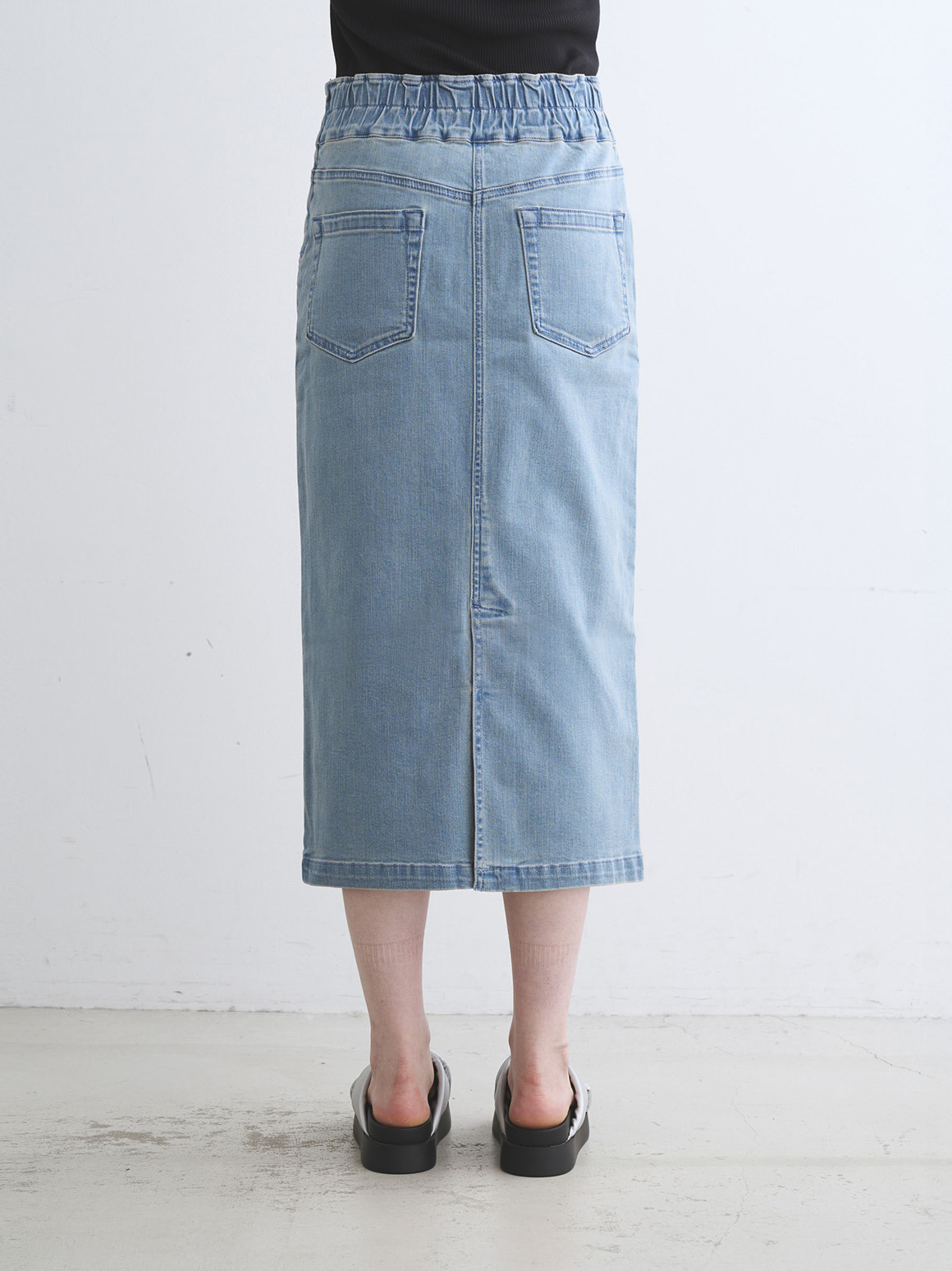 ストレッチデニムを使用したストレートシルエットのミディスカート。