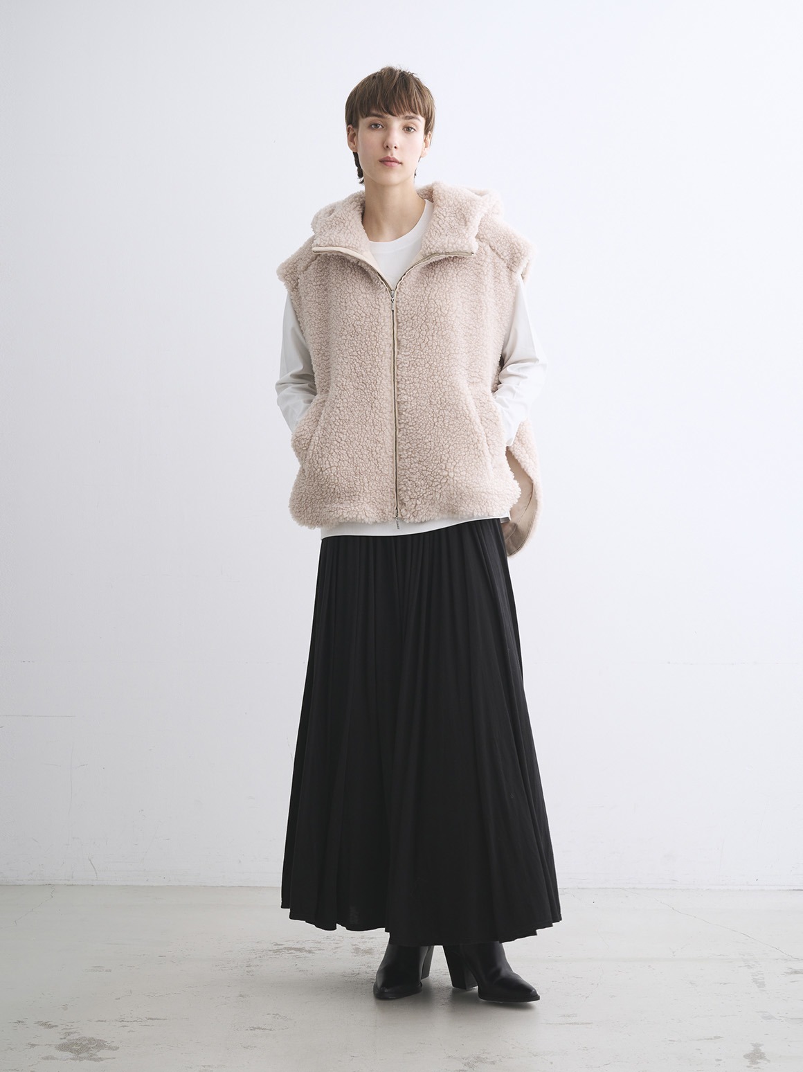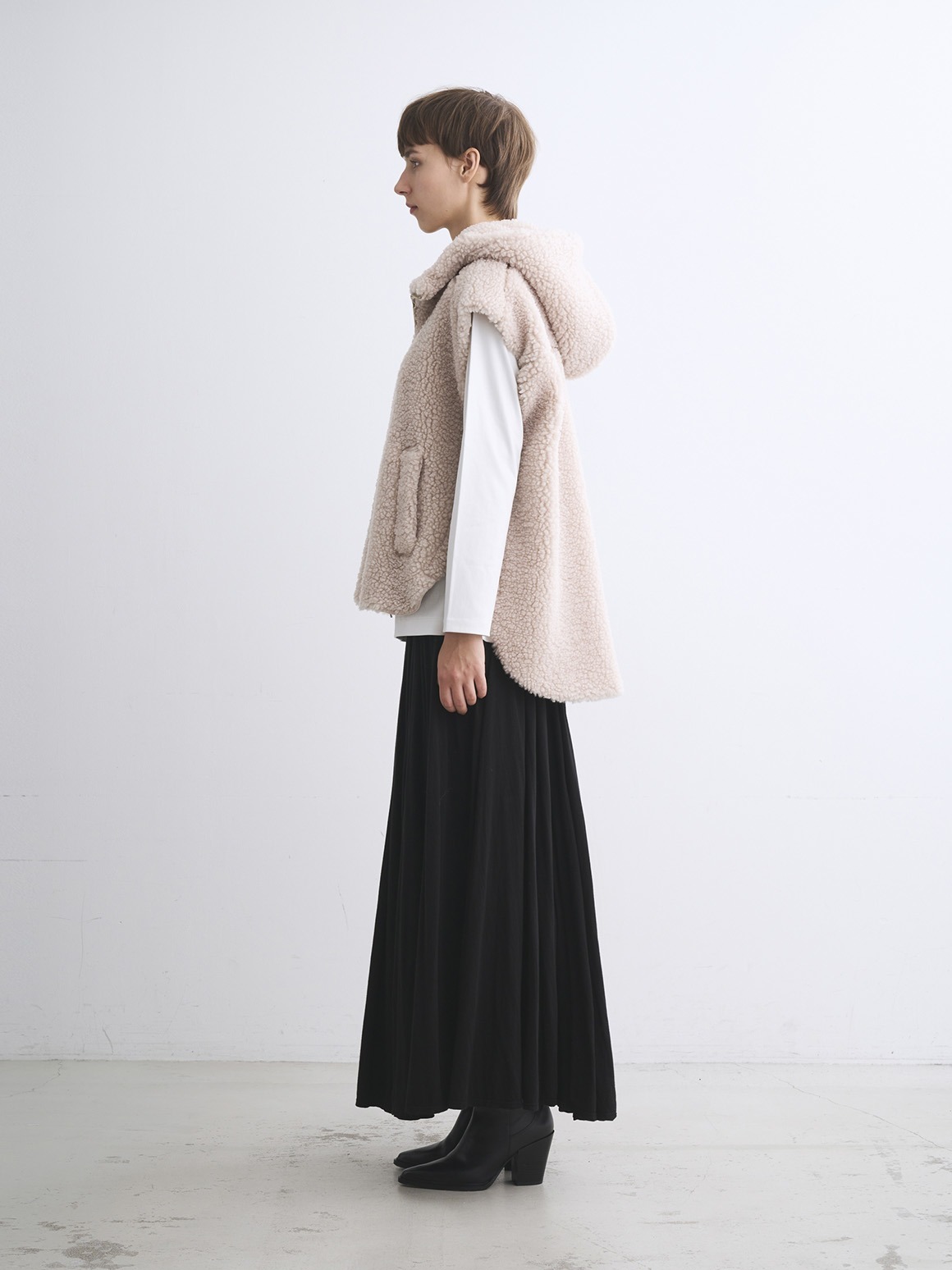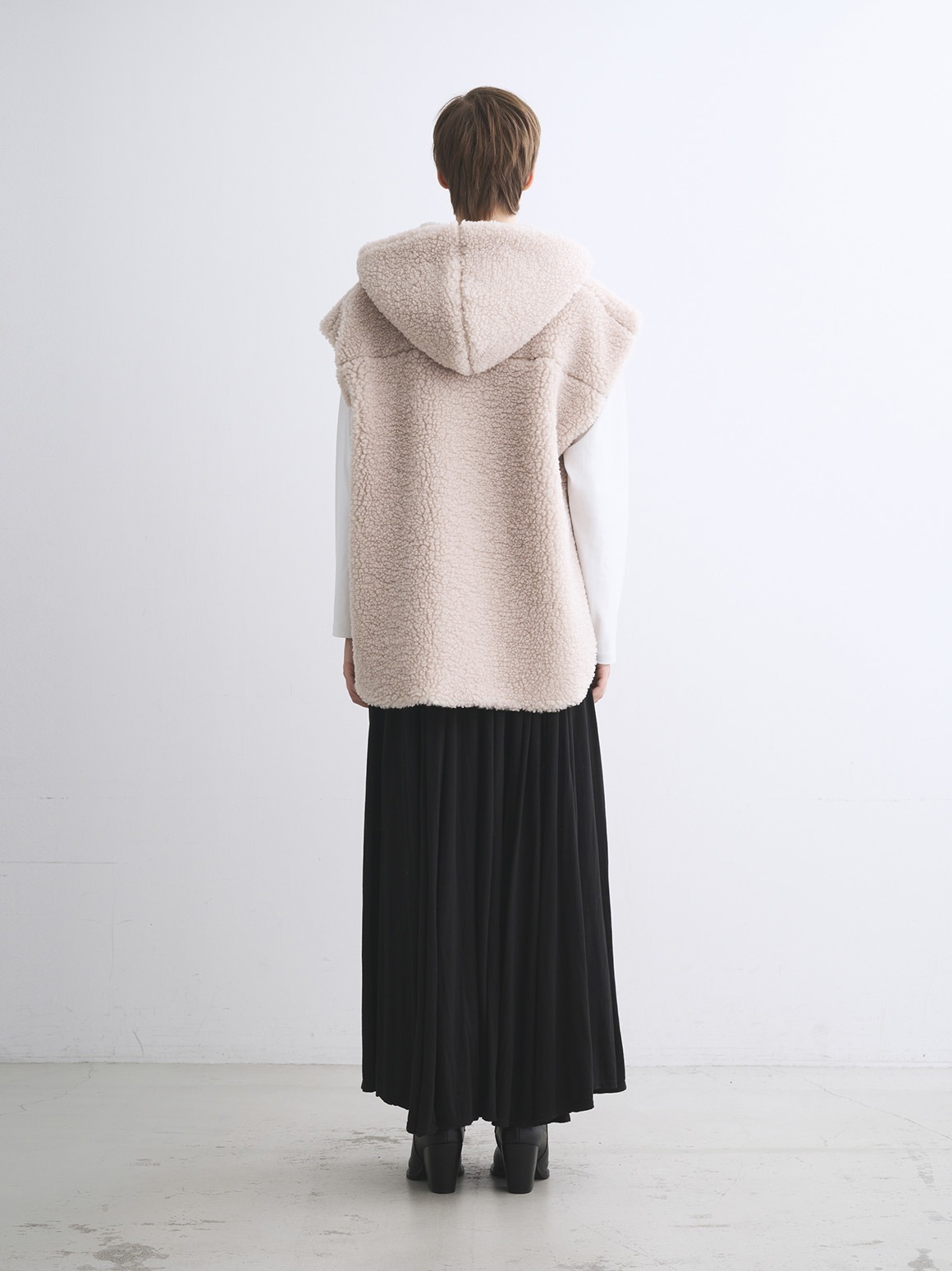 毎シーズン人気のECOPEL社素材のアウター。今季はふんわり大粒のボア。ECOPEL社独自の洗い技術によりクリンプの強いシェルパを表現しています。コットンパフのようなボリューム感と見た目に対して驚きの軽さを実現。大粒ボア素材を2枚仕立てにしたフードは、よりボリュームが出て目を引くポイントに。サイドのスナップは取り外しができ、スリットを深くできるほか、一番上のスナップを開ければ太い袖のニットやジャンパーをインにすることも。すべて開けてベルトなどでウエストを絞るアレンジも可能です。ヒップまで覆う長め丈、肩を覆うデザインでベストでも防寒力が高く、インナーアウターを合わせればシーズン通して活躍。同素材のブルゾン、ロングコート、バッグも展開しています。
