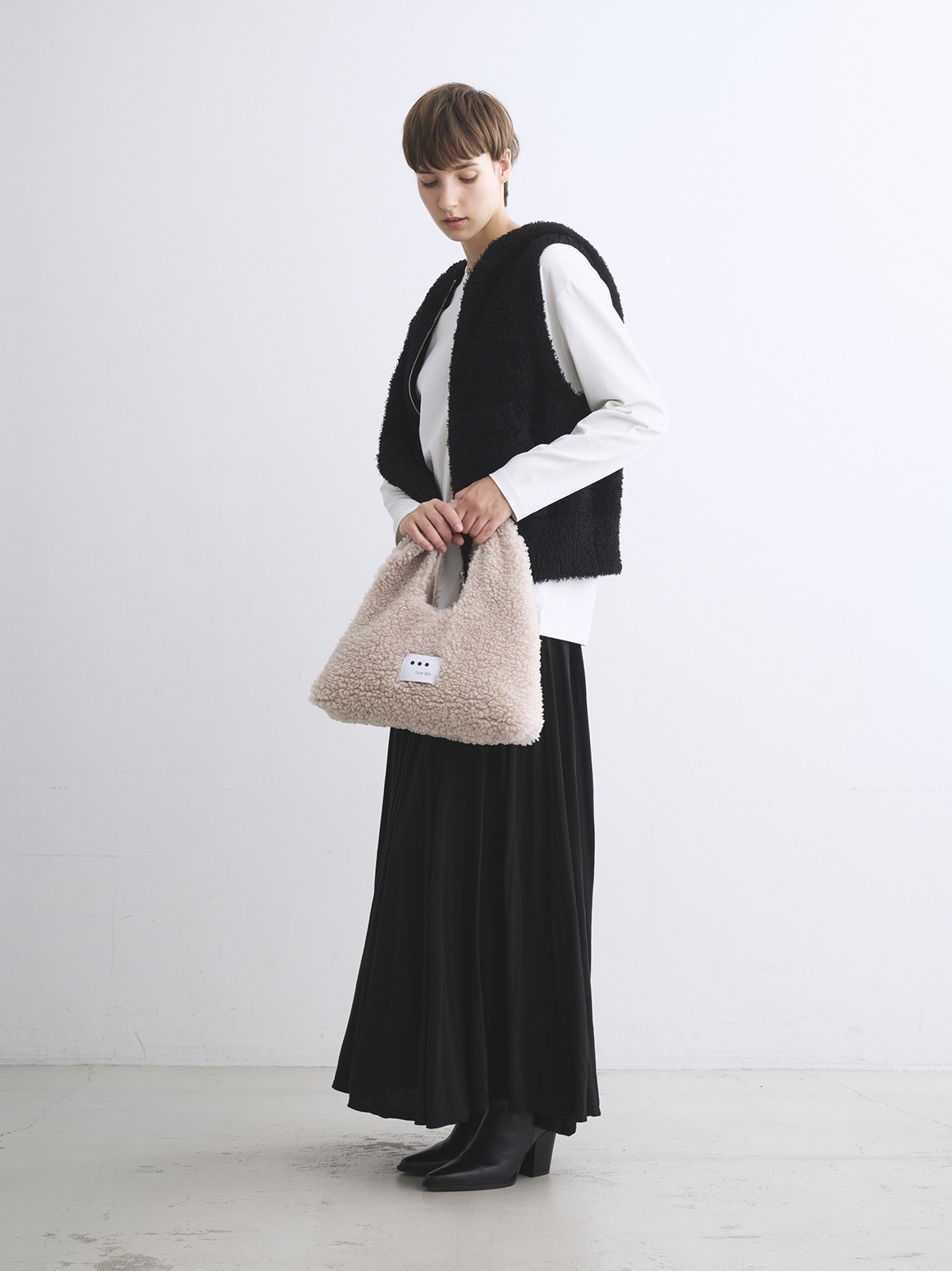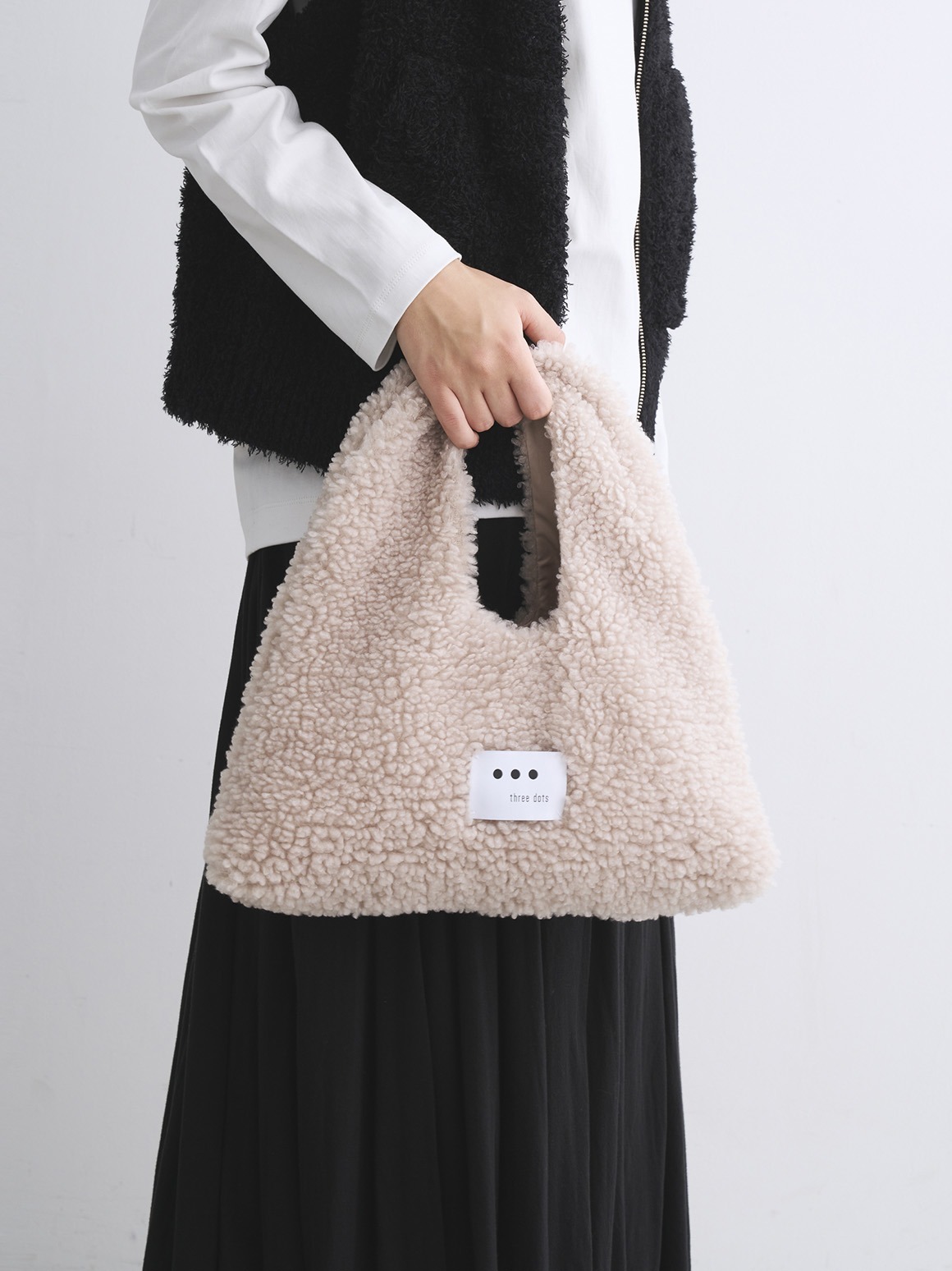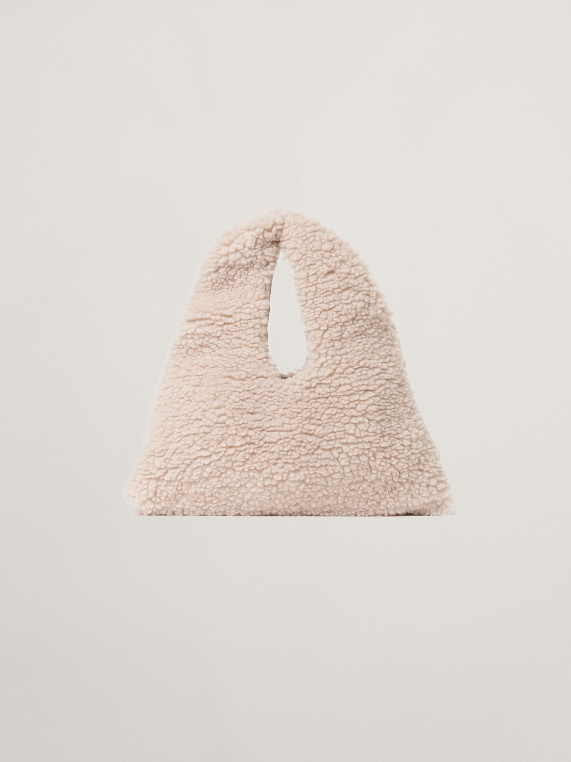 ECOPEL社のボア素材を使用したトライアングルバッグ。キャッチーな形にふわふわとした質感は持つだけで秋冬ムードが盛り上がりそう。ホリデーシーズンのギフトにも最適です。
