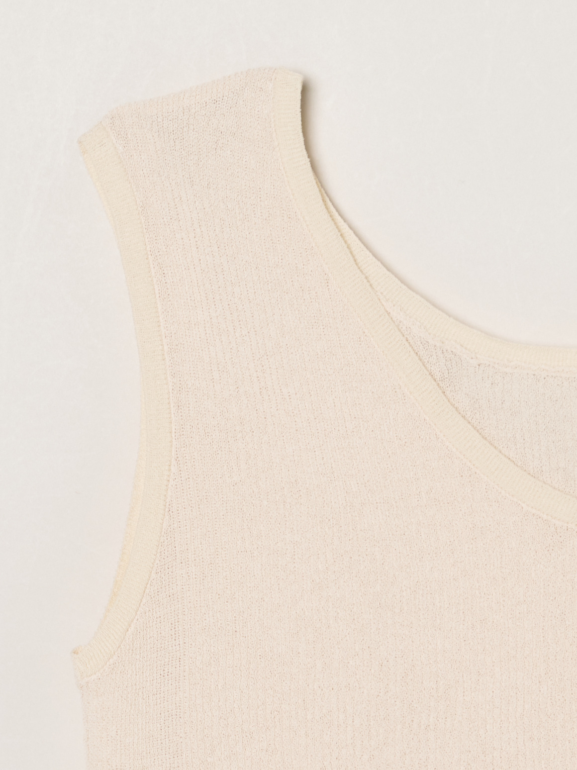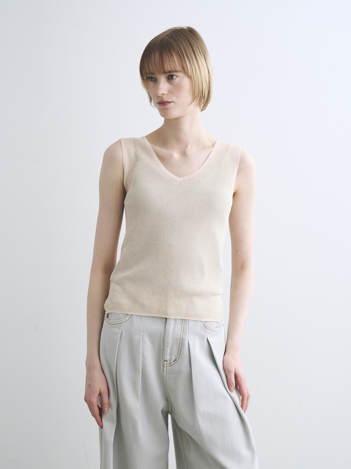 シアーニットで仕立てた、着回し力の高いニットタンク。すっきりとしたシルエットでレイヤードしやすく、シアートップスやジャケットのインナーとしても活躍。