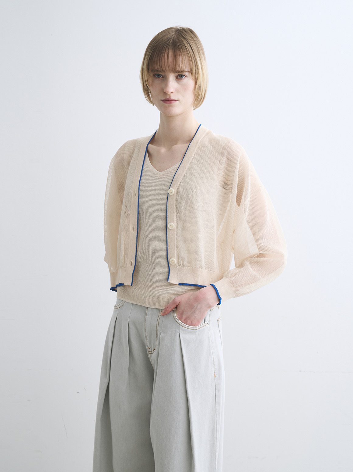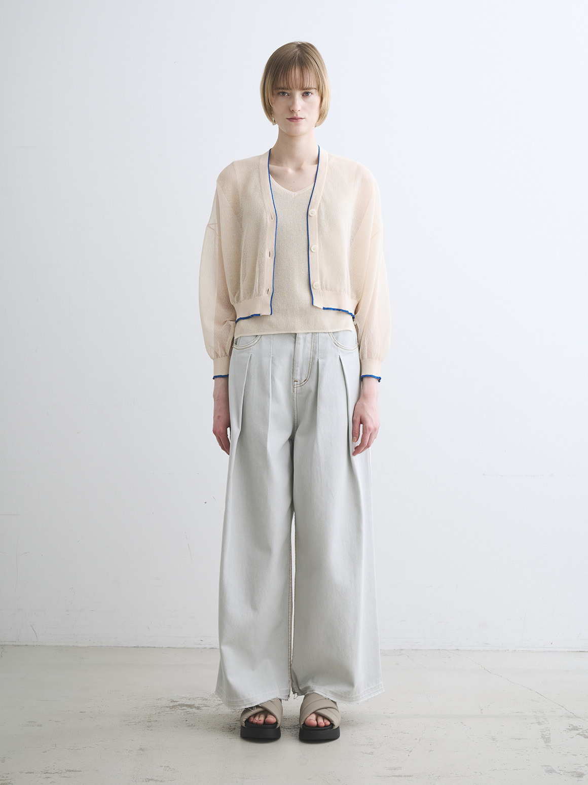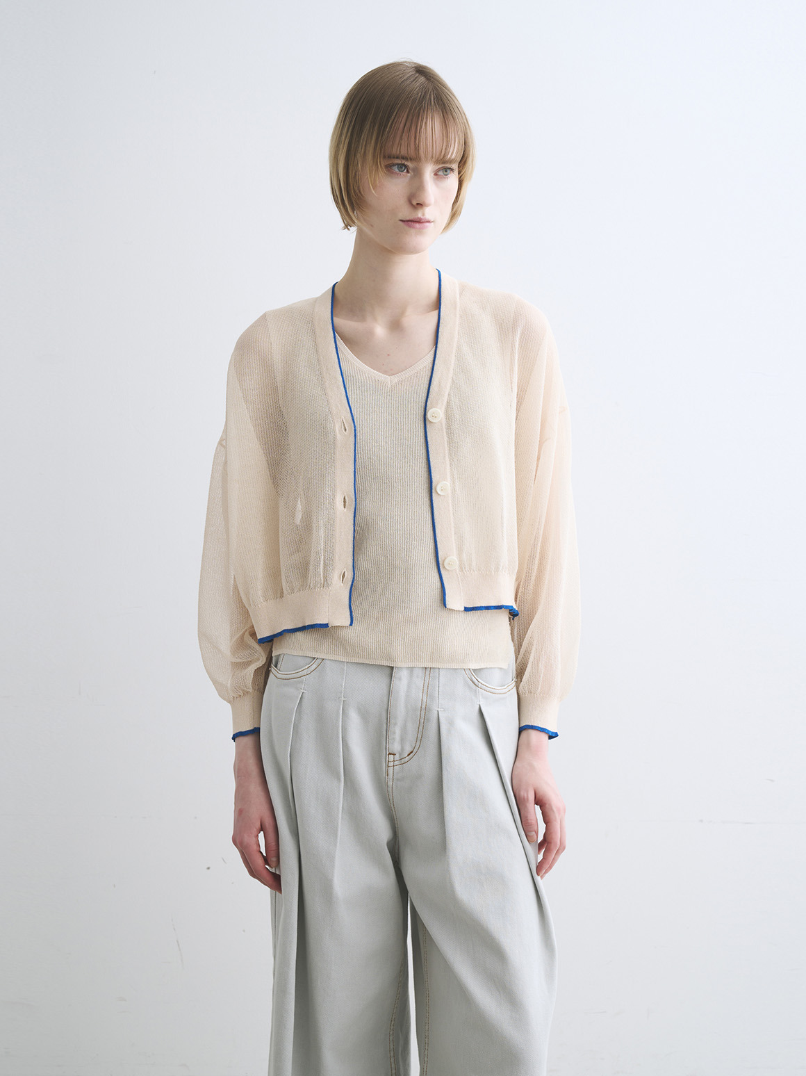 短めの丈感が全体のバランスを引き締め、軽やかな印象に仕上げています。同素材のニットタンク(EO0001Y)と合わせればアンサンブルで着用可能。透明感を保ちながら透け感を抑えられるおすすめのスタイリングです。