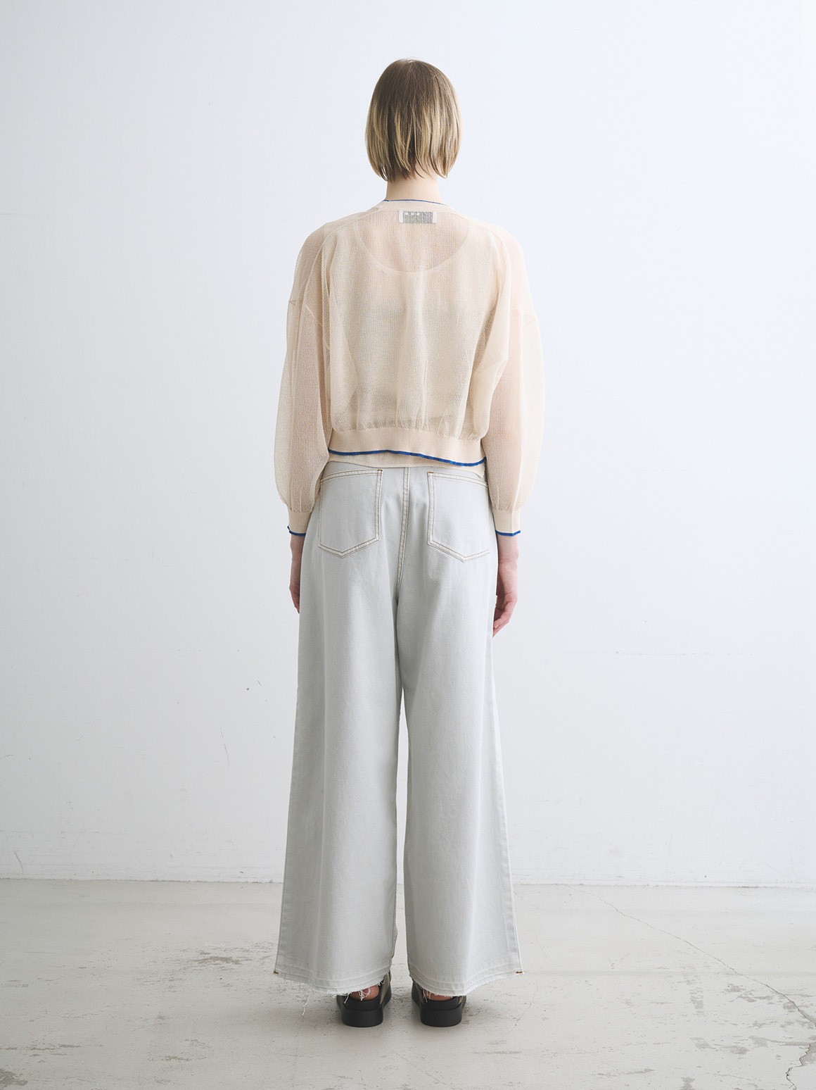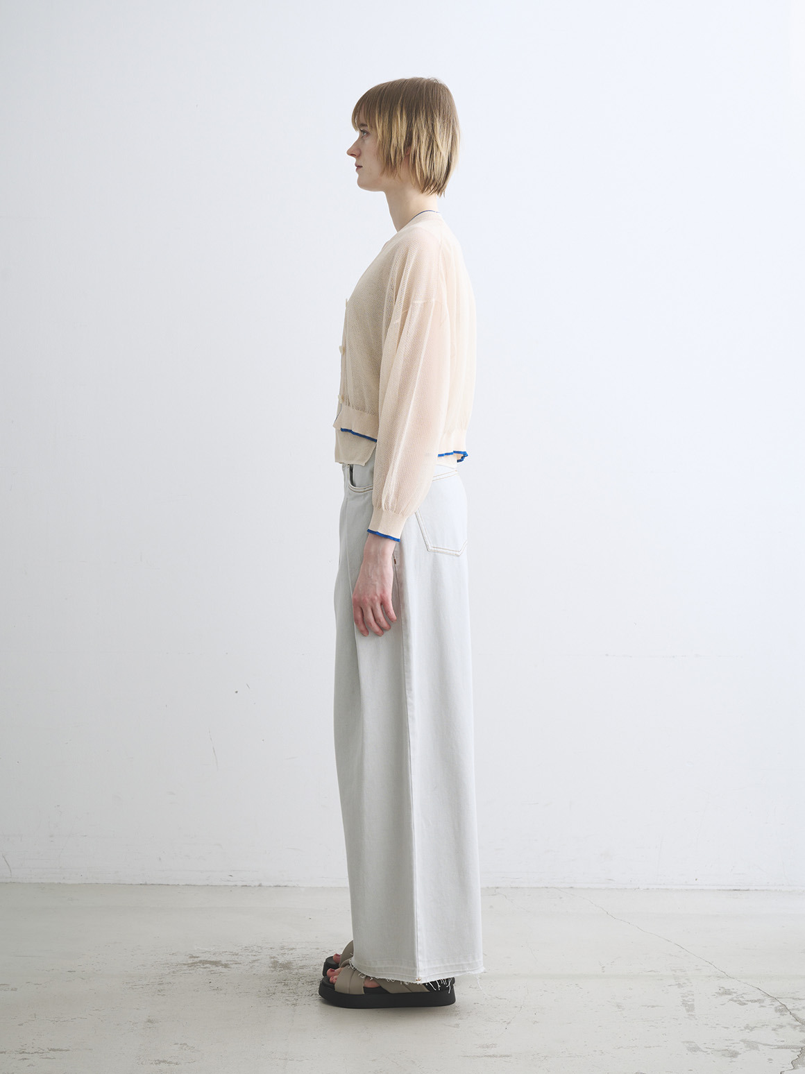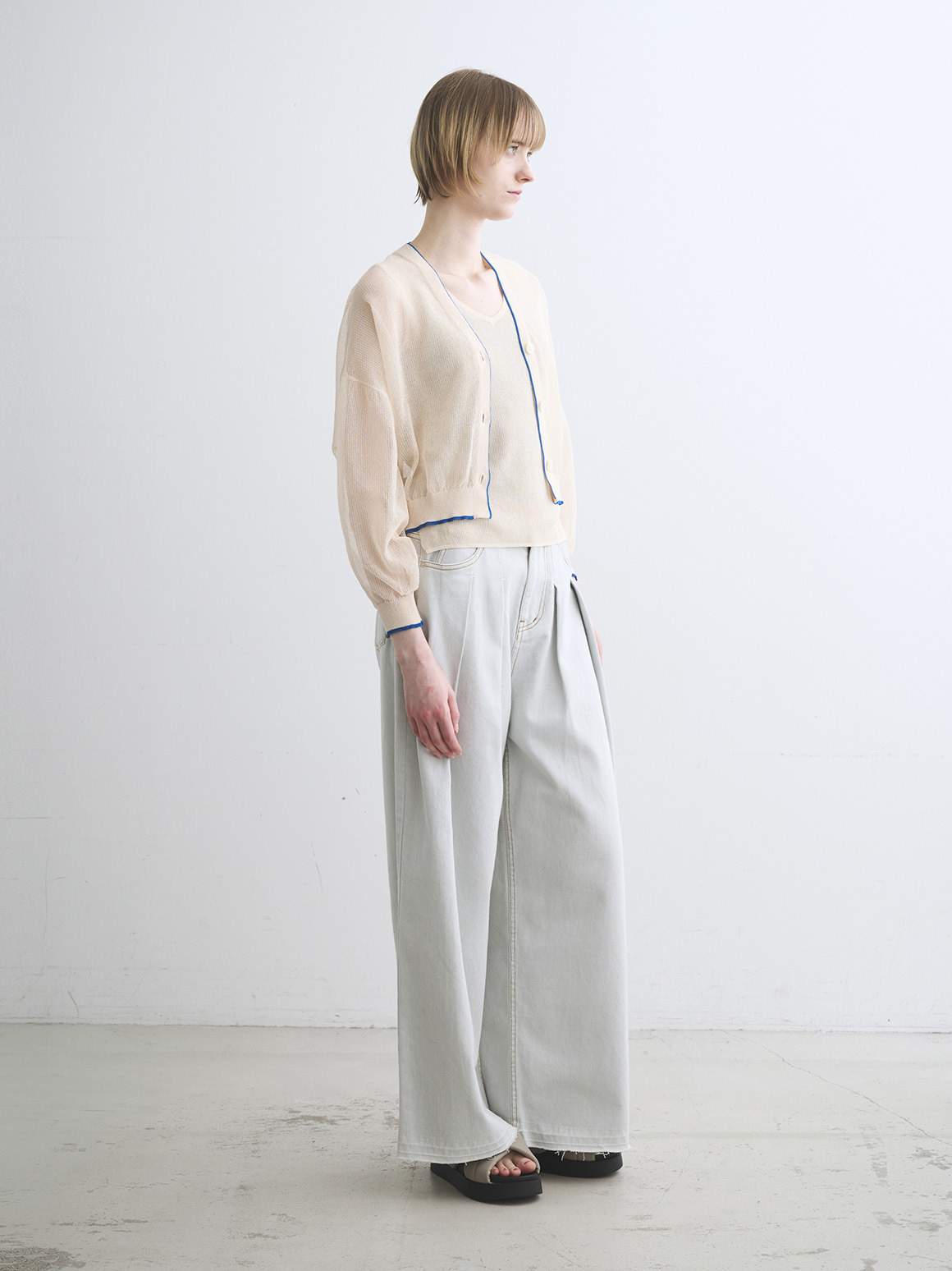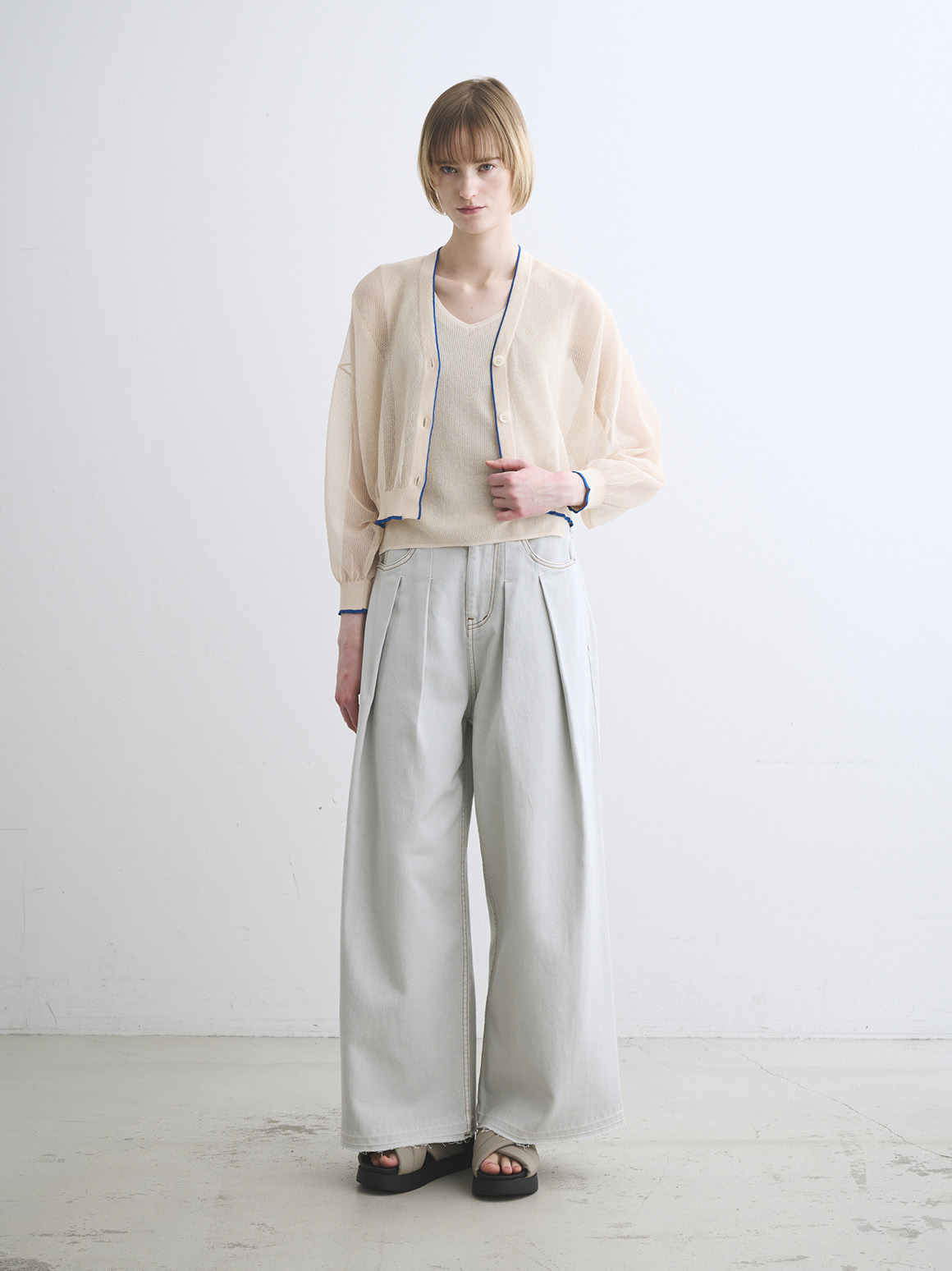 短めの丈感が全体のバランスを引き締め、軽やかな印象に仕上げています。同素材のニットタンク(EO0001Y)と合わせればアンサンブルで着用可能。透明感を保ちながら透け感を抑えられるおすすめのスタイリングです。