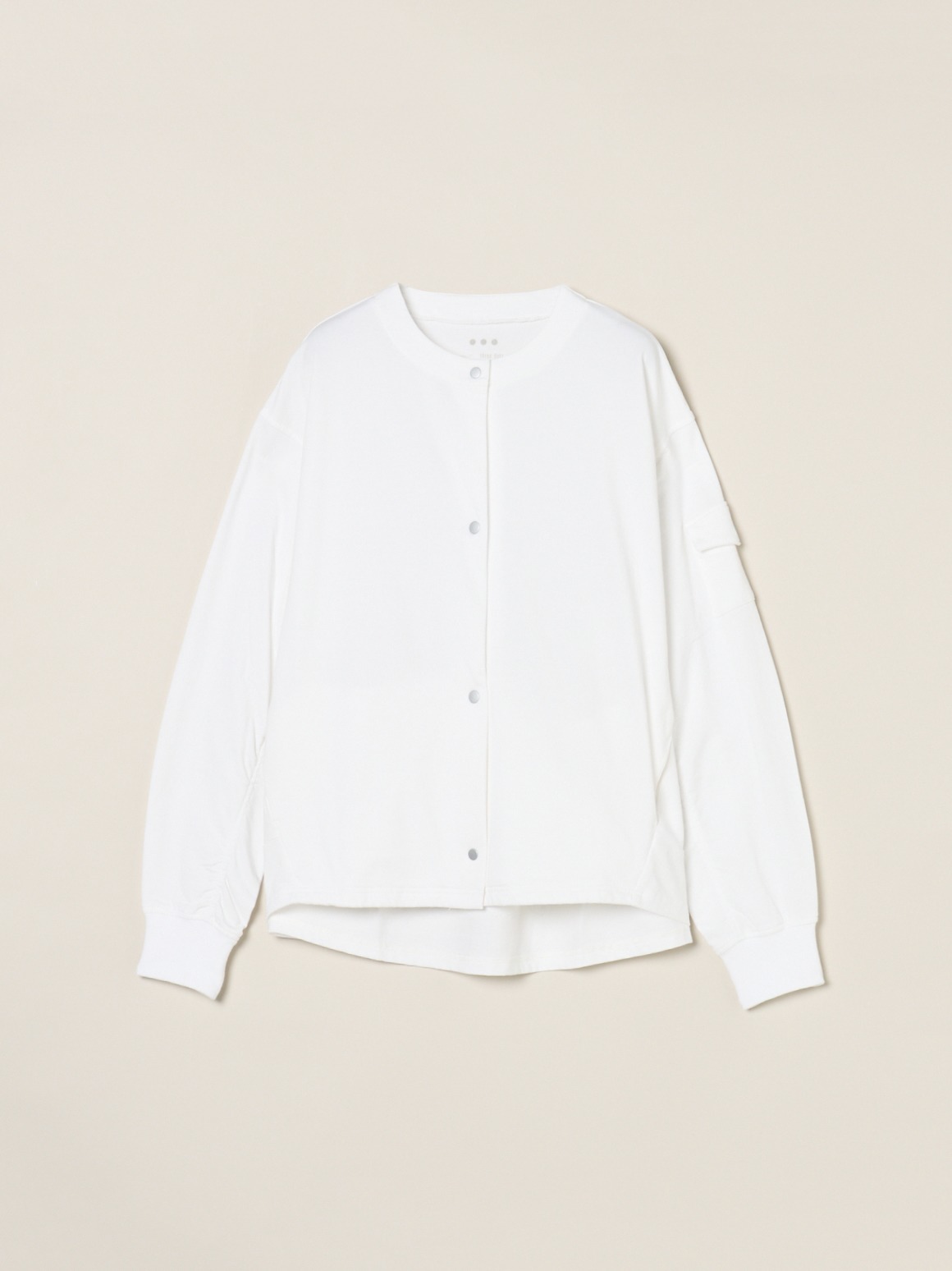 カーブを描くスリーブに、ミニポケットがアクセント。程よい厚みで、軽やかさと安心感を両立。