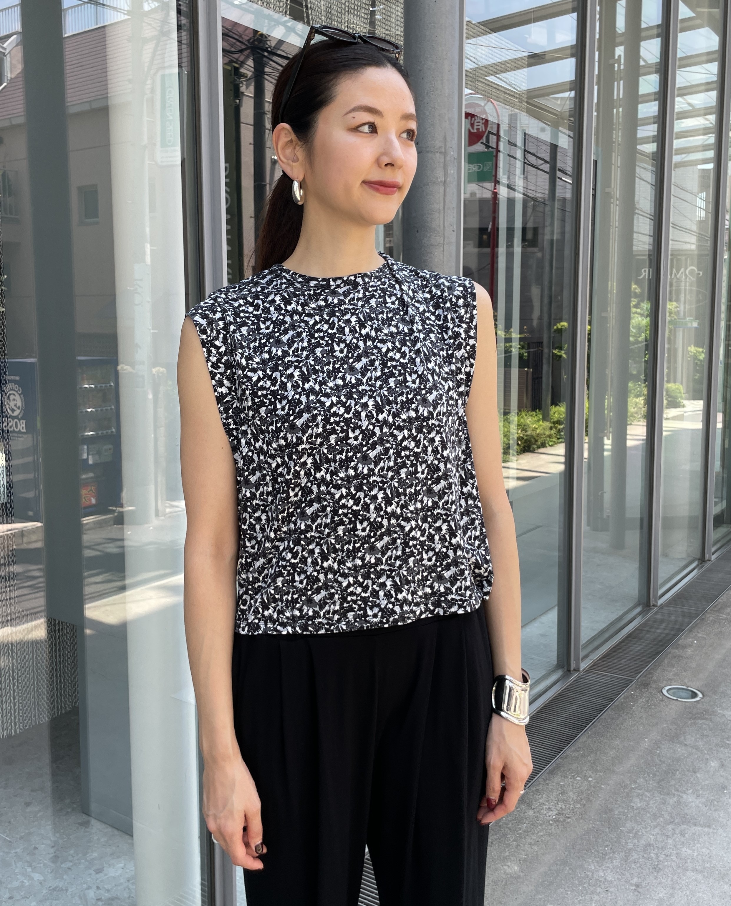 トップスはさりげなくショルダーを覆うスリーブレス。肩周りがシャープに、上半身をコンパクトに見せるデザインです。