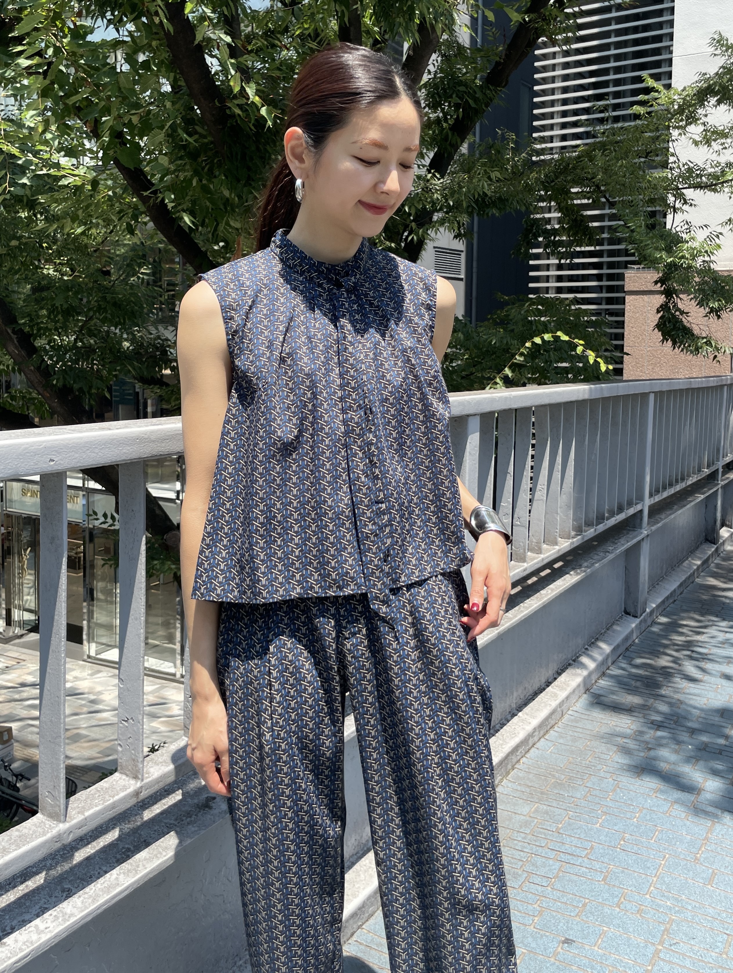 ブルーやブラックのカラーが入った幾何学プリントと、無地タイプの展開。同シリーズでのセットアップはもちろん、コットンローンシリーズともコーディネートしやすく、幅広い着こなしができそう。