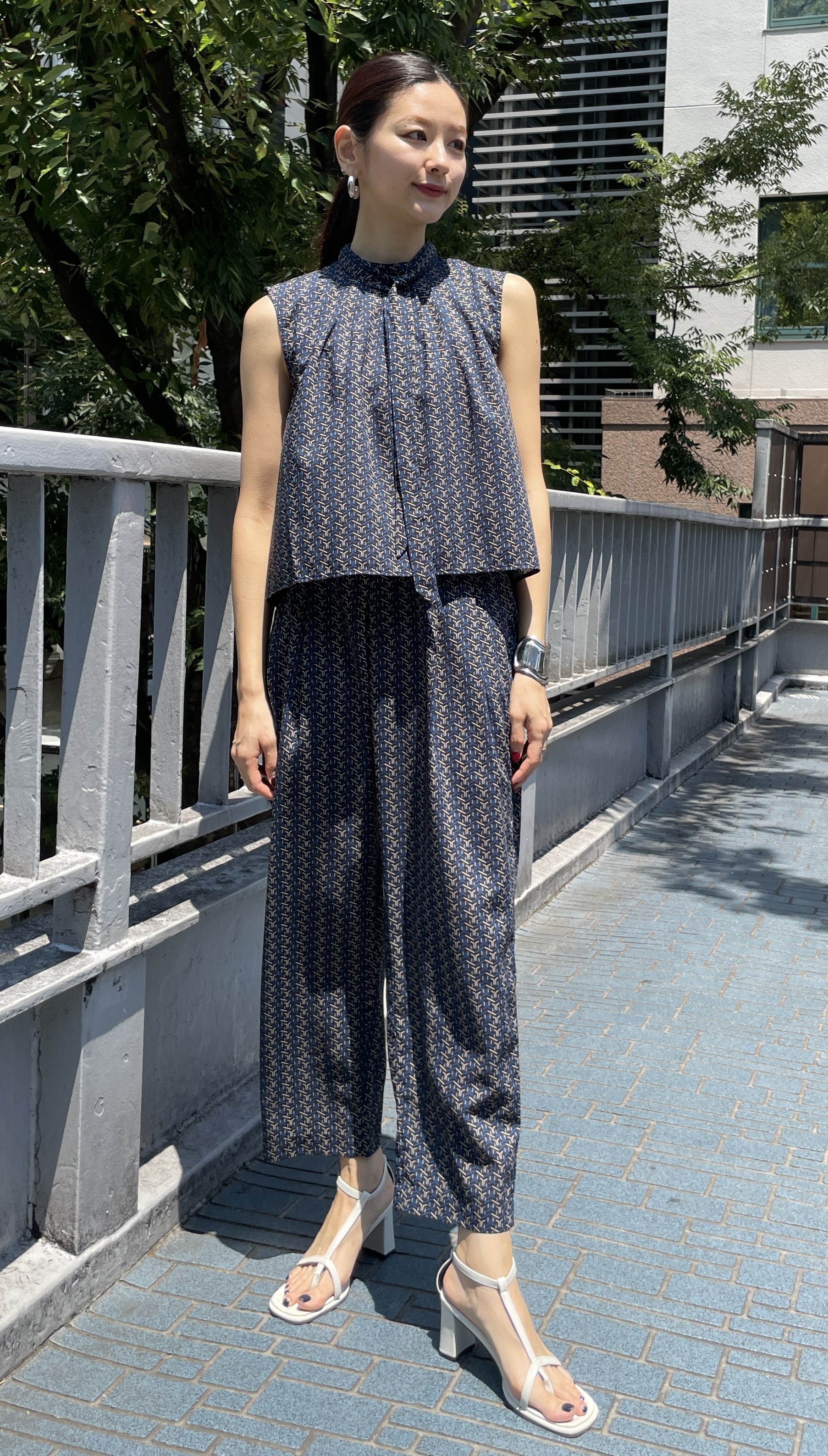 ブルーやブラックのカラーが入った幾何学プリントと、無地タイプの展開。同シリーズでのセットアップはもちろん、コットンローンシリーズともコーディネートしやすく、幅広い着こなしができそう。
