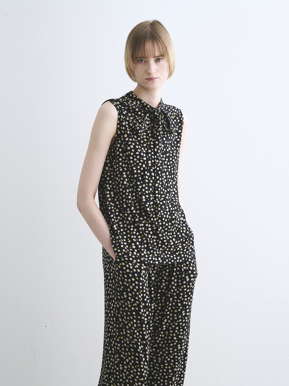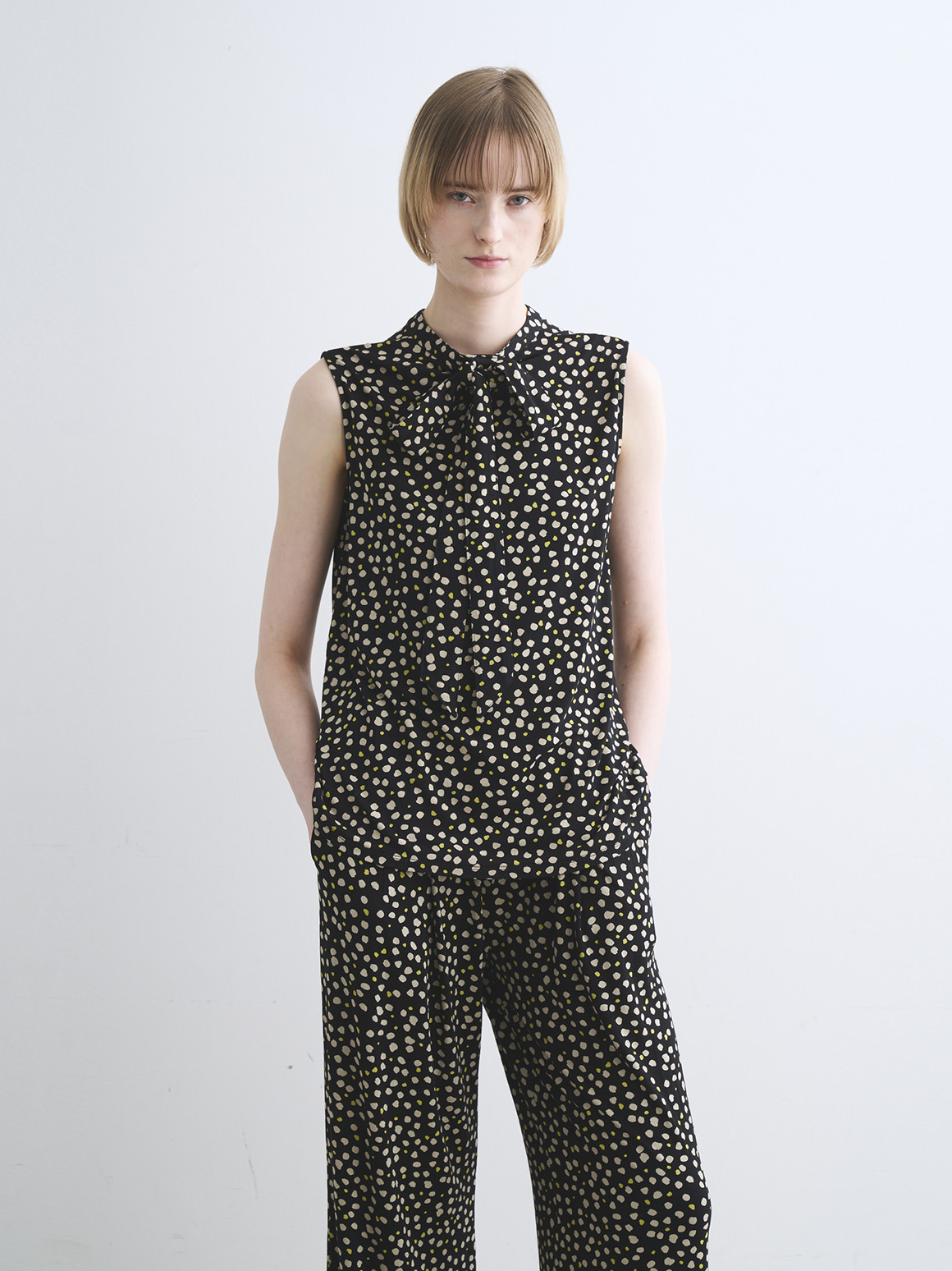 取り外し可能なボウタイが付いたトップスはパンツコーデならハンサムに、スカートコーデならエレガントに、と印象のふり幅が広いのが特徴。首回りにポイントが来ることで全体のバランスもアップ。