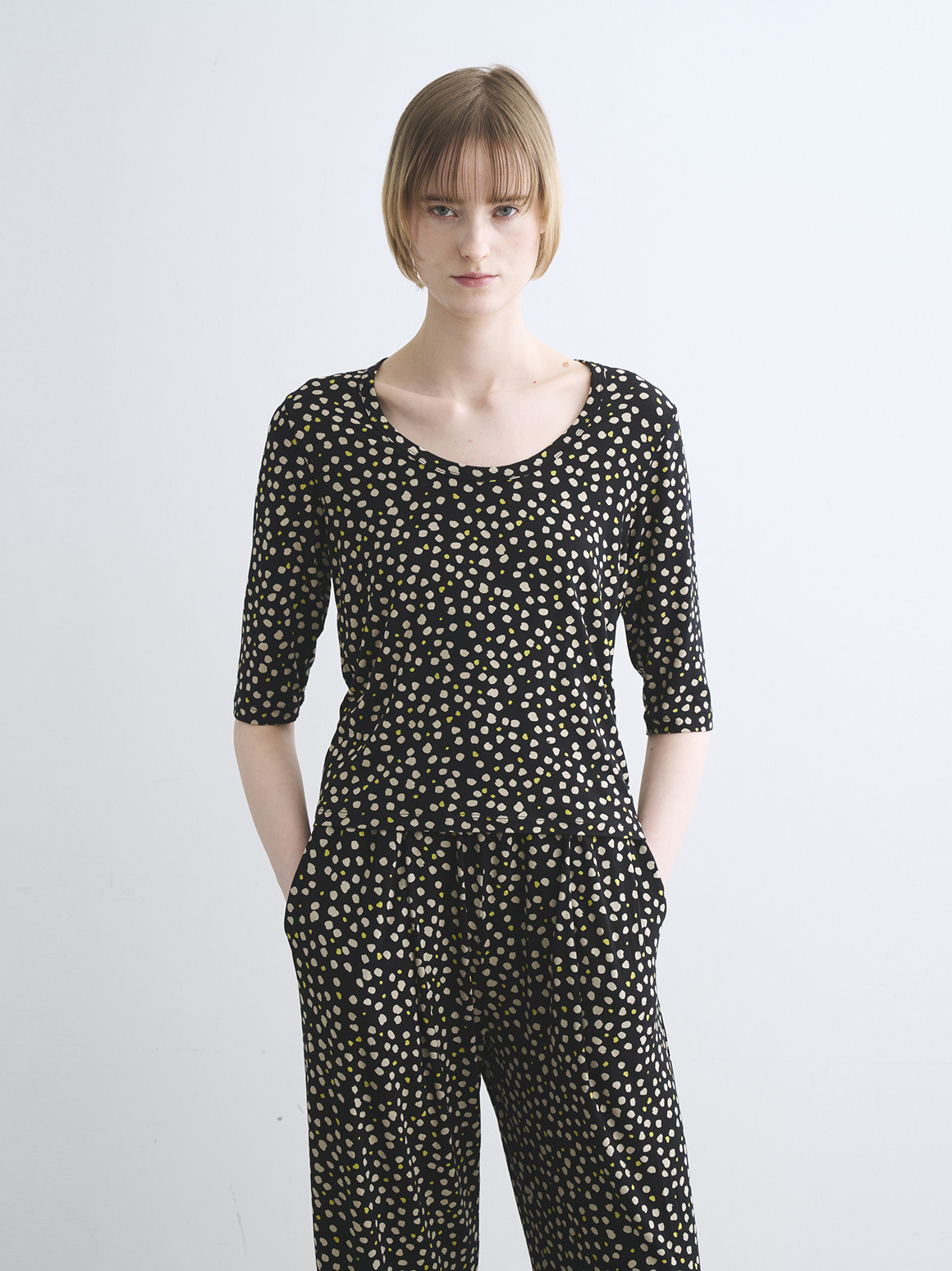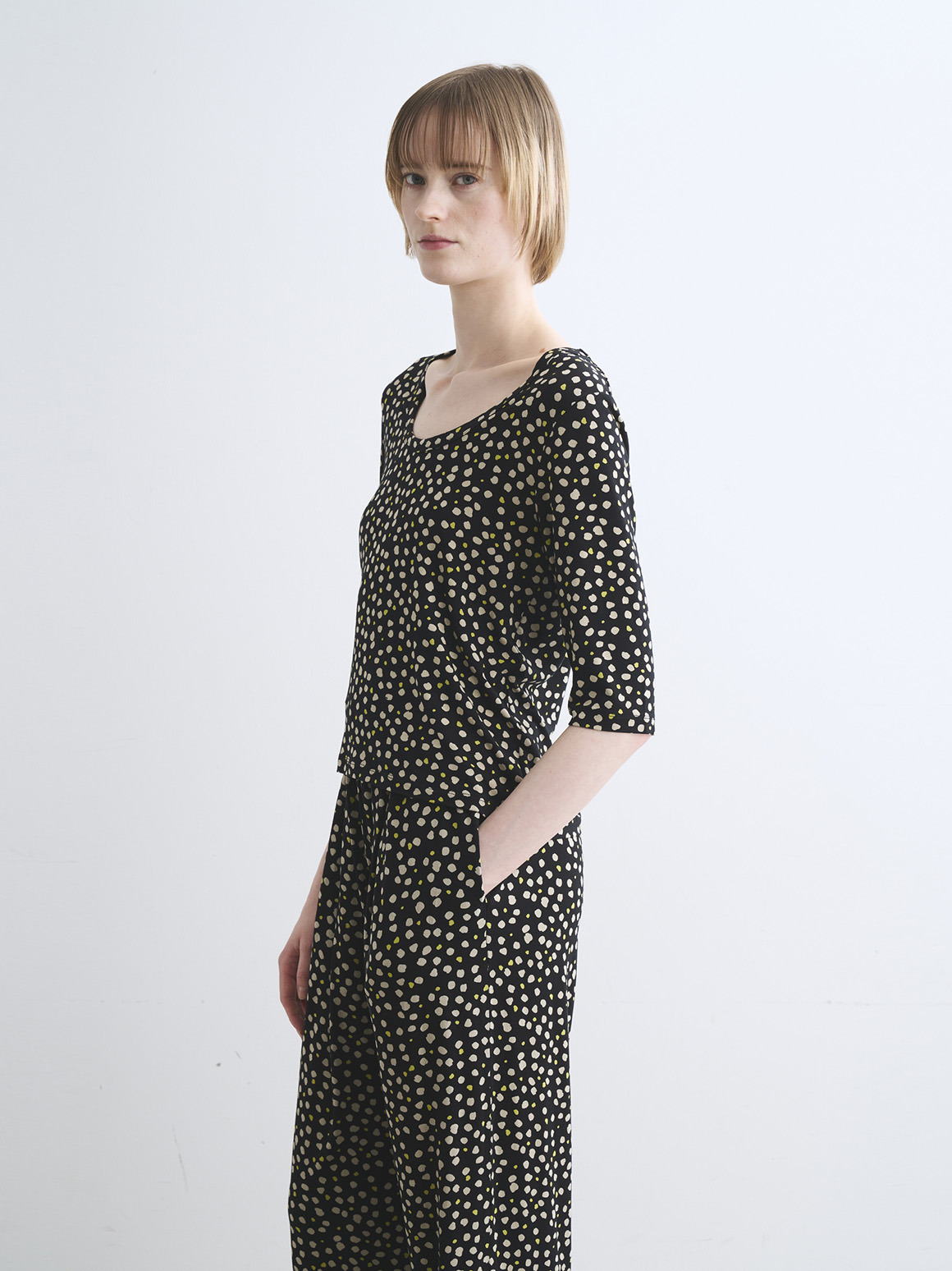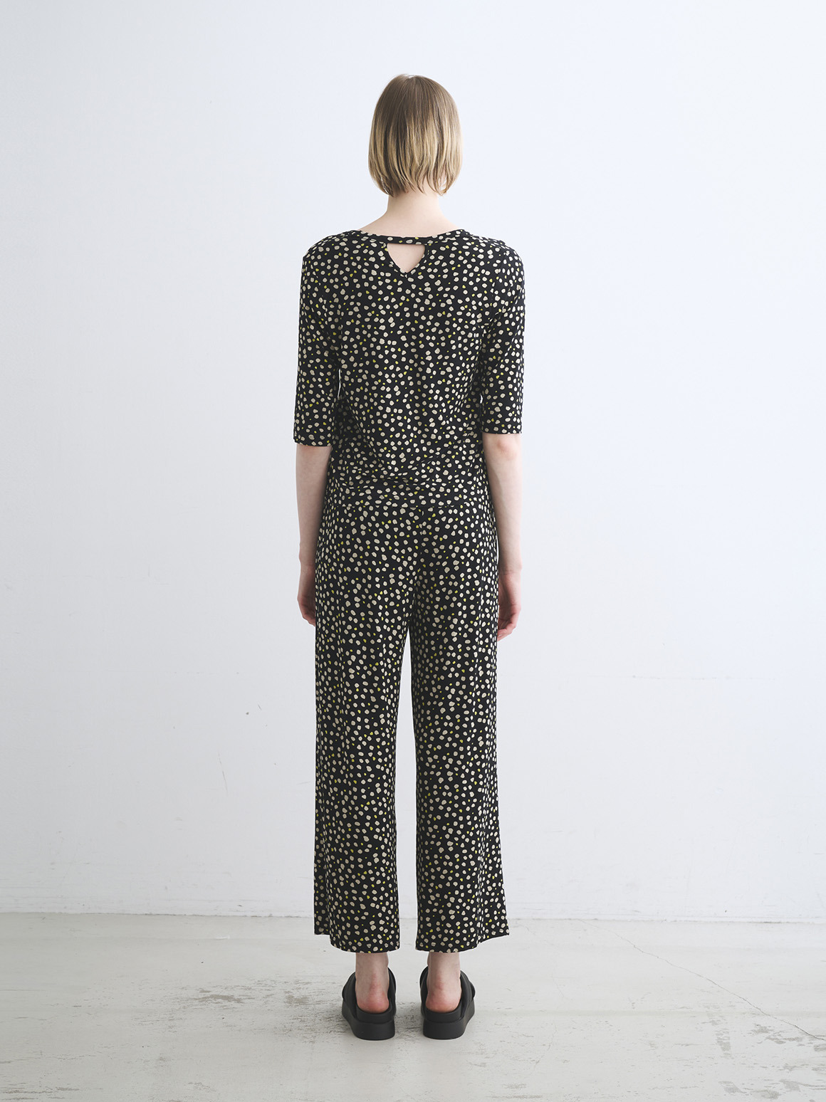 JESSICAトップスはボクシーなジャスト丈にハーフスリーブの使い勝手の良い形。バックのトライアングル開きが後ろ姿のポイントとなり、シンプルな無地でもニュアンスがもたらされます。プリントでのJESSICAも初登場なので新鮮なスタイリングが可能に。