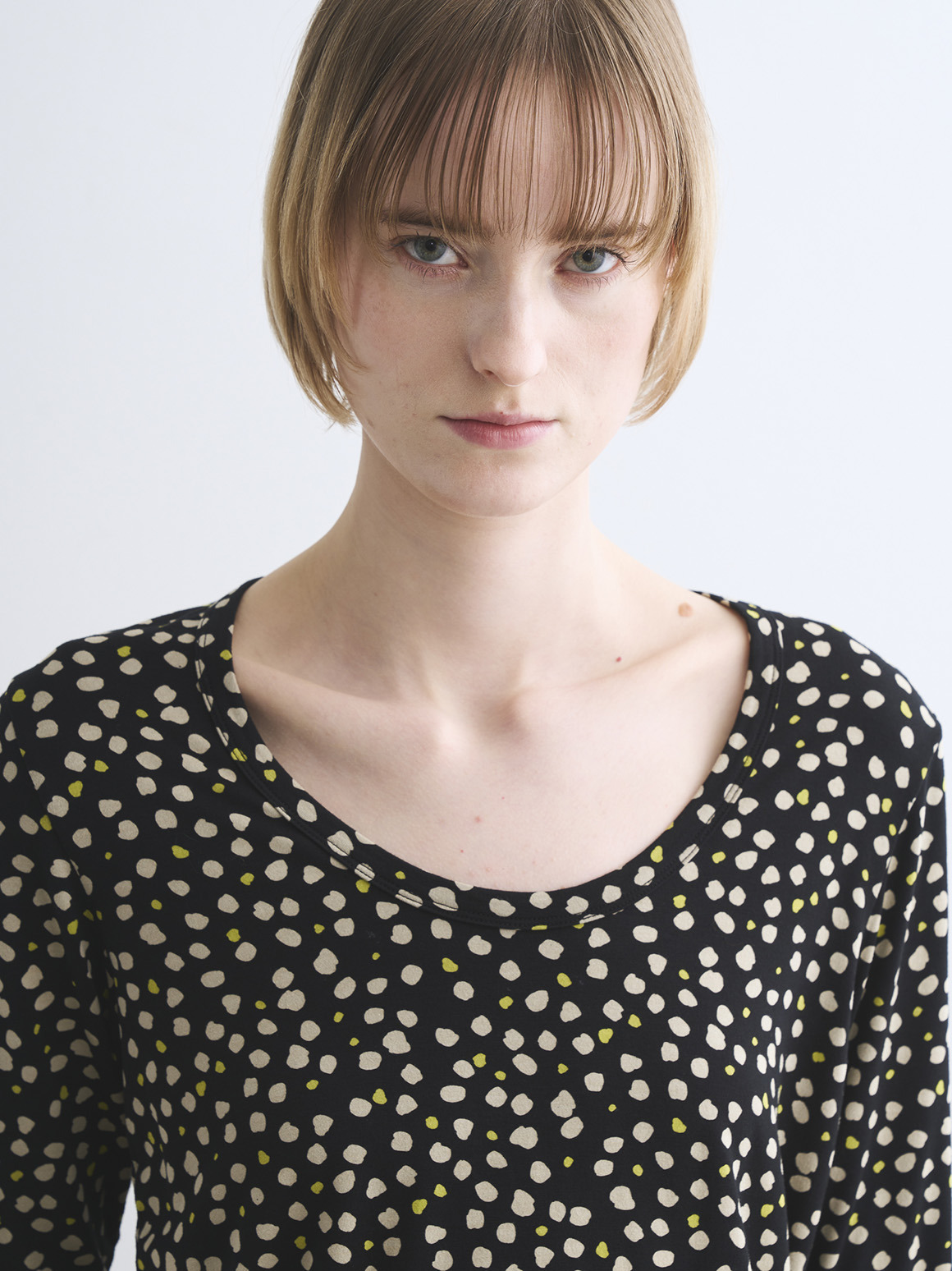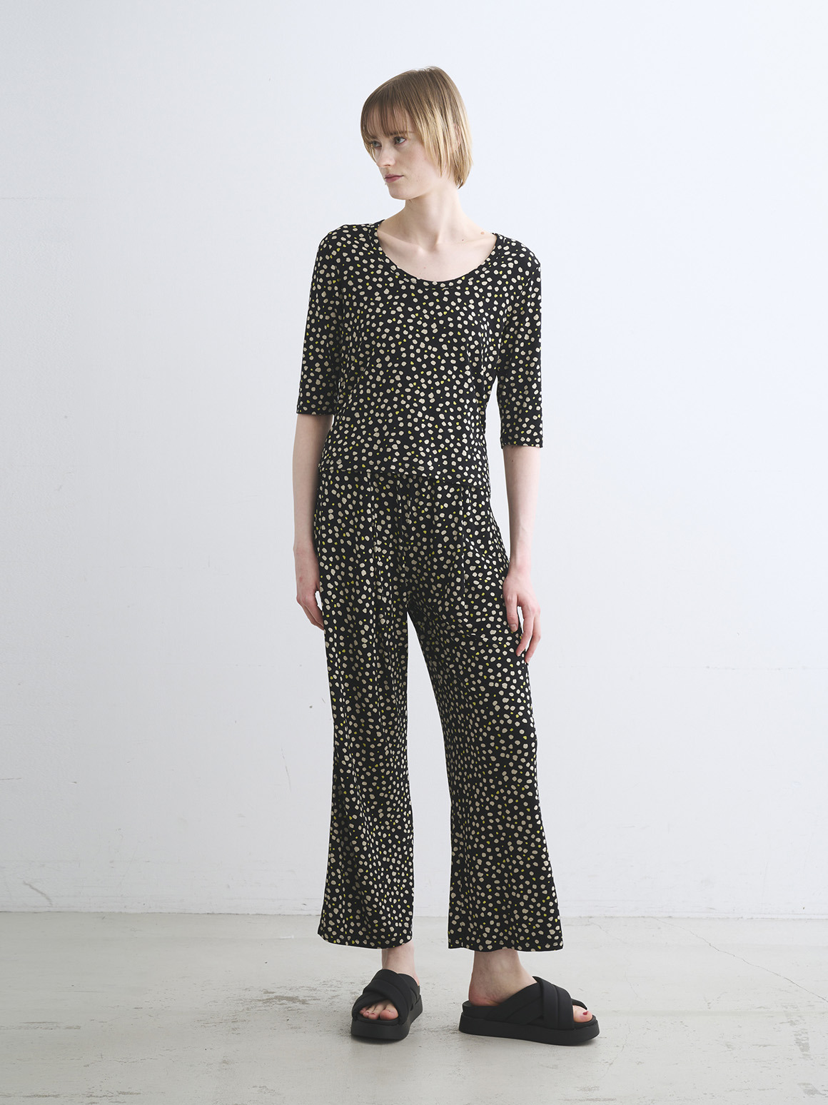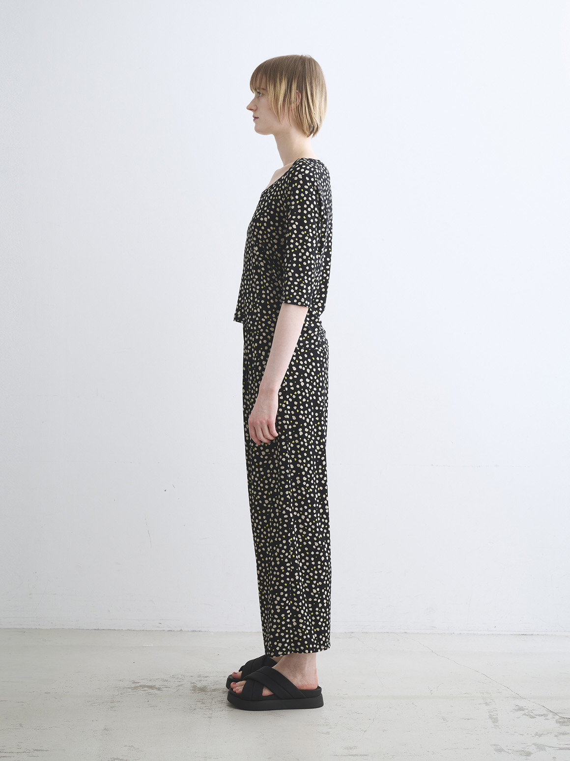 JESSICAトップスはボクシーなジャスト丈にハーフスリーブの使い勝手の良い形。バックのトライアングル開きが後ろ姿のポイントとなり、シンプルな無地でもニュアンスがもたらされます。プリントでのJESSICAも初登場なので新鮮なスタイリングが可能に。
