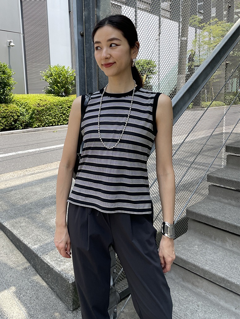 着用サイズ:S太目のボーダーが目を引くタンクトップは、シンプルなコーデを華やかな印象にしてくれます。