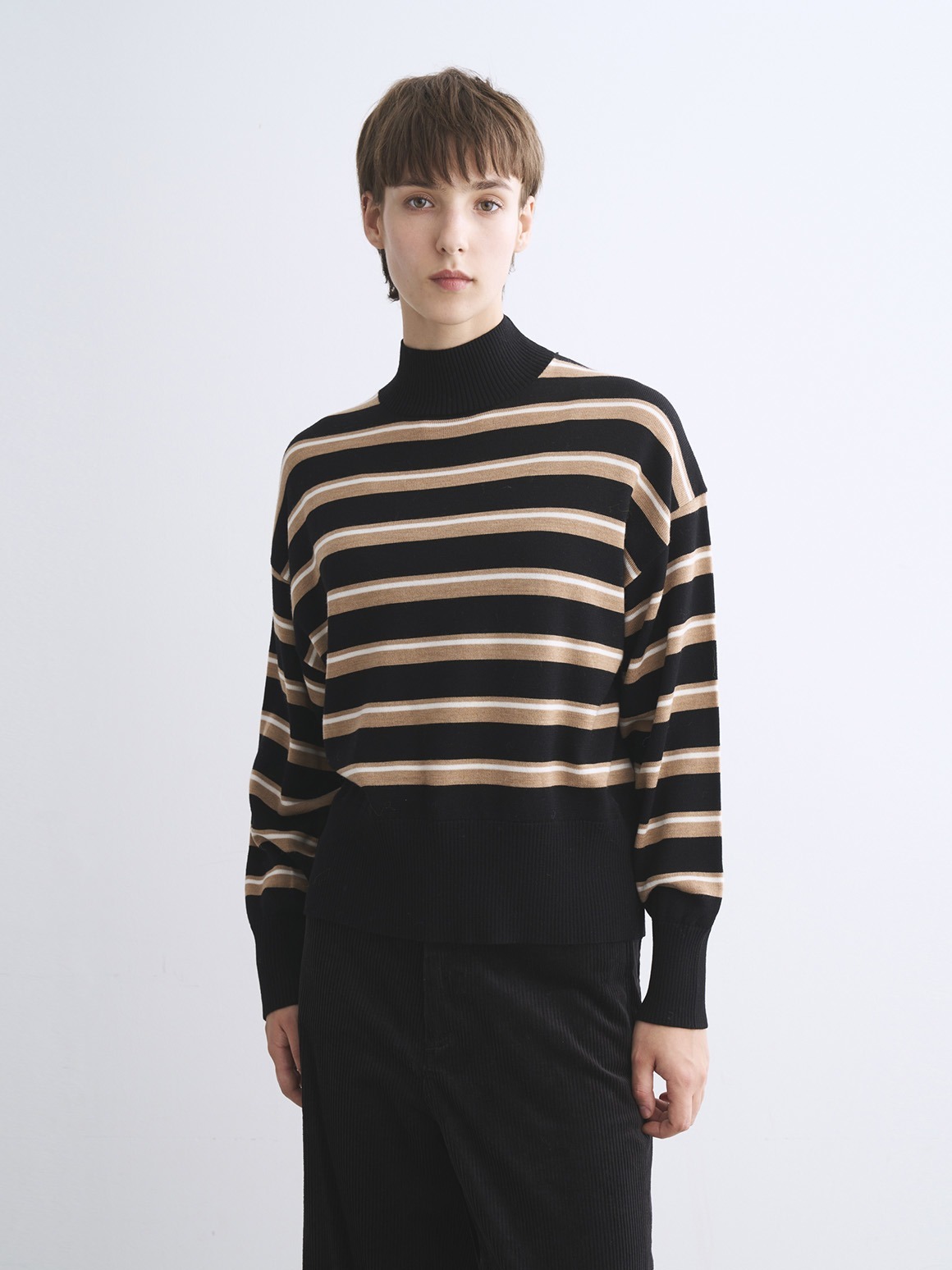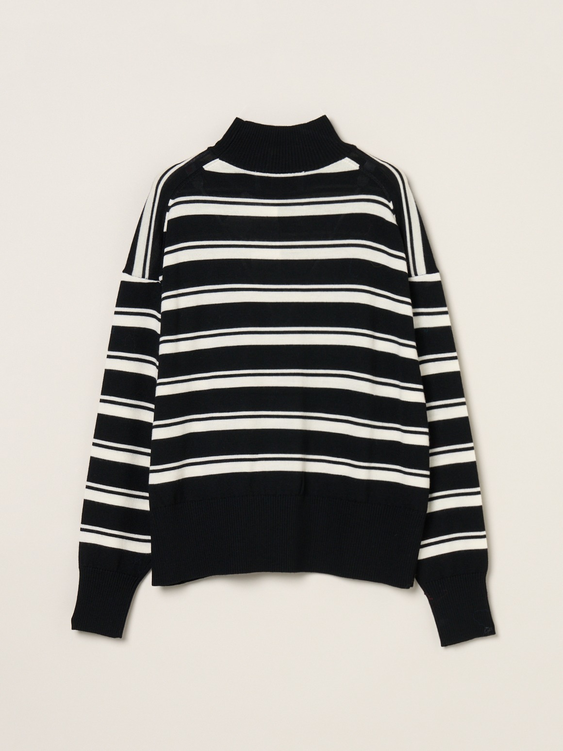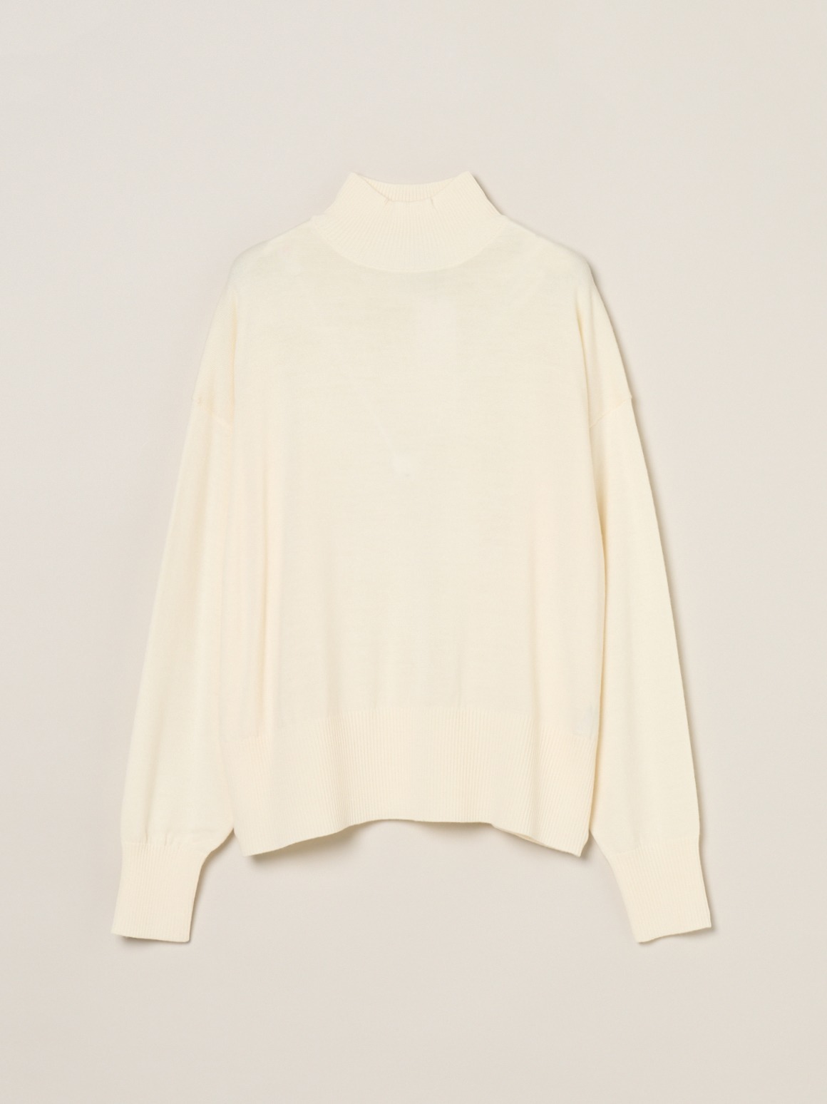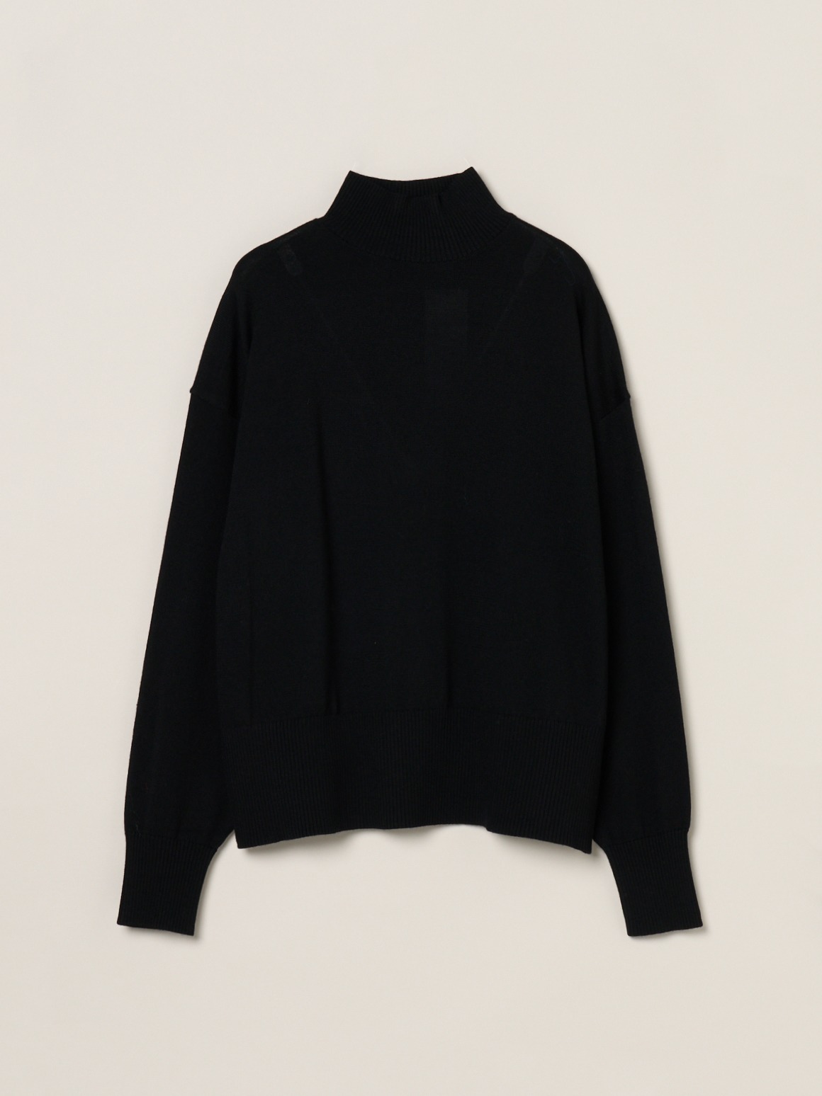 定番素材のすっきりとしたウール100%素材。ウールでも毛羽を落とした糸のため、カットソー感覚で着用でき、暑すぎず滑らかな着心地を楽しめます。ややたっぷりとしたシルエットのハイネックセーターは、シーンを選ばず汎用性の高い一枚。同素材のスカートとセットアップで着用いただける他、デニムなどとカジュアルにも着用可能です。