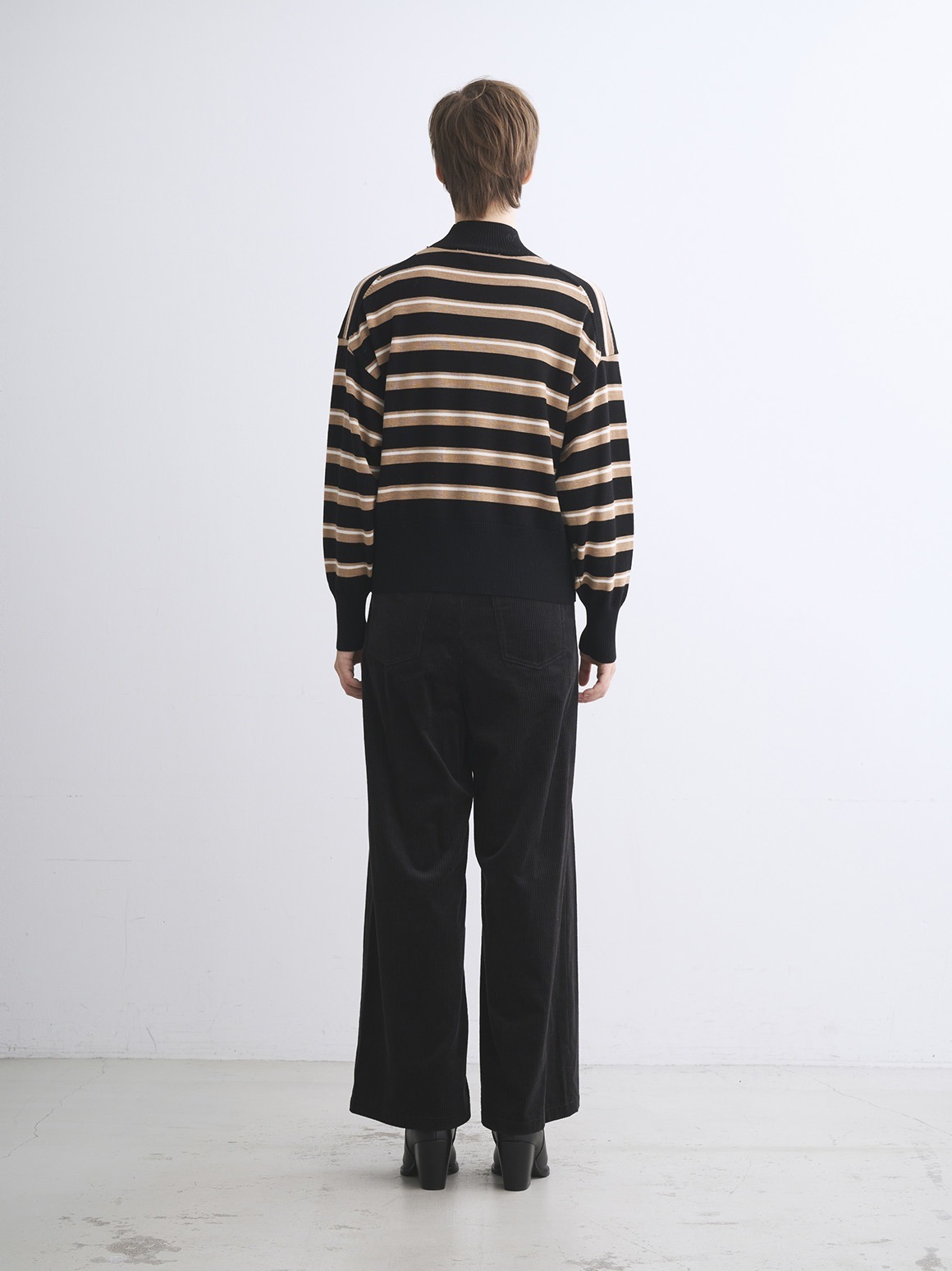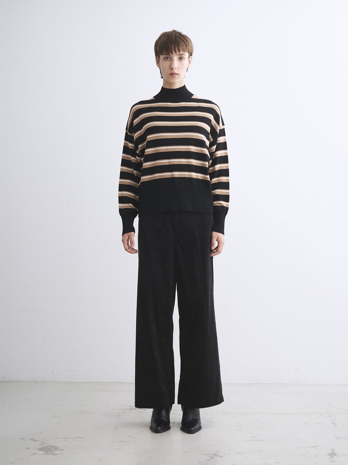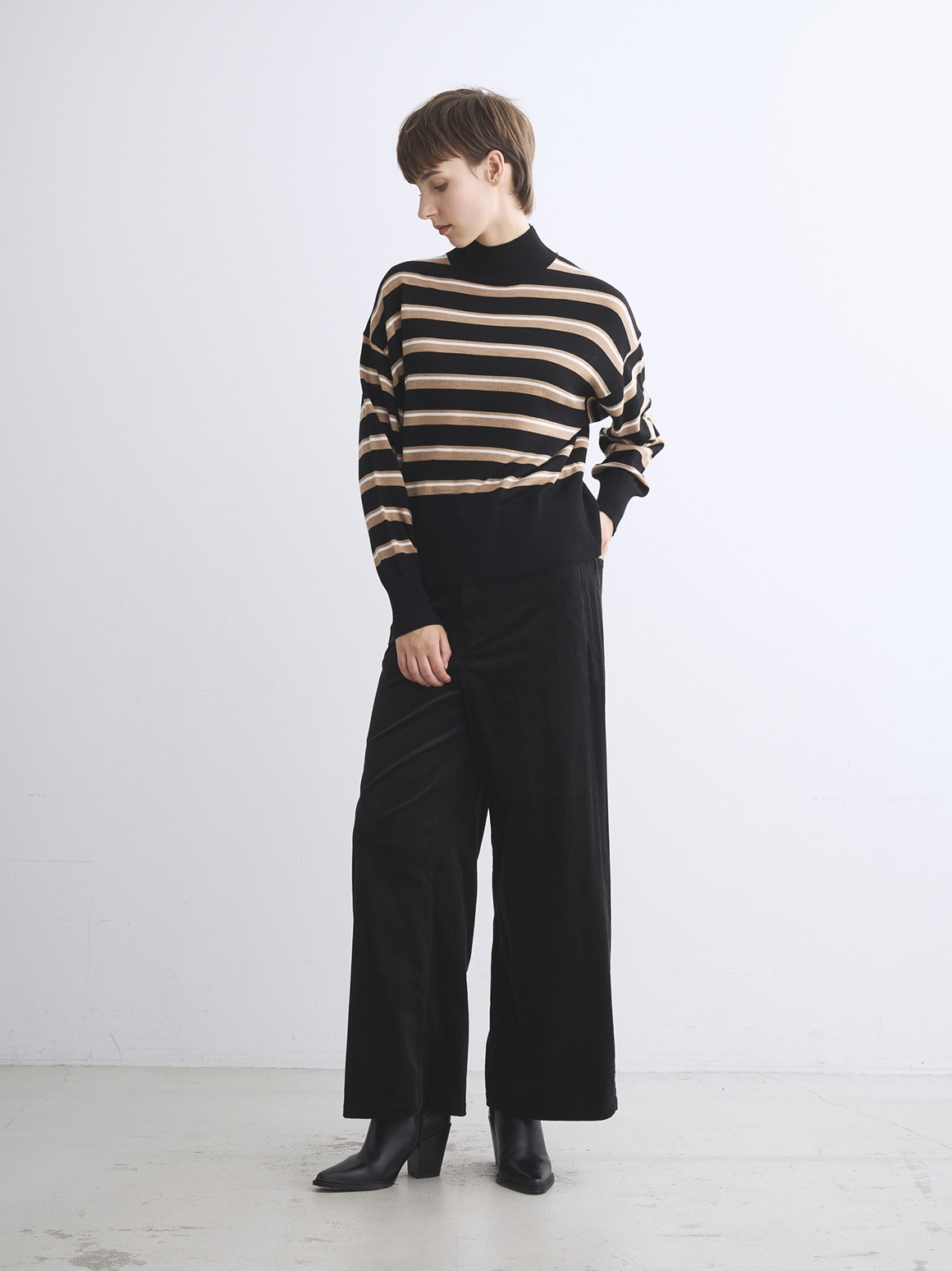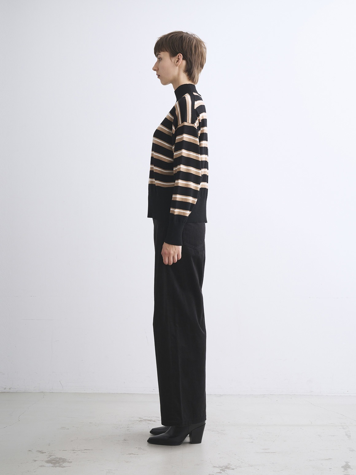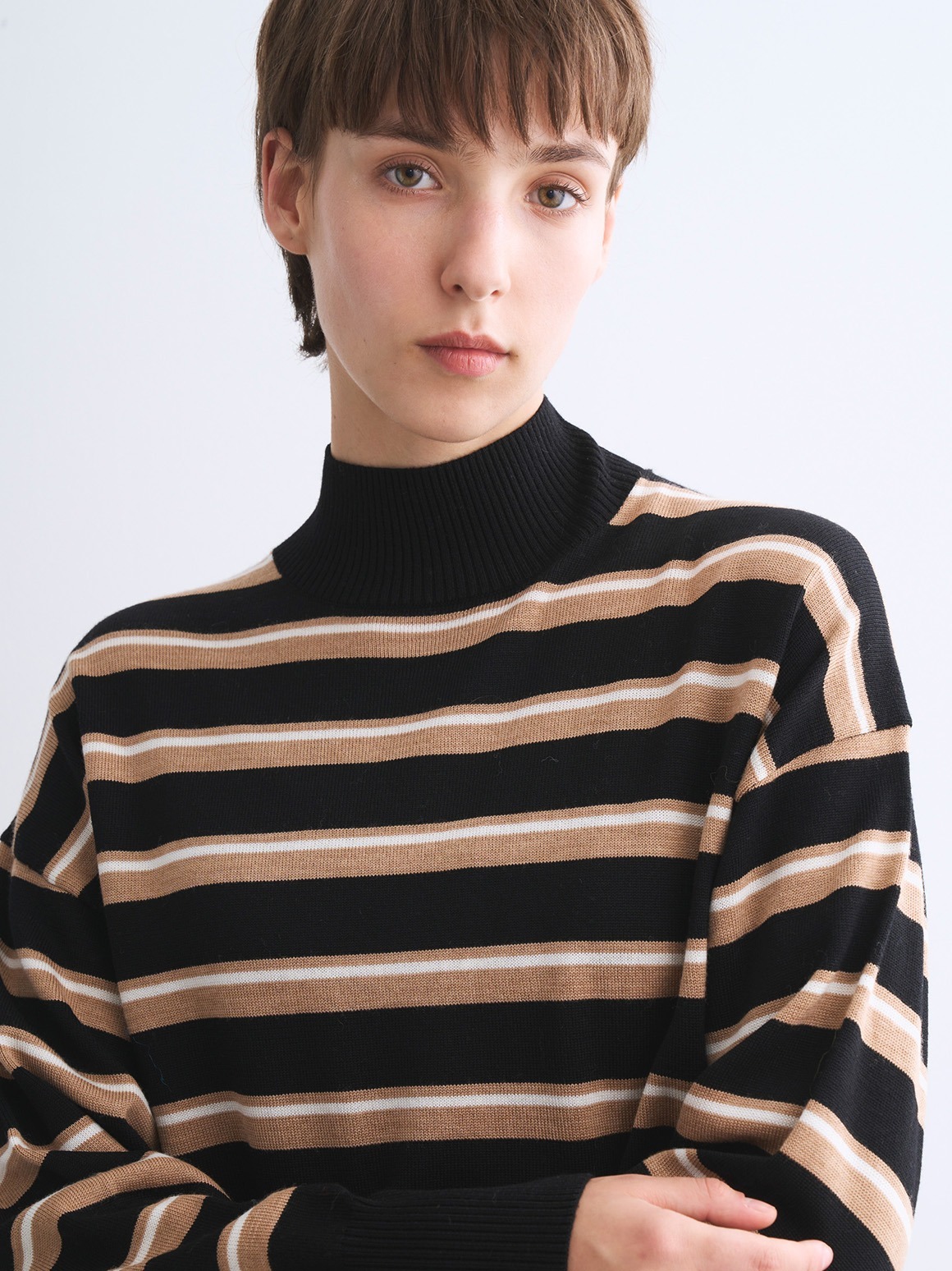定番素材のすっきりとしたウール100%素材。ウールでも毛羽を落とした糸のため、カットソー感覚で着用でき、暑すぎず滑らかな着心地を楽しめます。ややたっぷりとしたシルエットのハイネックセーターは、シーンを選ばず汎用性の高い一枚。同素材のスカートとセットアップで着用いただける他、デニムなどとカジュアルにも着用可能です。