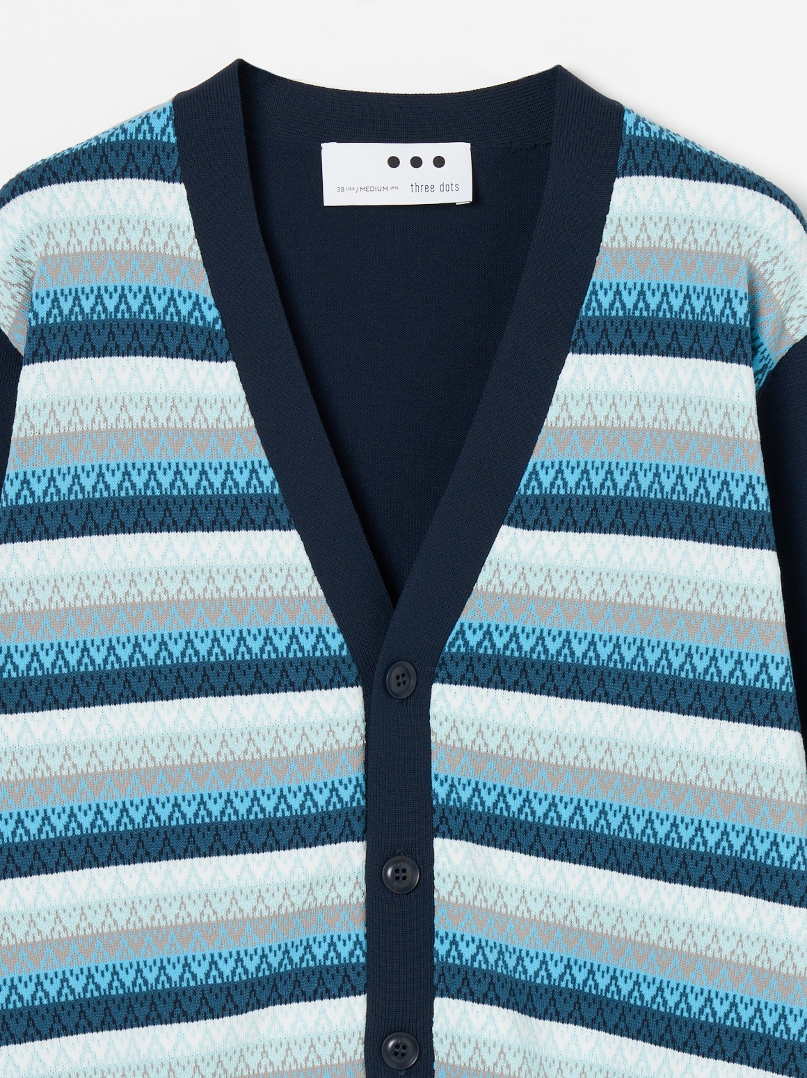 ストレッチの効いた軽量ポリエステルを使用しているため、軽さと適度なハリ感が特徴。クラシックなジャガード柄ですが、鮮やかなボーダー調にすることで今の時期から春先まで着用できるアイテムとなっています。まだ肌寒い時期にも、1枚羽織るだけでサマになります。
