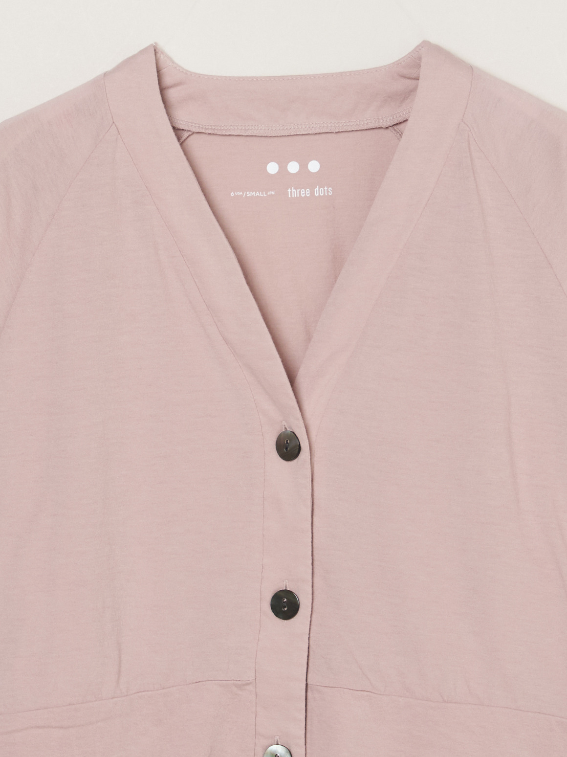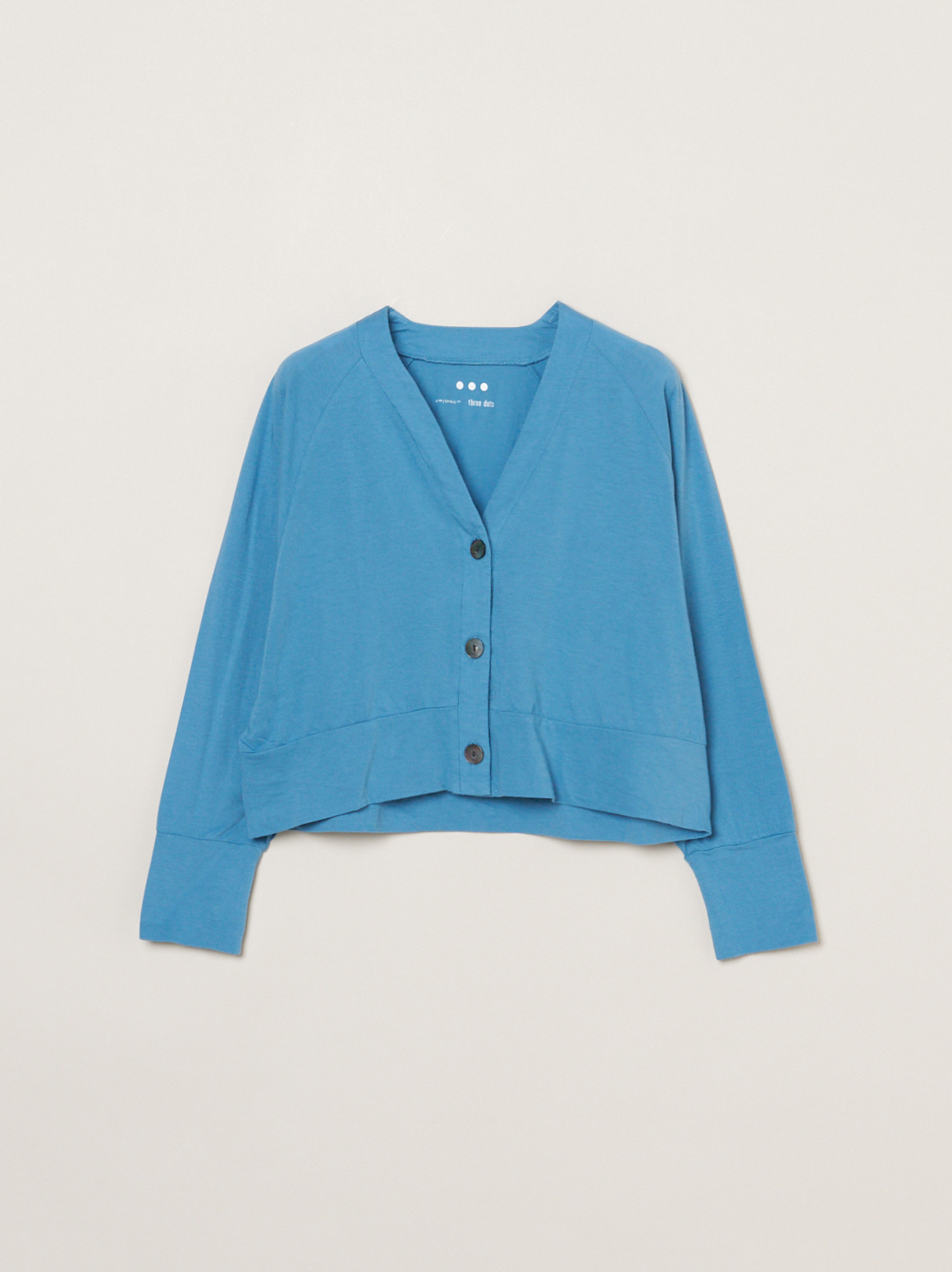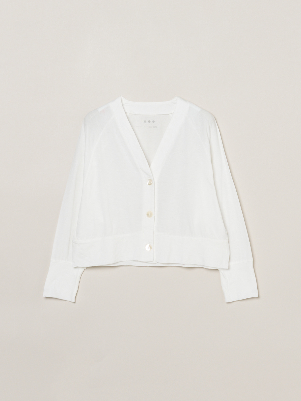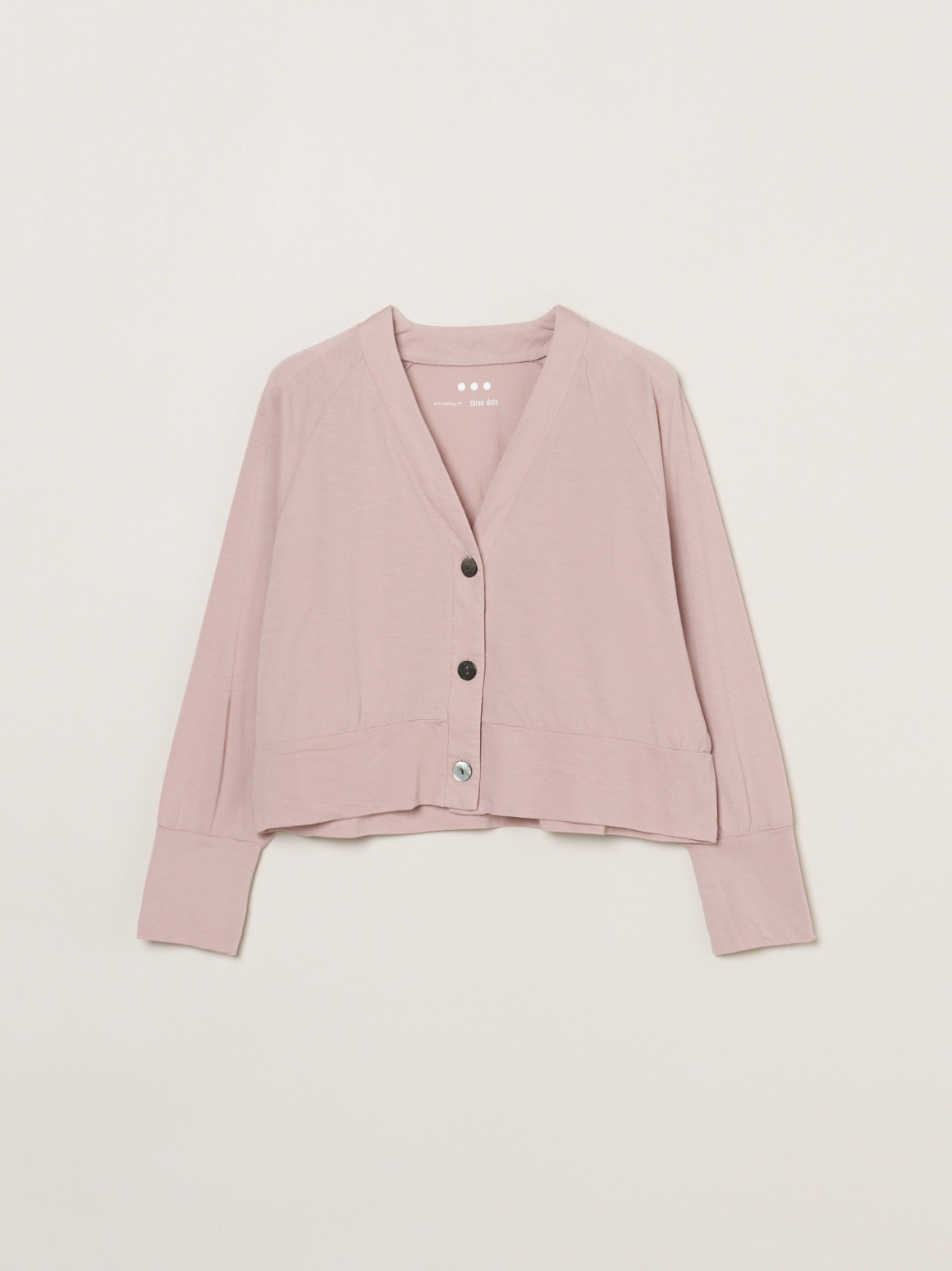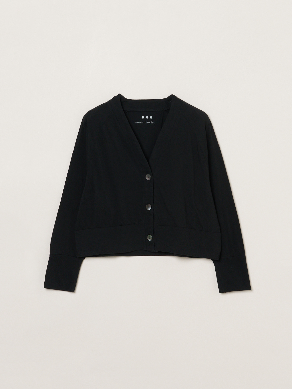 定番人気のJersey Colette素材のカーディガン。品の良い大き目のシェルボタンがアクセントとなり着こなしのポイントに。柔らかな素材で冷房対策にも便利。身幅、袖ともにゆとりがあるデザインなので、袖にデザインがあるトップスやドレスの上からも着用可能です。