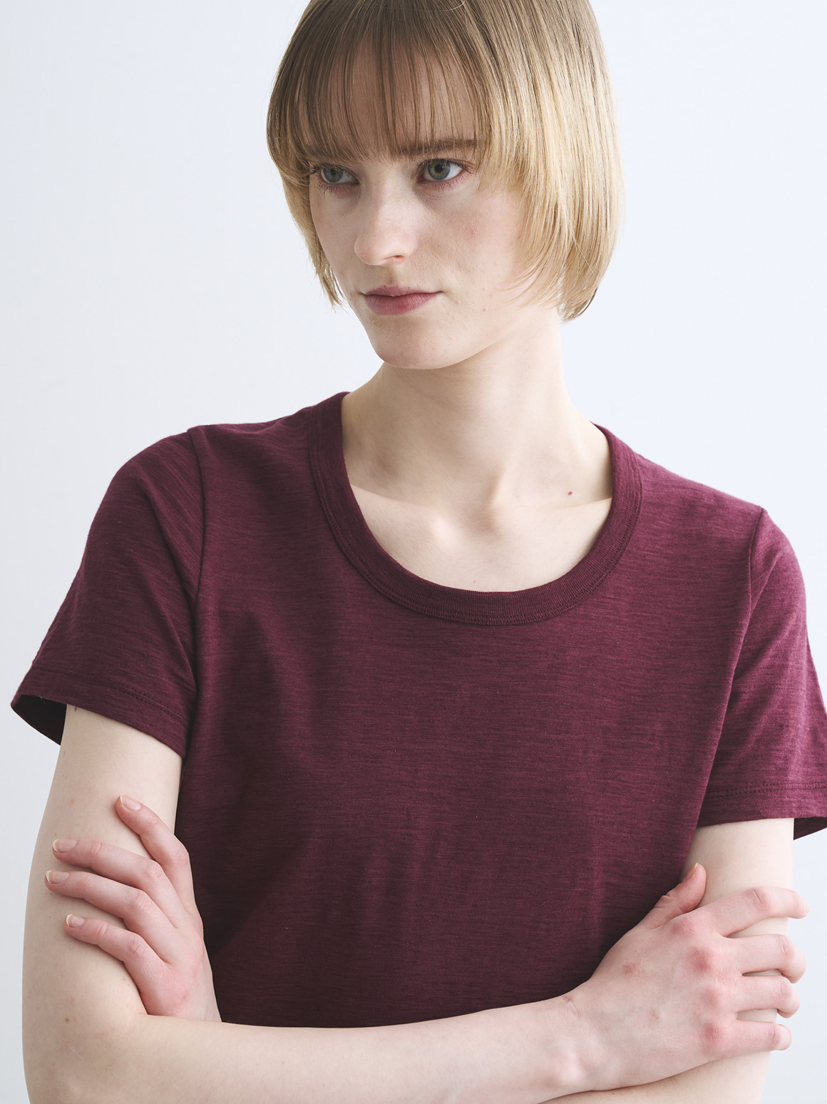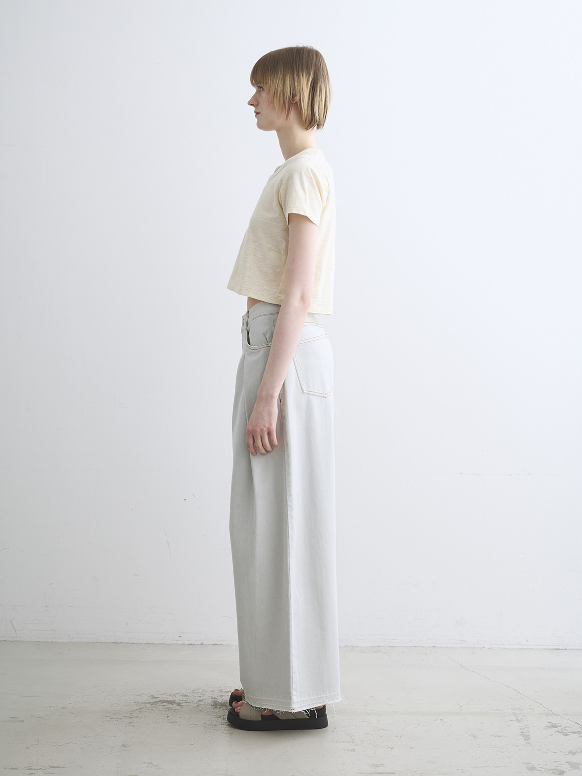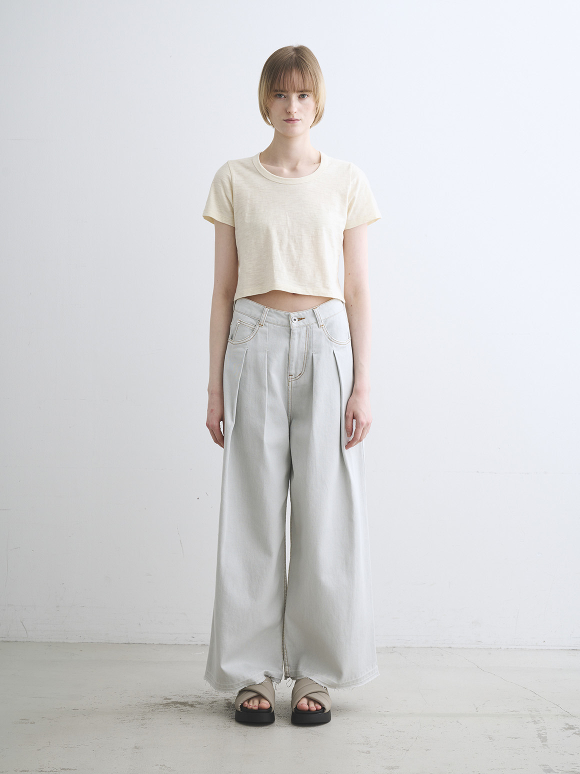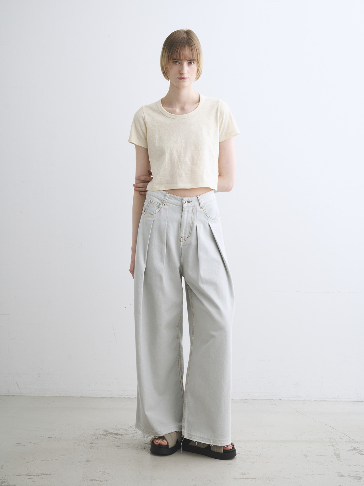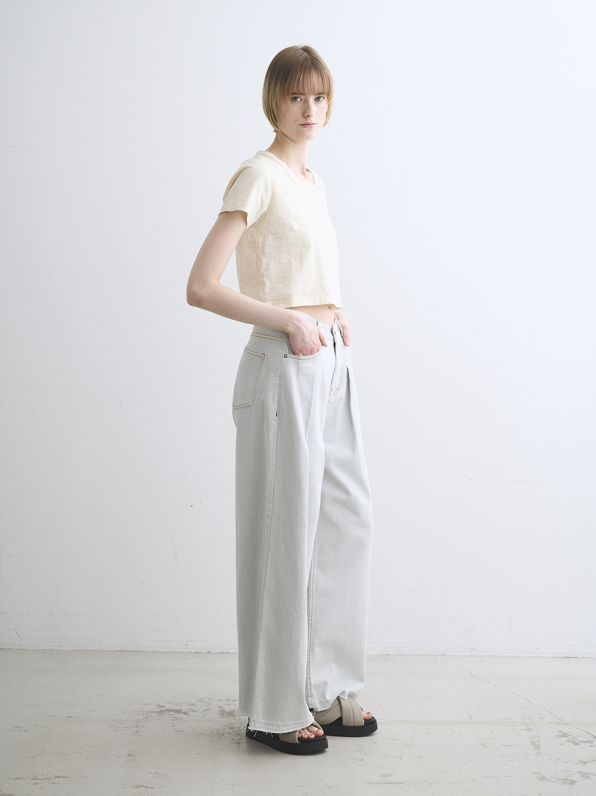 デコルテをきれいに見せるジェシカネックと、バランスの取りやすいクロップド丈で、カジュアルな素材ながらにセンシュアルなムードをひとさじプラス。