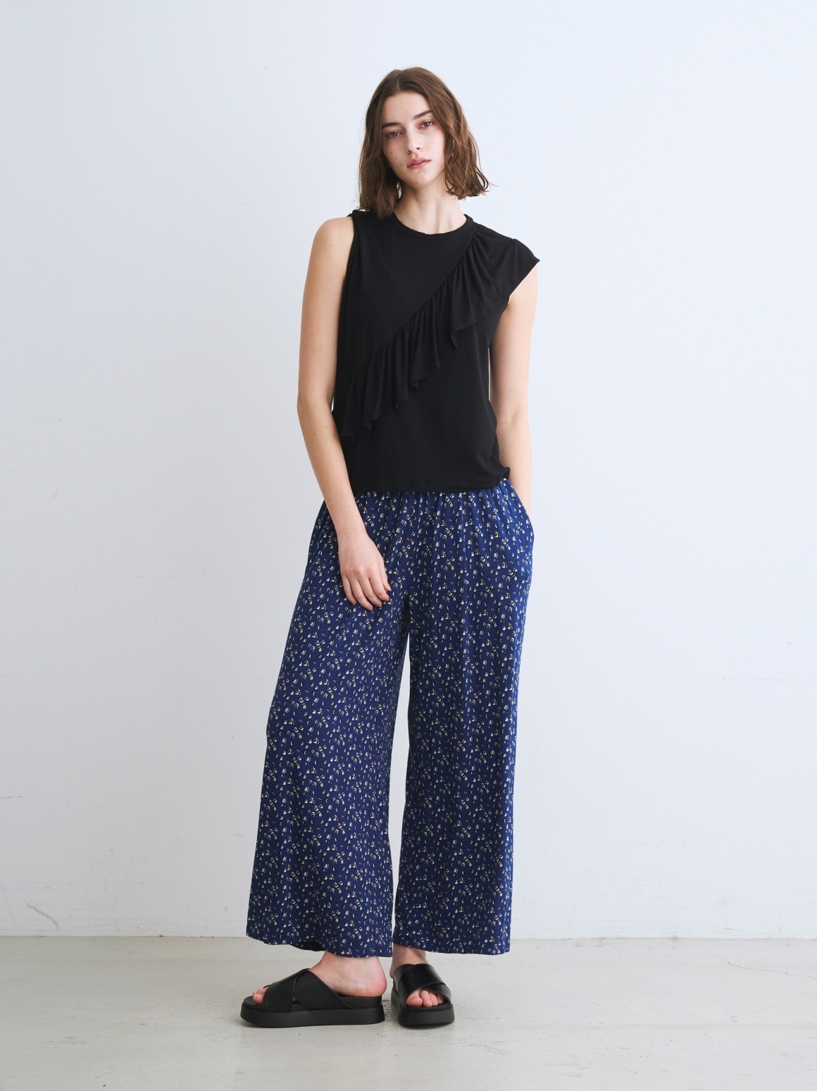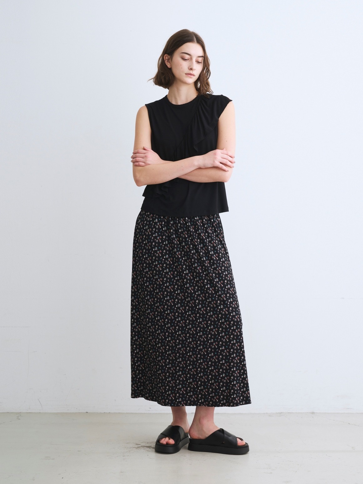 同素材でトップス、パンツ、スカート、ドレスがあり、組み合わせが多彩な他、それぞれのアイテムでプリントタイプと無地タイプをご用意しております。プリントと無地でのコーディネートもおすすめです。