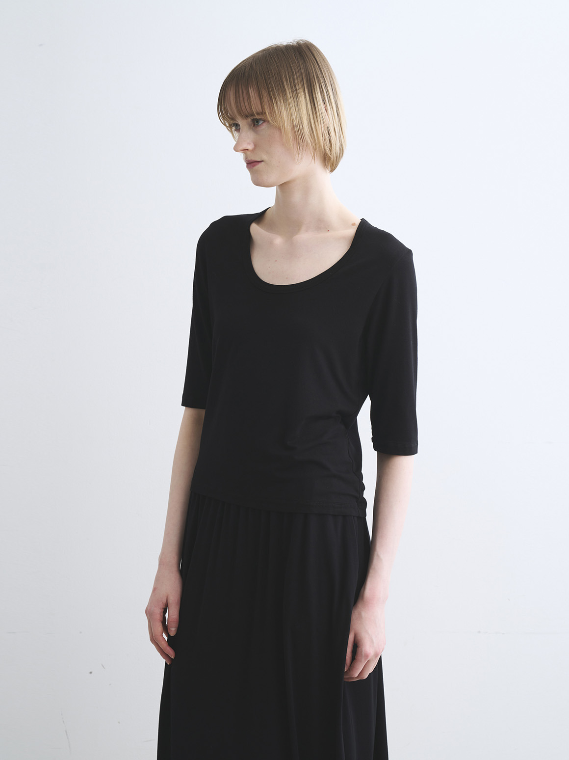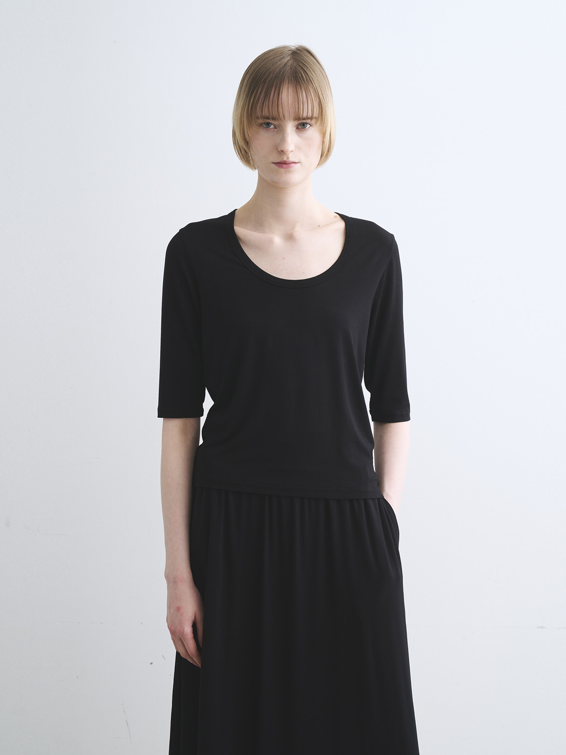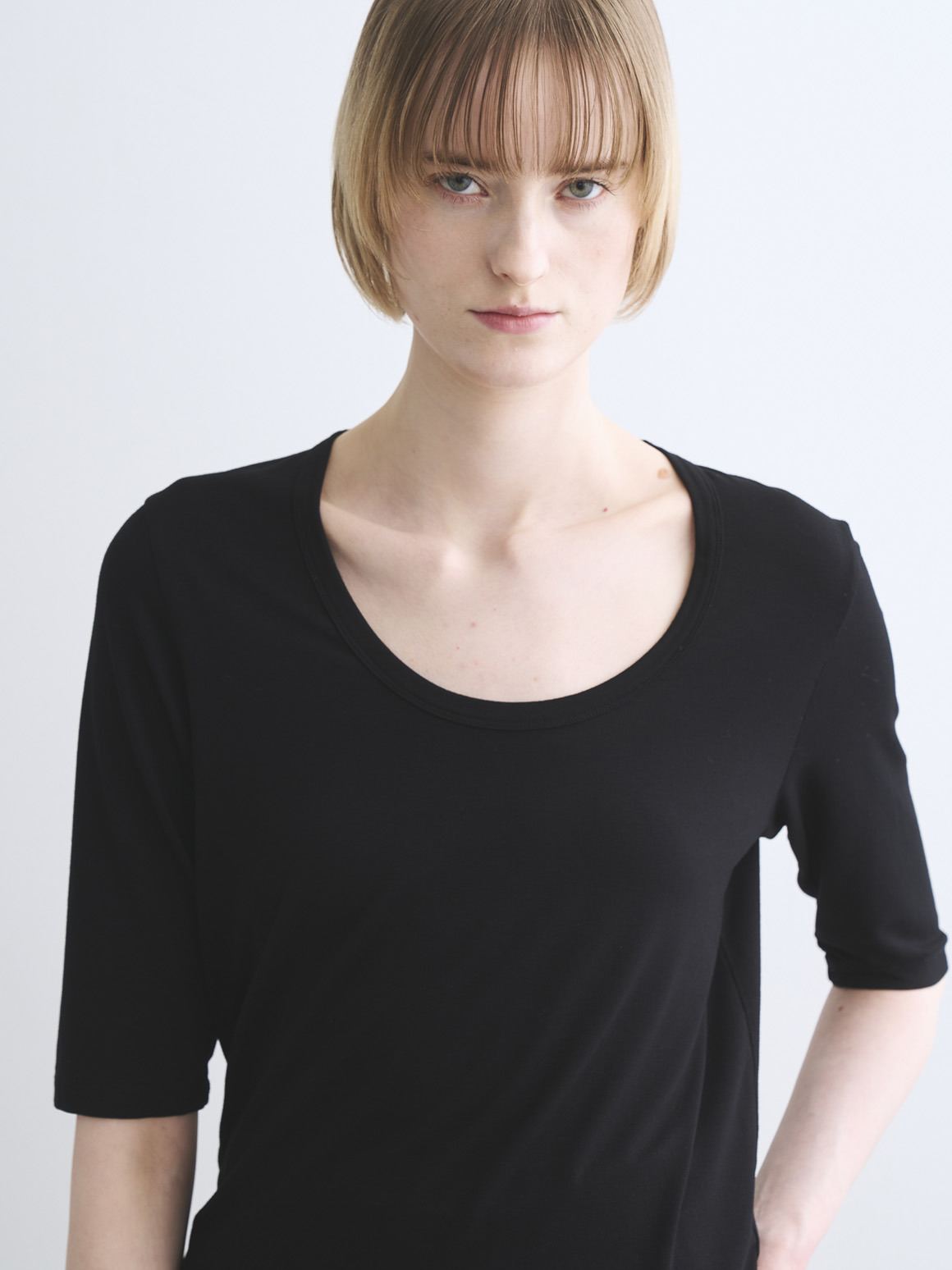 JESSICAトップスはボクシーなジャスト丈にハーフスリーブの使い勝手の良い形。バックのトライアングル開きが後ろ姿のポイントとなり、シンプルな無地でもニュアンスがもたらされます。プリントでのJESSICAも初登場なので新鮮なスタイリングが可能に。