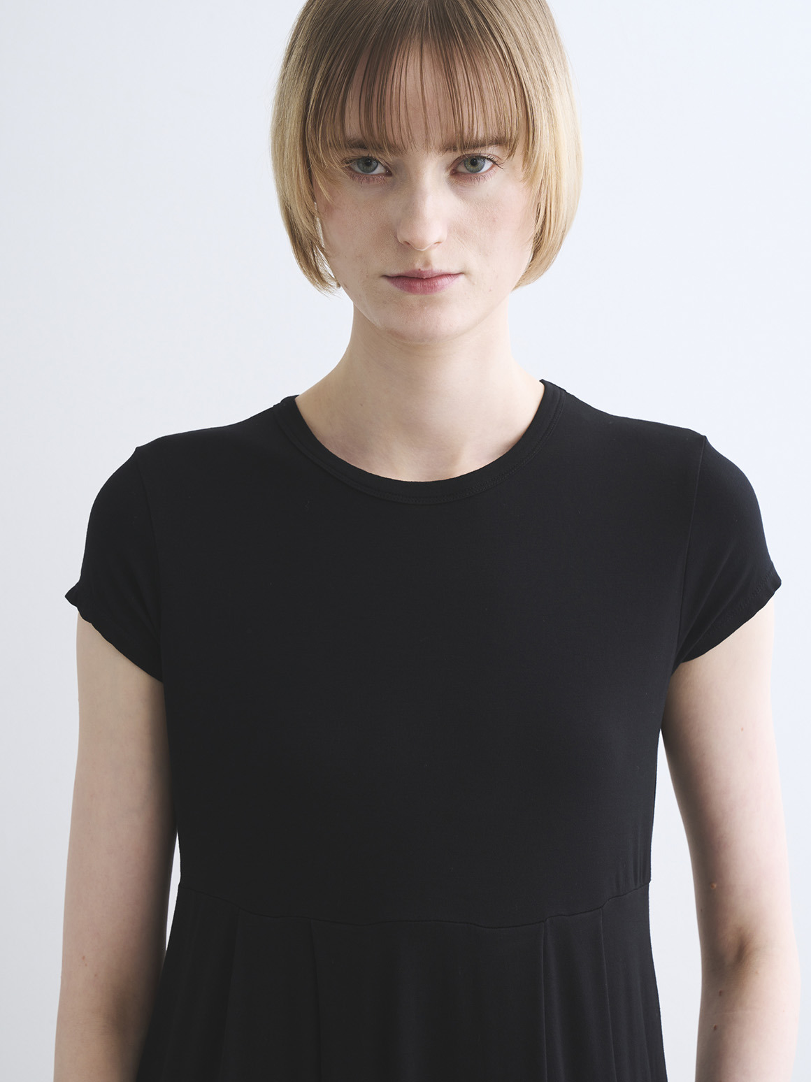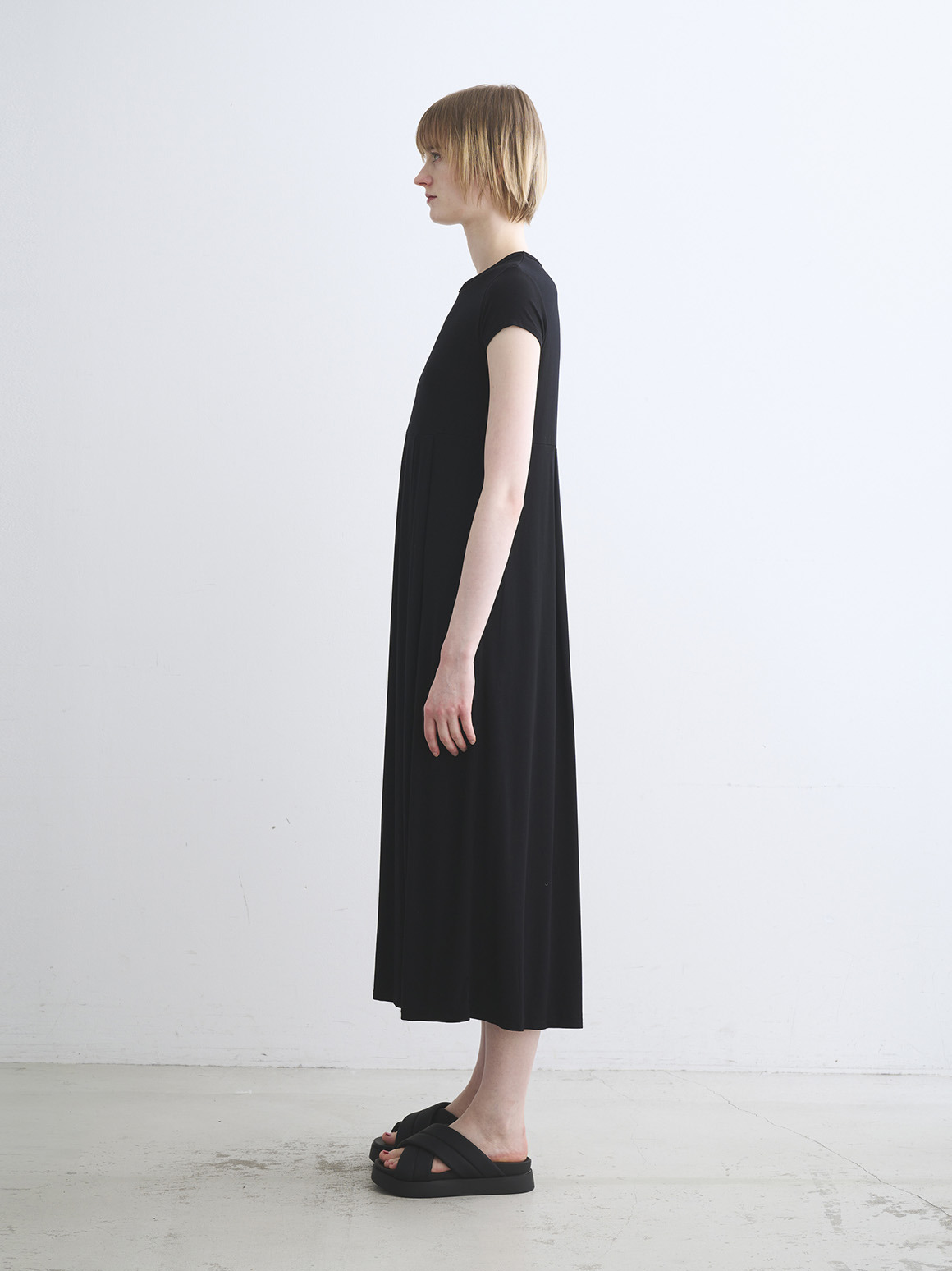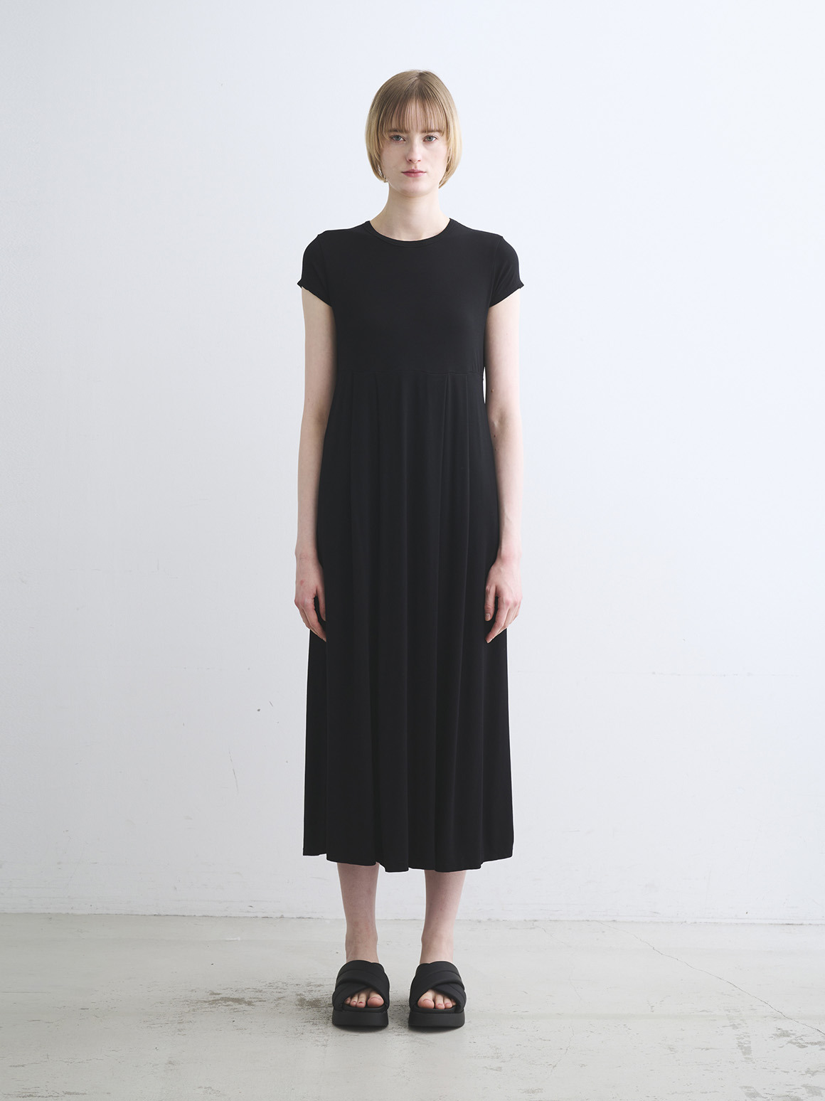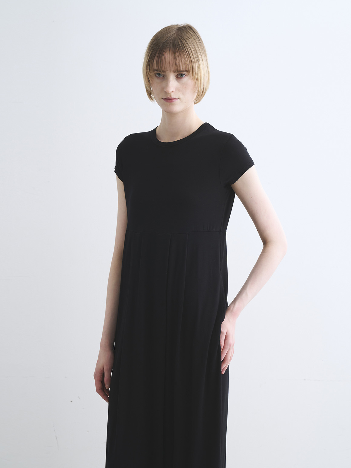 切り替え位置の高めのドレスは締め付け感がなく、ノーストレスな着心地。小さめのショートスリーブも華奢な印象をもたらし鮮度UPに。
