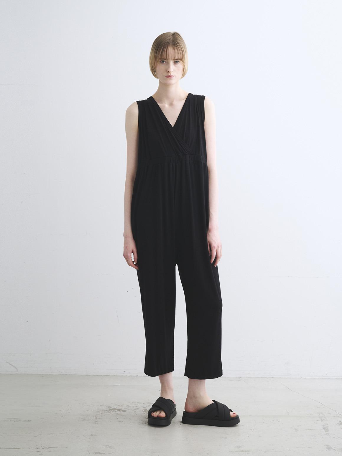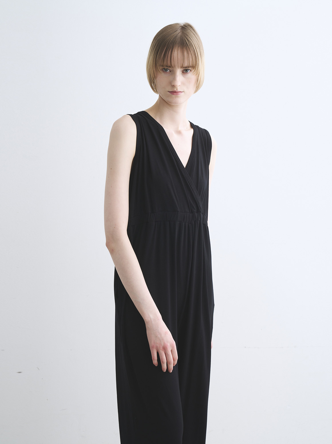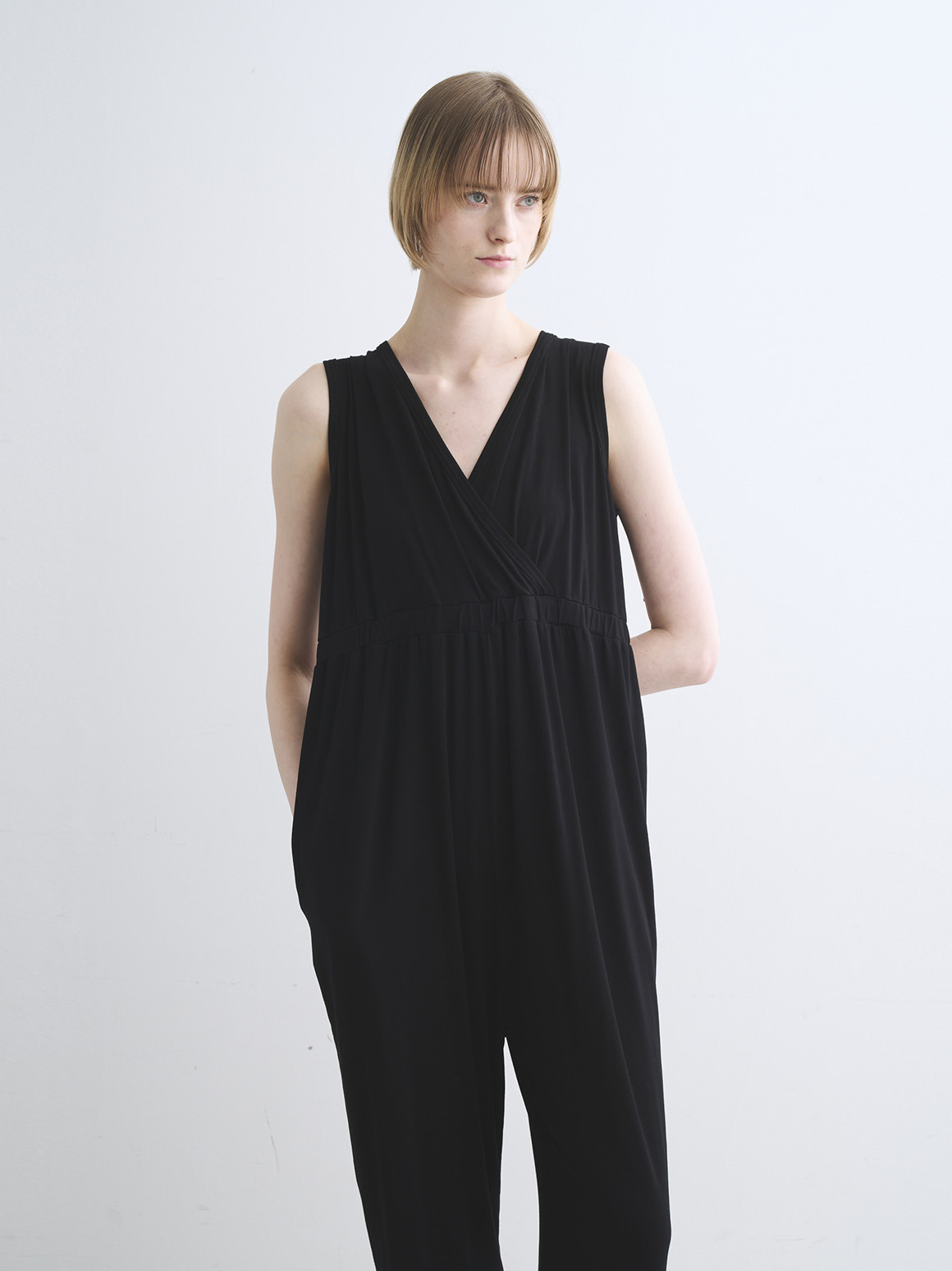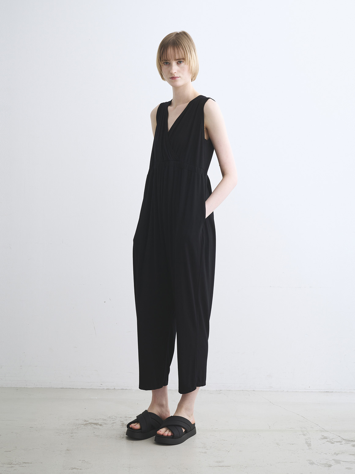 トラベルライン初となるサロペットは、前後2WAYで着用可能。クルーネックなら背中開きが楽しめ、Vネックならシャープな印象になりジャケットなども合わせやすい。ファスナーが無くても脱ぎ着しやすく、どこまでもノーストレスな着心地です。