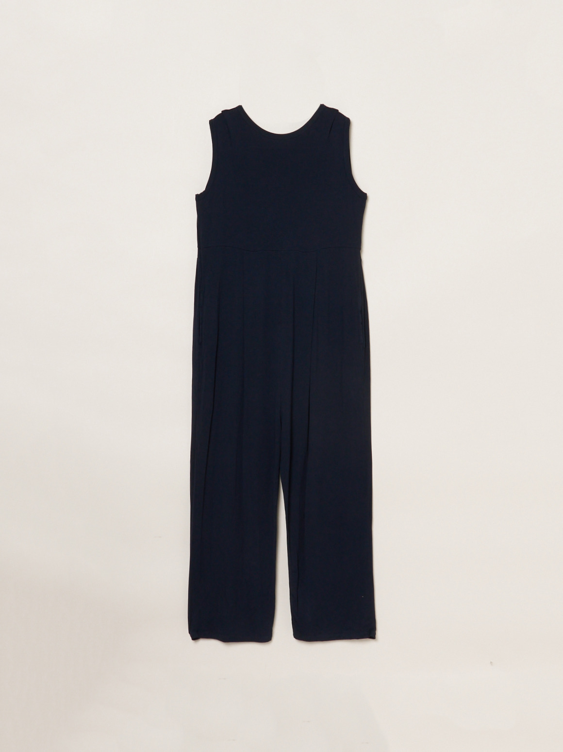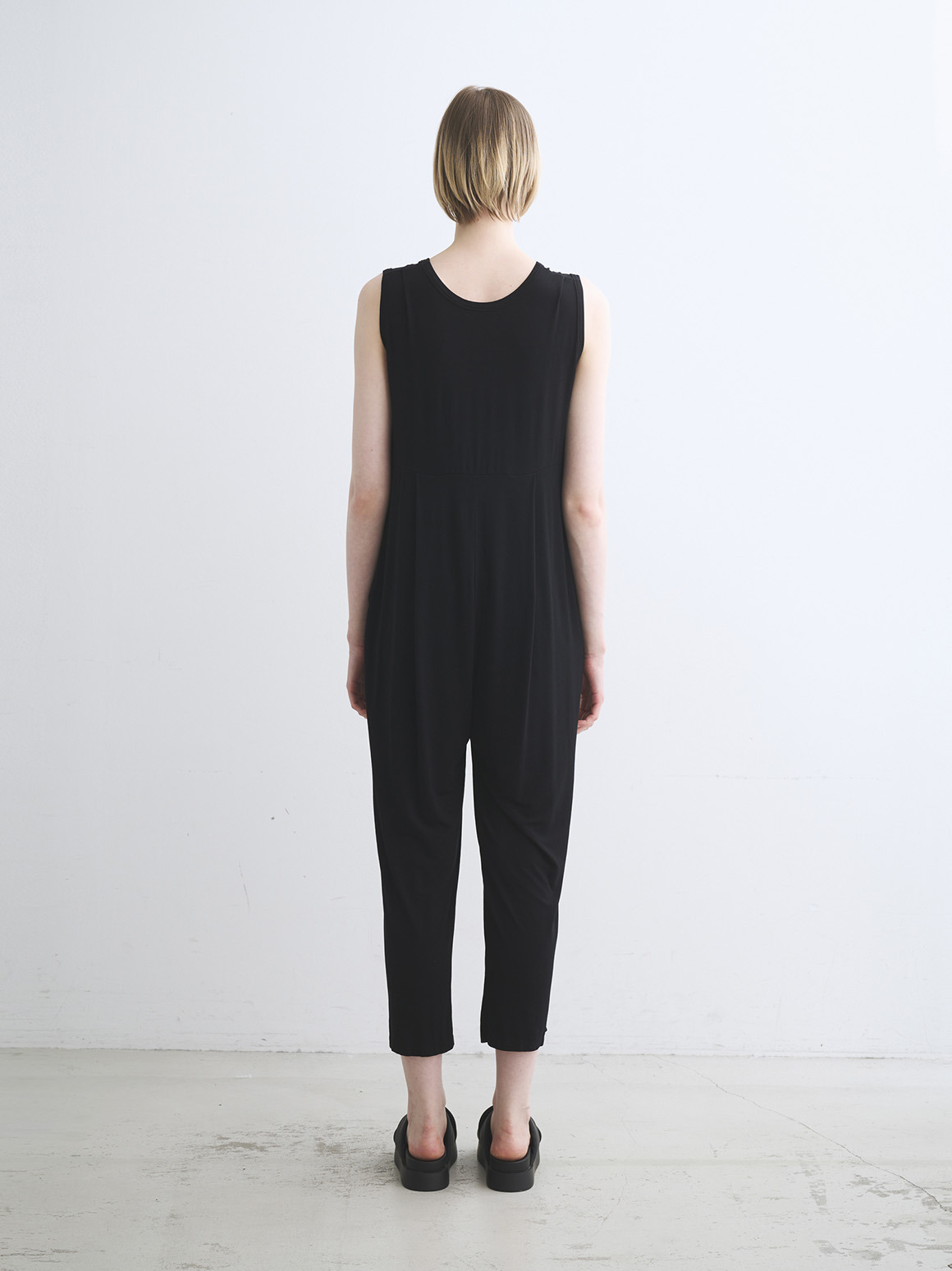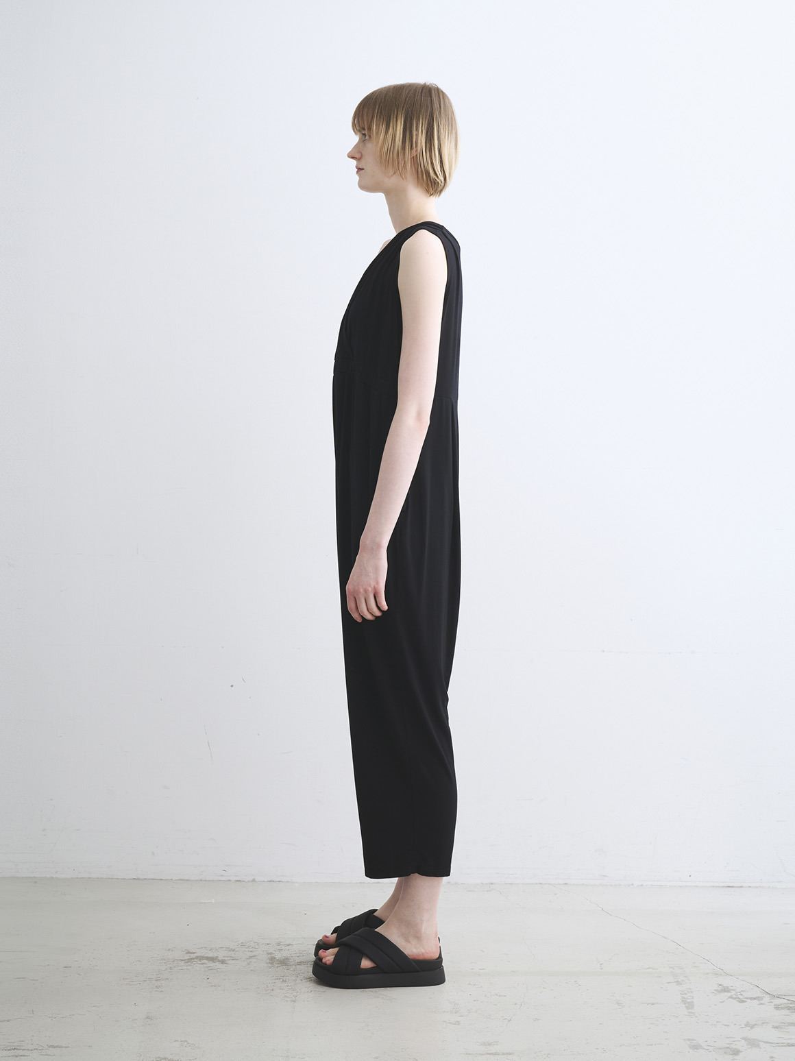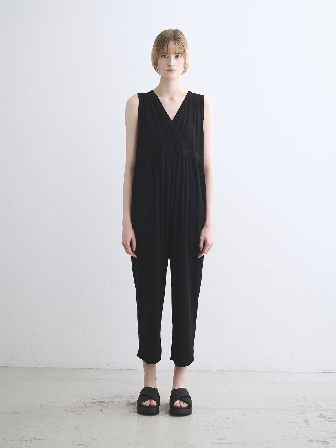 トラベルライン初となるサロペットは、前後2WAYで着用可能。クルーネックなら背中開きが楽しめ、Vネックならシャープな印象になりジャケットなども合わせやすい。ファスナーが無くても脱ぎ着しやすく、どこまでもノーストレスな着心地です。