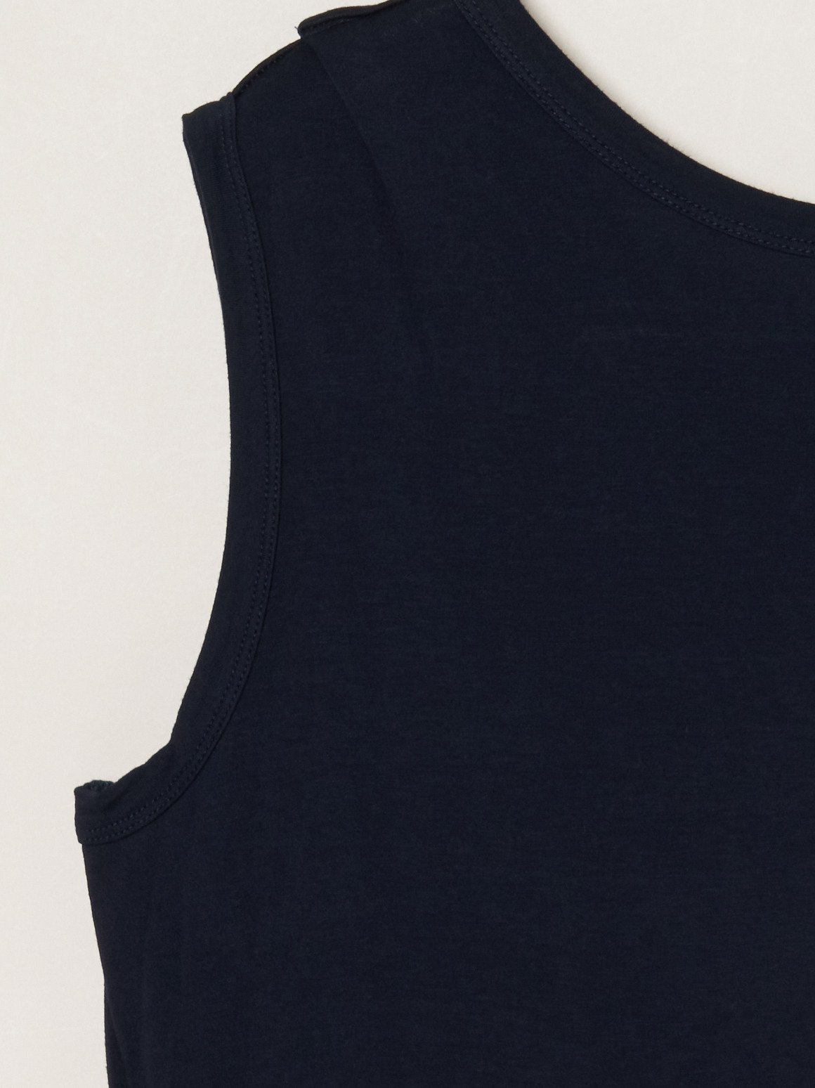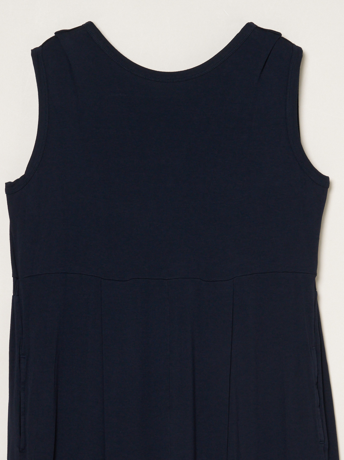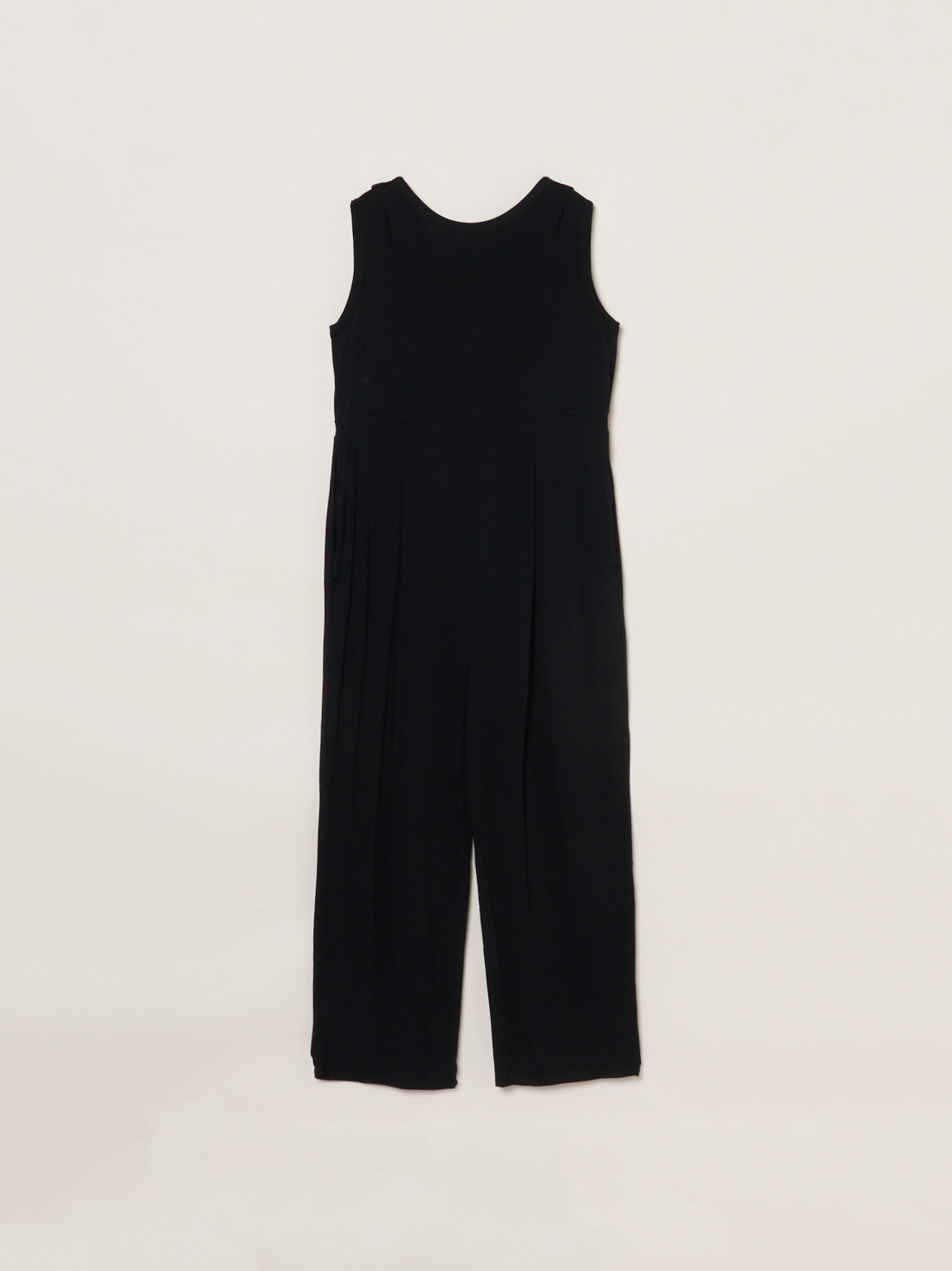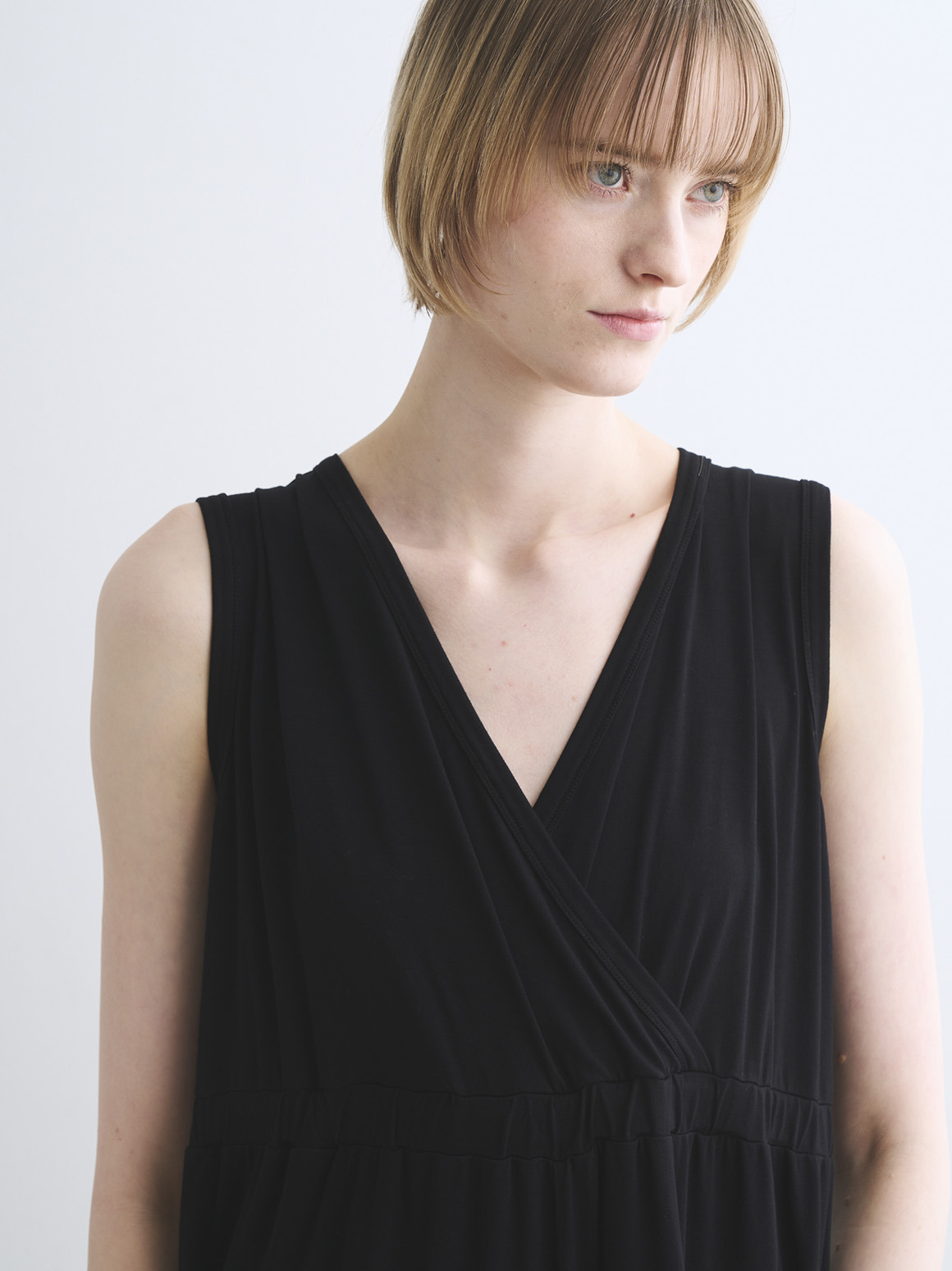 トラベルライン初となるサロペットは、前後2WAYで着用可能。クルーネックなら背中開きが楽しめ、Vネックならシャープな印象になりジャケットなども合わせやすい。ファスナーが無くても脱ぎ着しやすく、どこまでもノーストレスな着心地です。