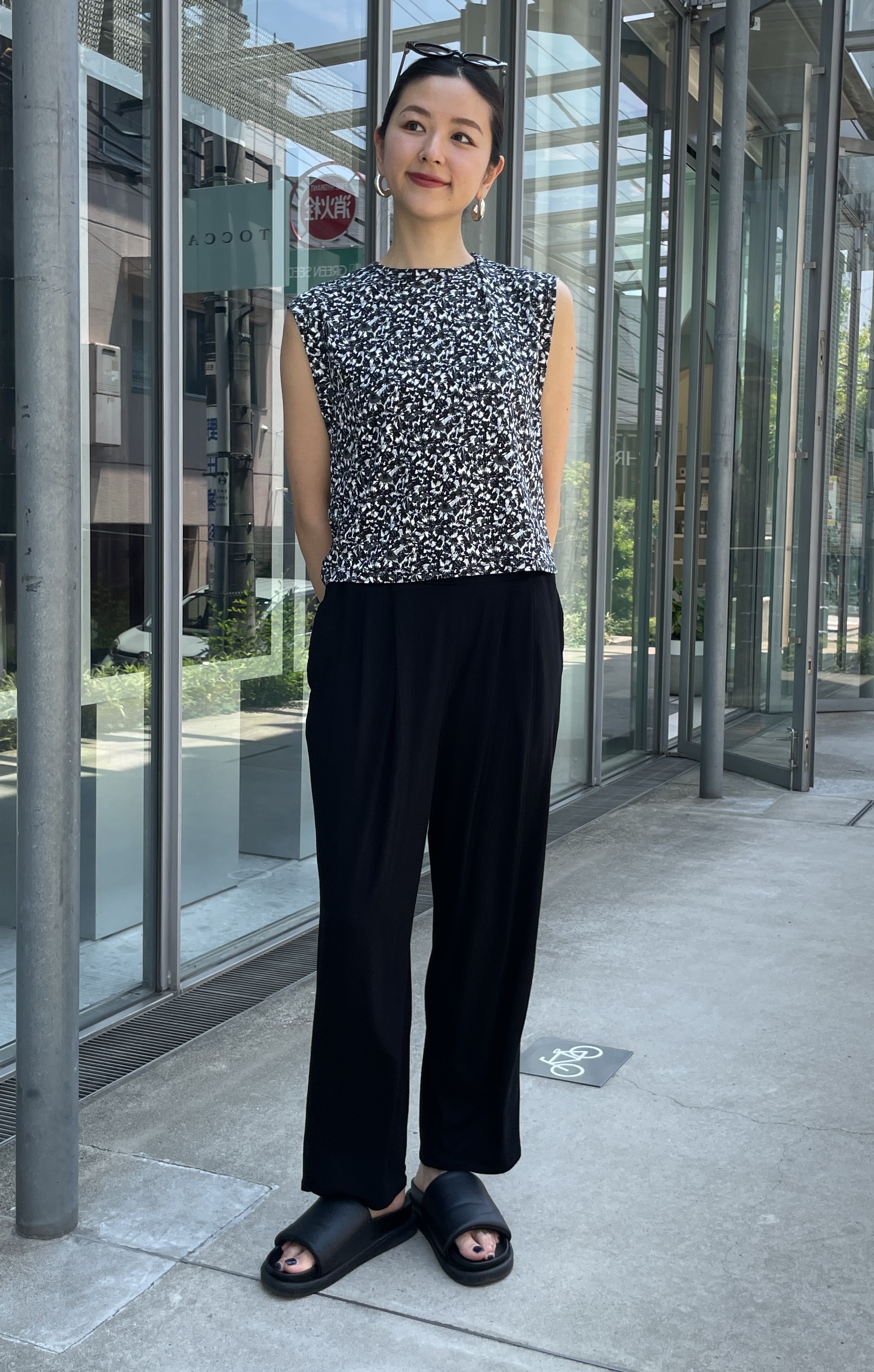 パンツはややコクーンがかったバレルパンツ風シルエット。落ち感があるためシルエットが主張しすぎず、さりげなくトレンドを取り入れられます。フロントタックで腰回りのラインを拾いにくく、すっきりとした印象に。