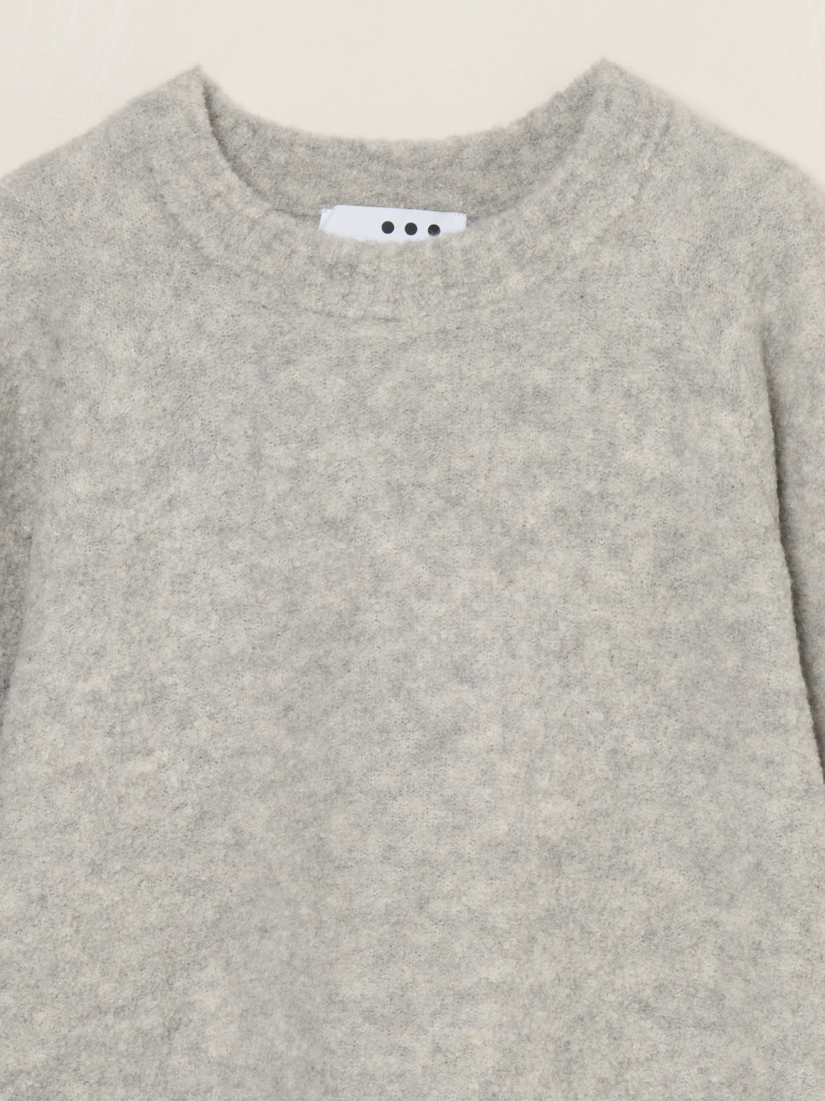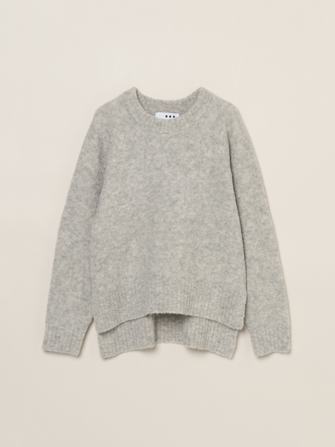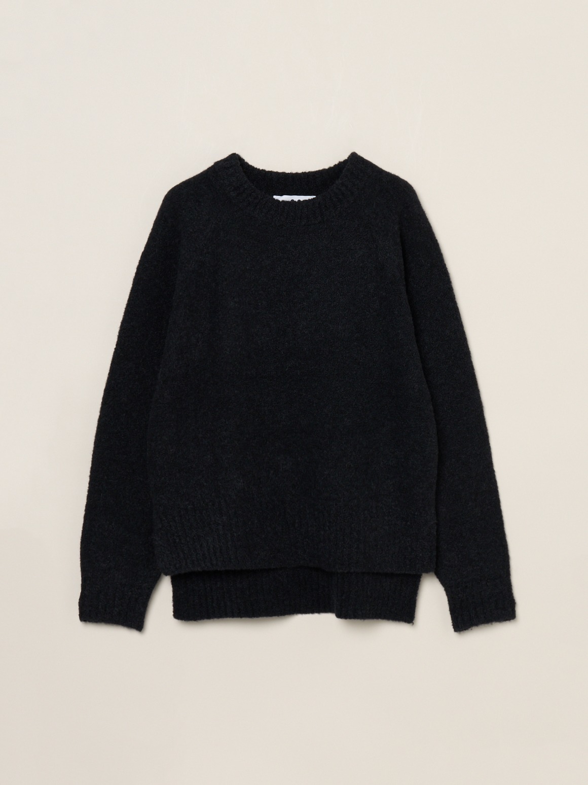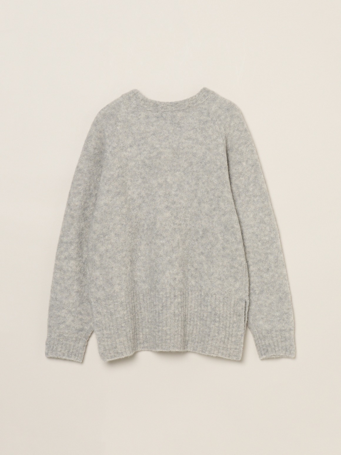 ふわふわもっちり。中肉の厚みのブークレニットはスウェットライクにすっきり着られて表情感も出せるアイテム。つかず離れずのシンプルなフィットはパンツもスカートも合わせられる万能アイテム。同素材でルーズフィットサイズのトップスも展開。