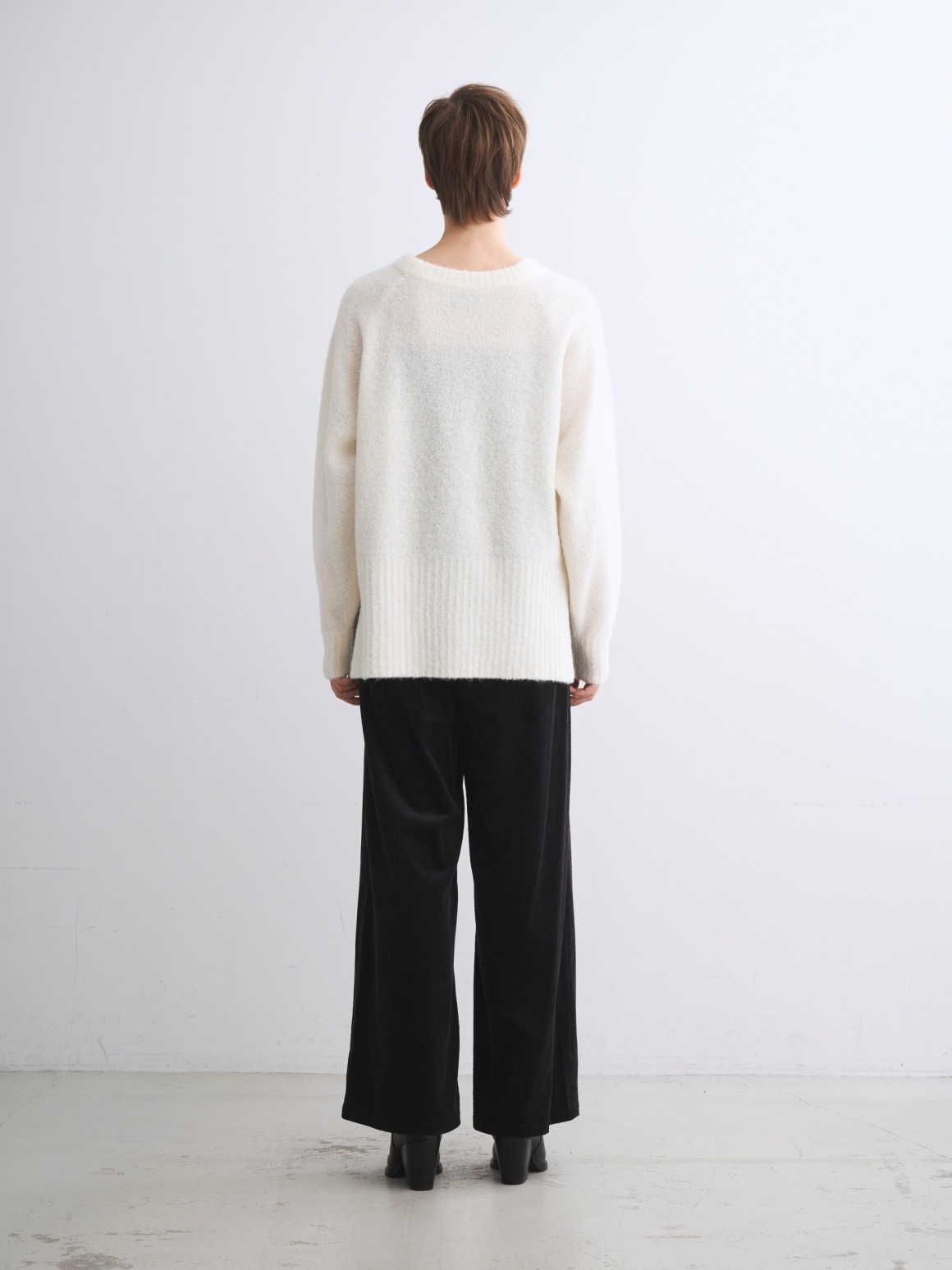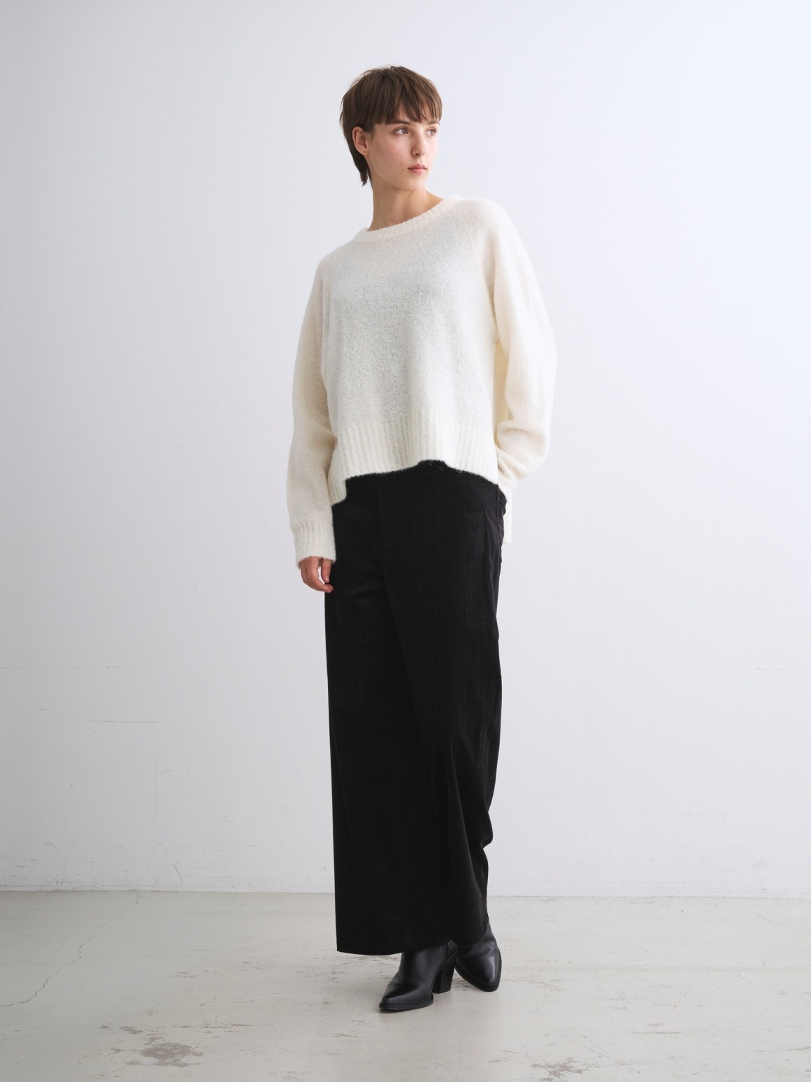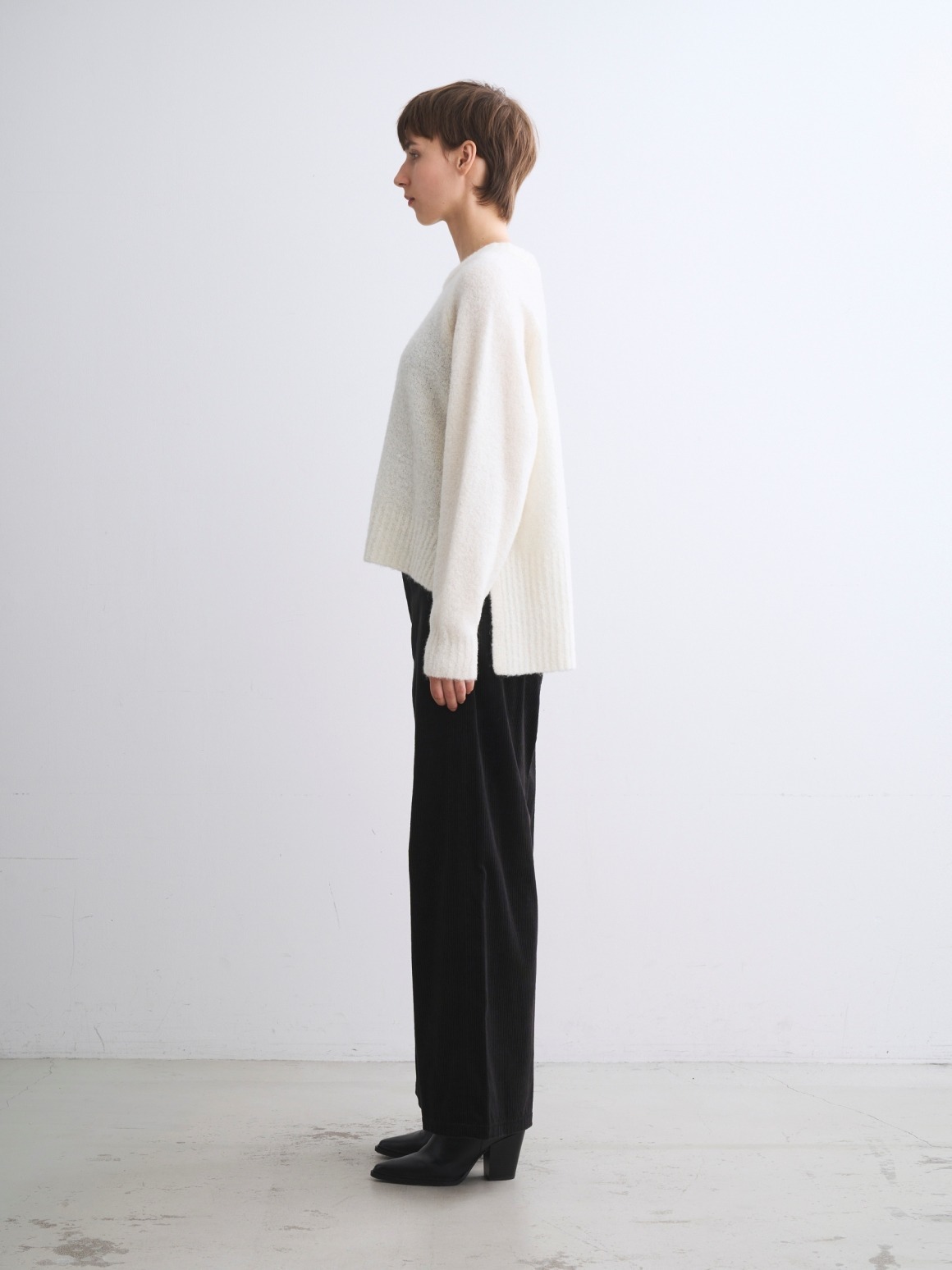 ふわふわもっちり。中肉の厚みのブークレニットはスウェットライクにすっきり着られて表情感も出せるアイテム。つかず離れずのシンプルなフィットはパンツもスカートも合わせられる万能アイテム。同素材でルーズフィットサイズのトップスも展開。