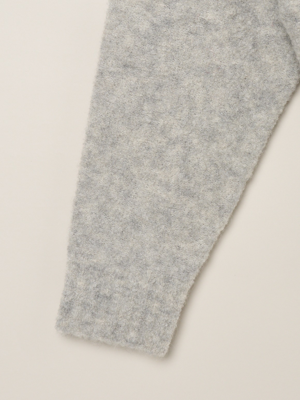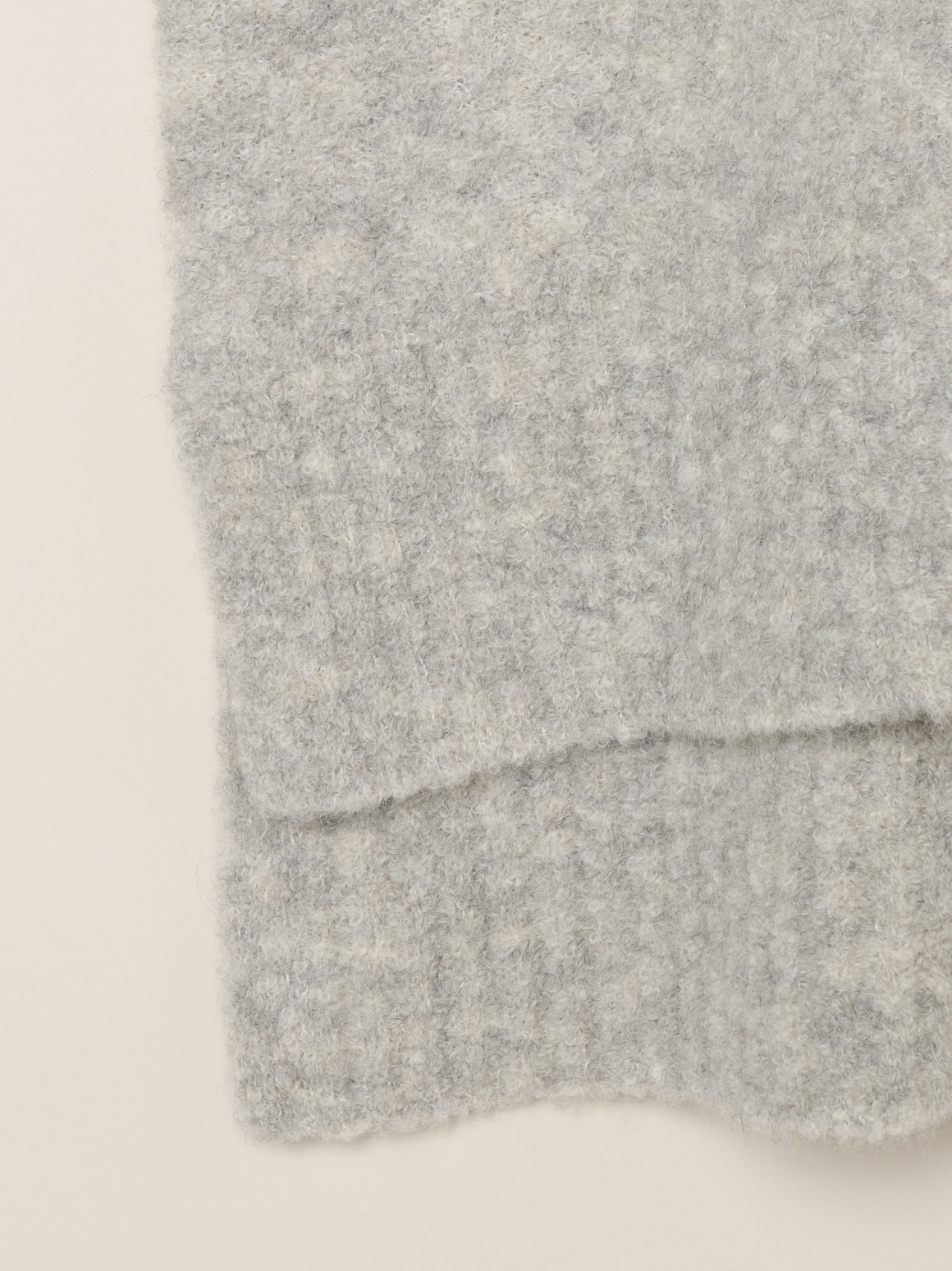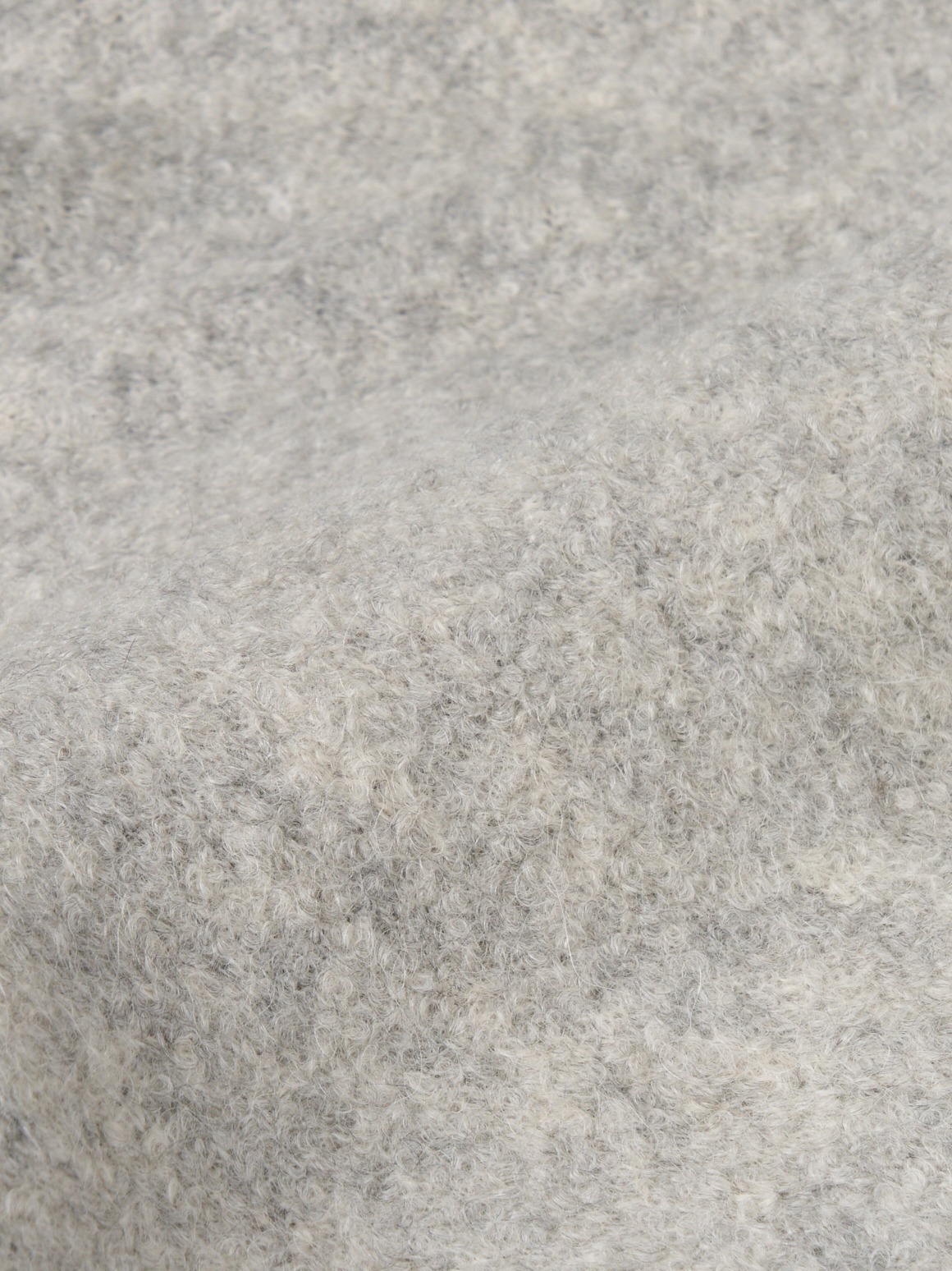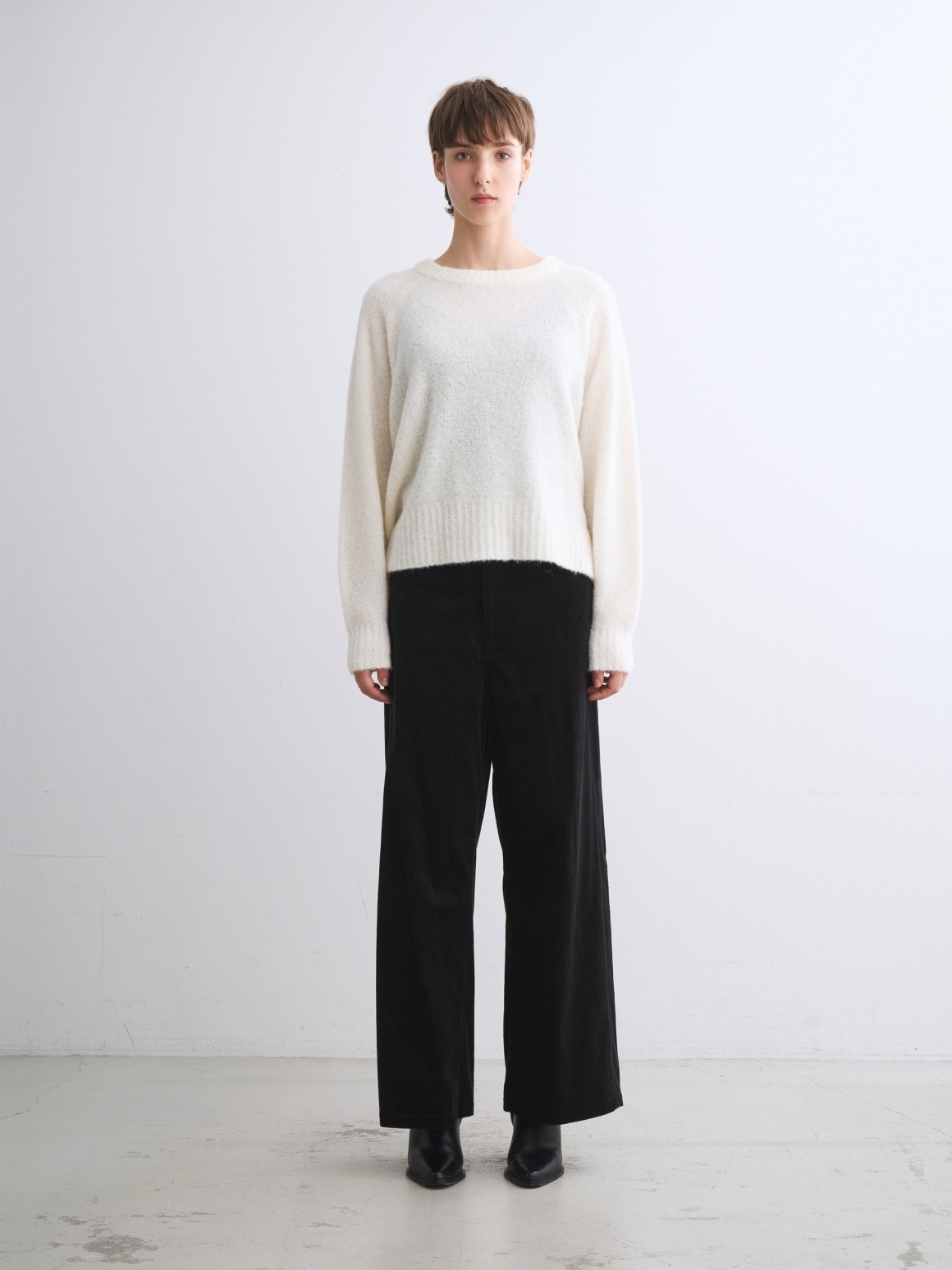 ふわふわもっちり。中肉の厚みのブークレニットはスウェットライクにすっきり着られて表情感も出せるアイテム。つかず離れずのシンプルなフィットはパンツもスカートも合わせられる万能アイテム。同素材でルーズフィットサイズのトップスも展開。