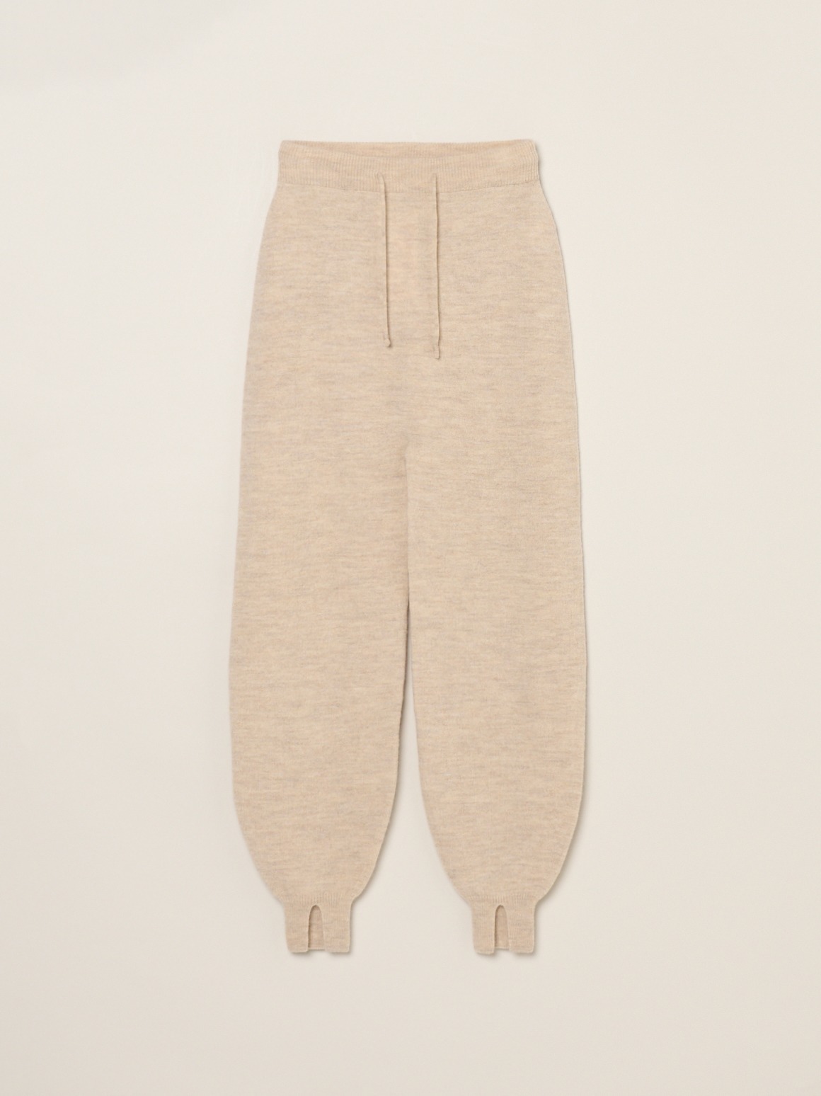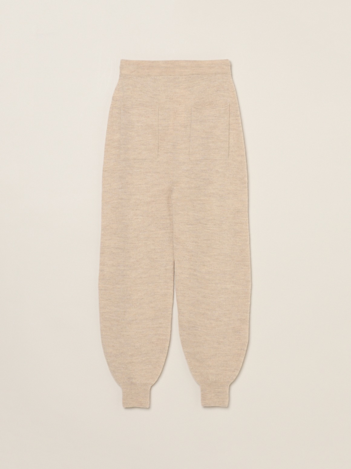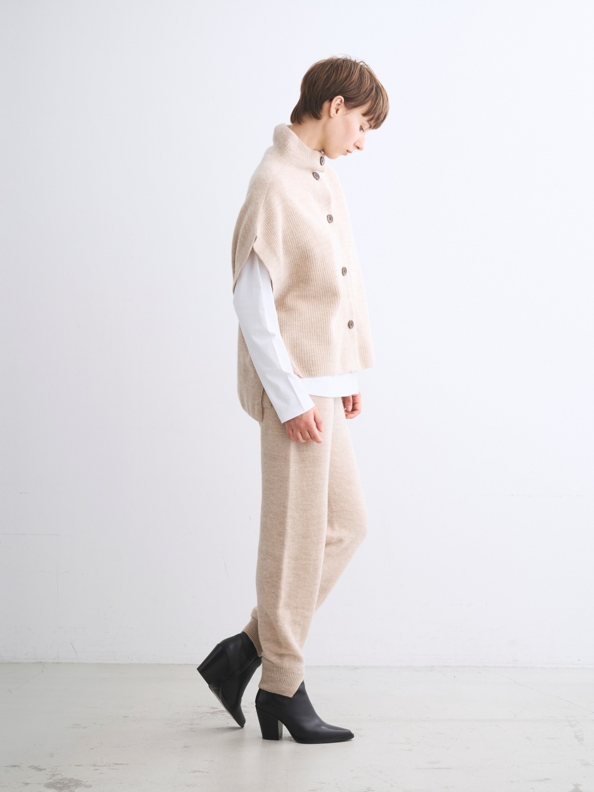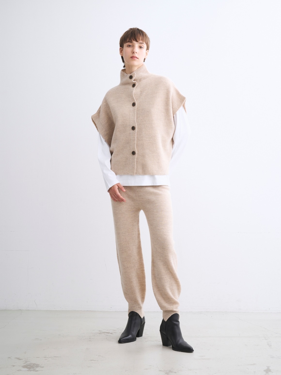 ウールカシミヤの贅沢な着心地を全身で味わえる、ニットセットアップのシリーズです。ふんわり軽やかな編地のニットパンツは丸みのあるジョガー型。ホールガーメントと言われる筒状に編む製法により、余分な接ぎ目が無く、ストレスフリーな着心地です。ペタンとしがちな脇のラインも立体的に丸くなり、細かいディテールながらに違いを感じられる1枚。裾のフロントスリットは足元の抜け感UPがかなうポイントに。同素材のセットアップ可能なベスト、スカートも展開しているので関連商品欄からご覧ください。