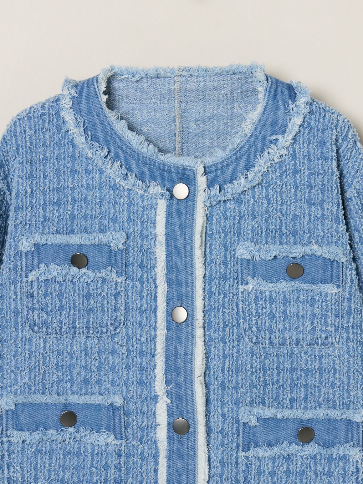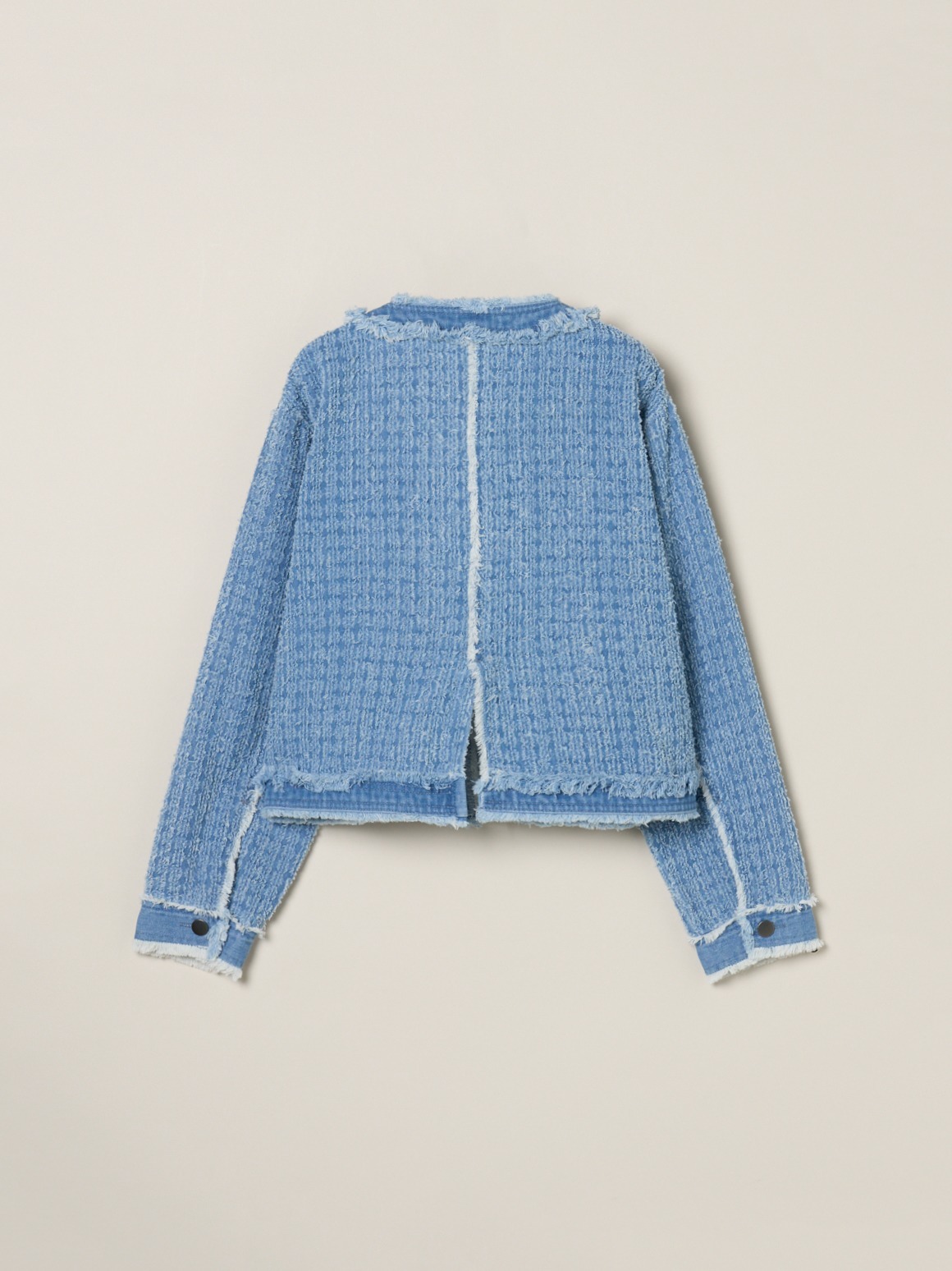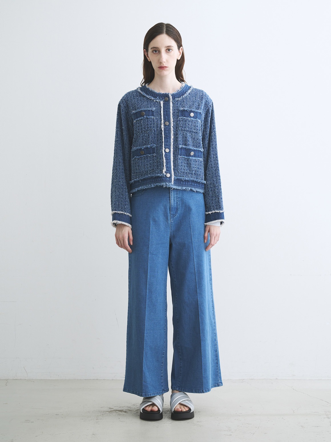 ツイードのように見えながら柔らかな着心地。日常に取り入れやすいのが魅力です。カジュアルにデニムを合わせてデニムセットアップもおすすめ。夏にはタンクトップを合わせてノースリーブのような着こなしも。同素材のジレも展開。