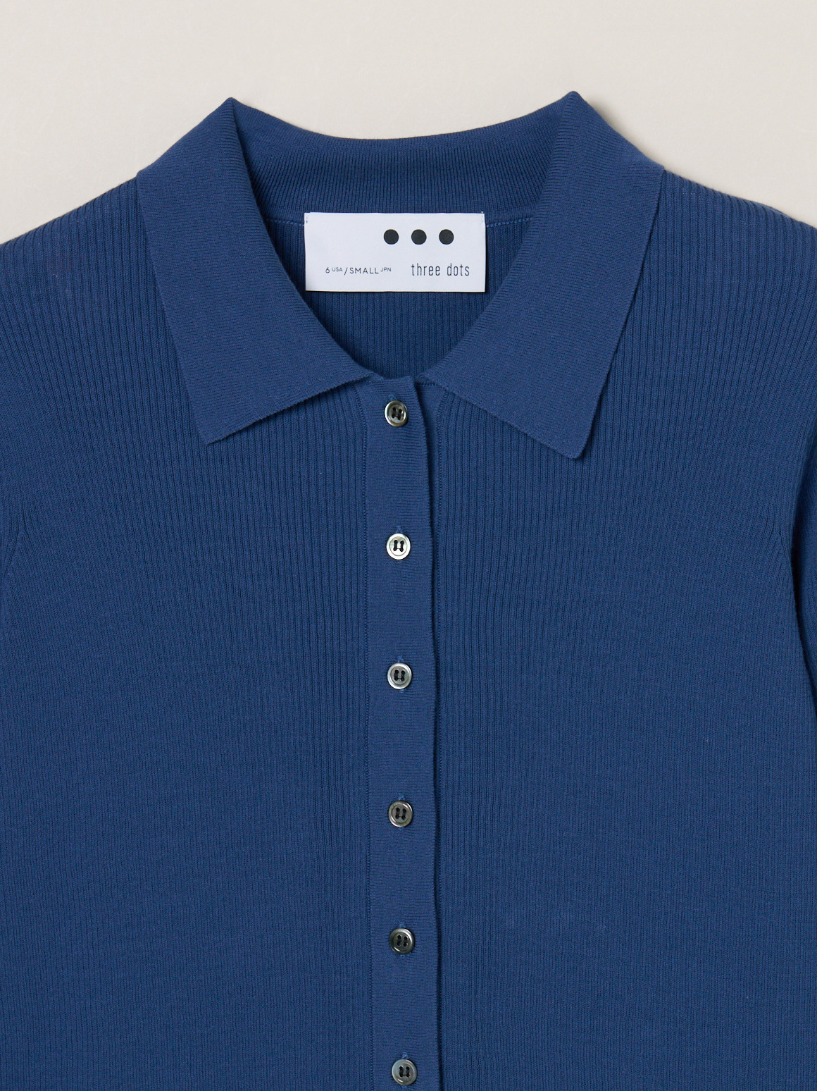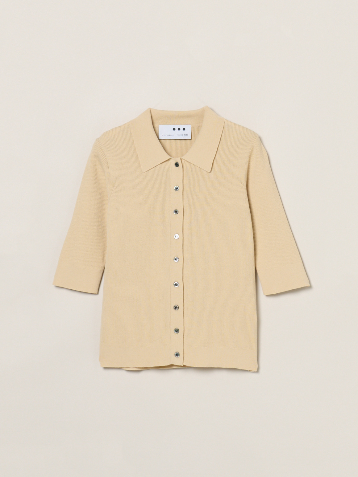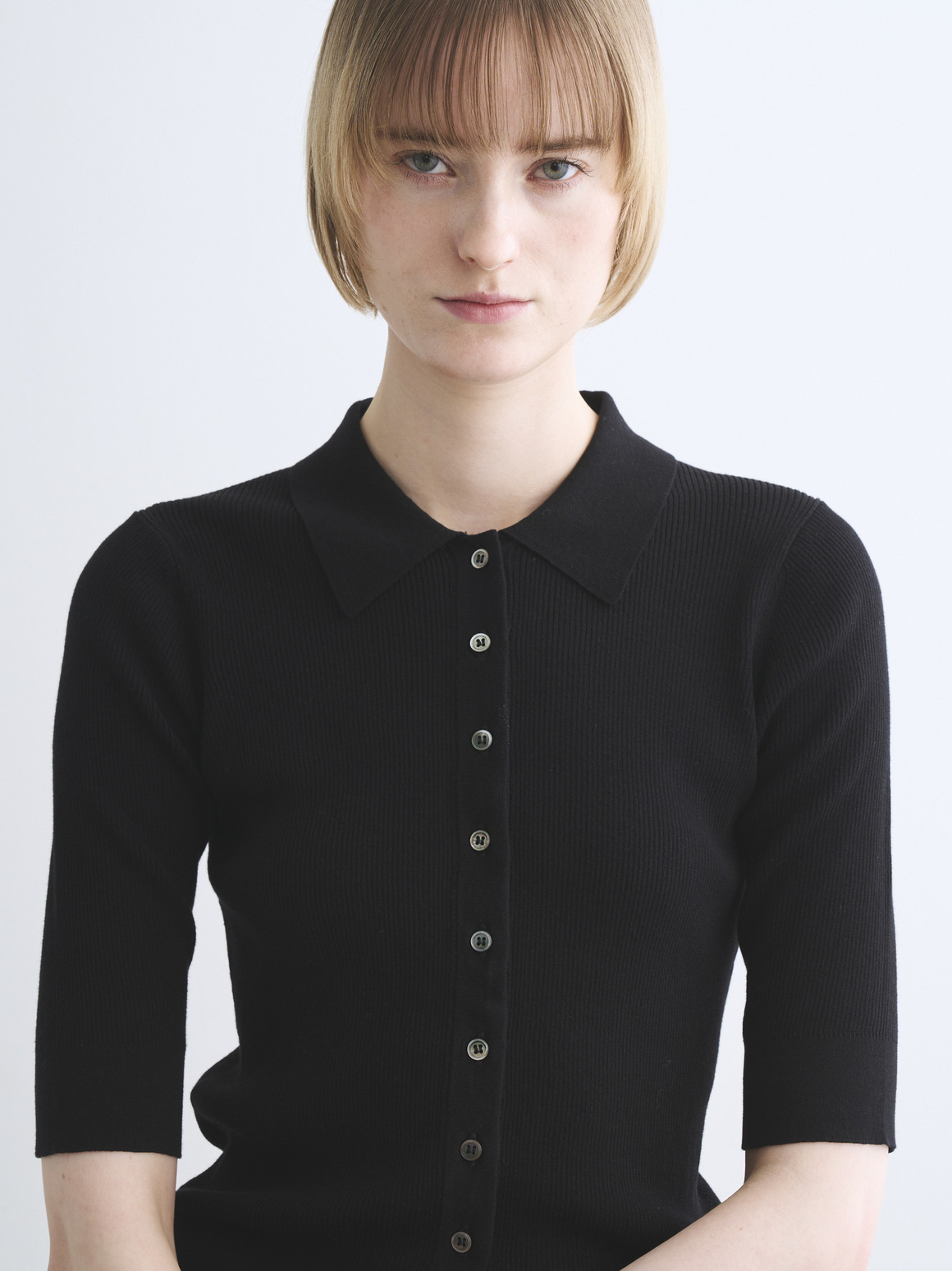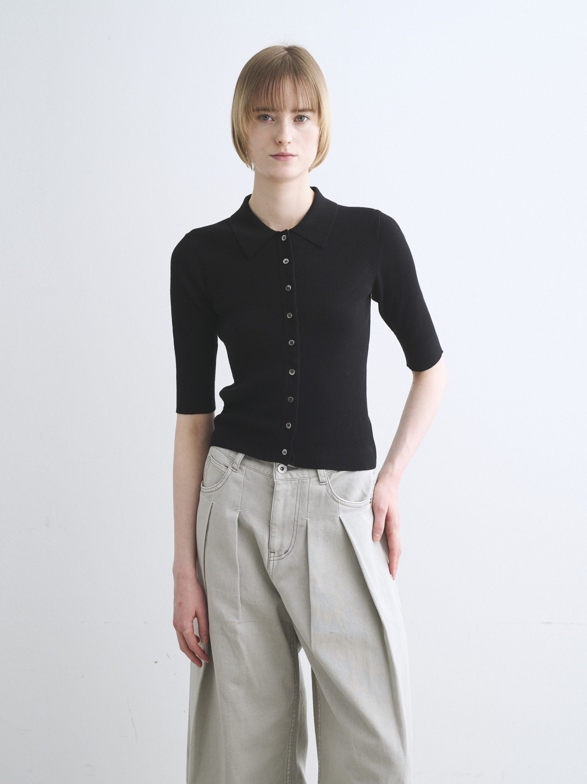 ハイツイストのコットン糸で若干凹凸のある表面に仕上げたニット。肌にまとわりつかないドライな質感が特徴です。フロントボタンのポロは羽織代わりにも活躍。小さなボタンで華奢な印象になるニットです。