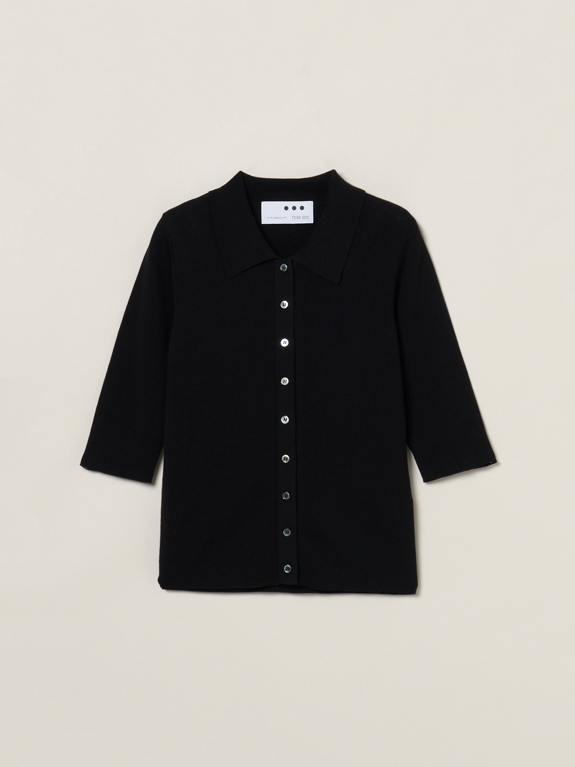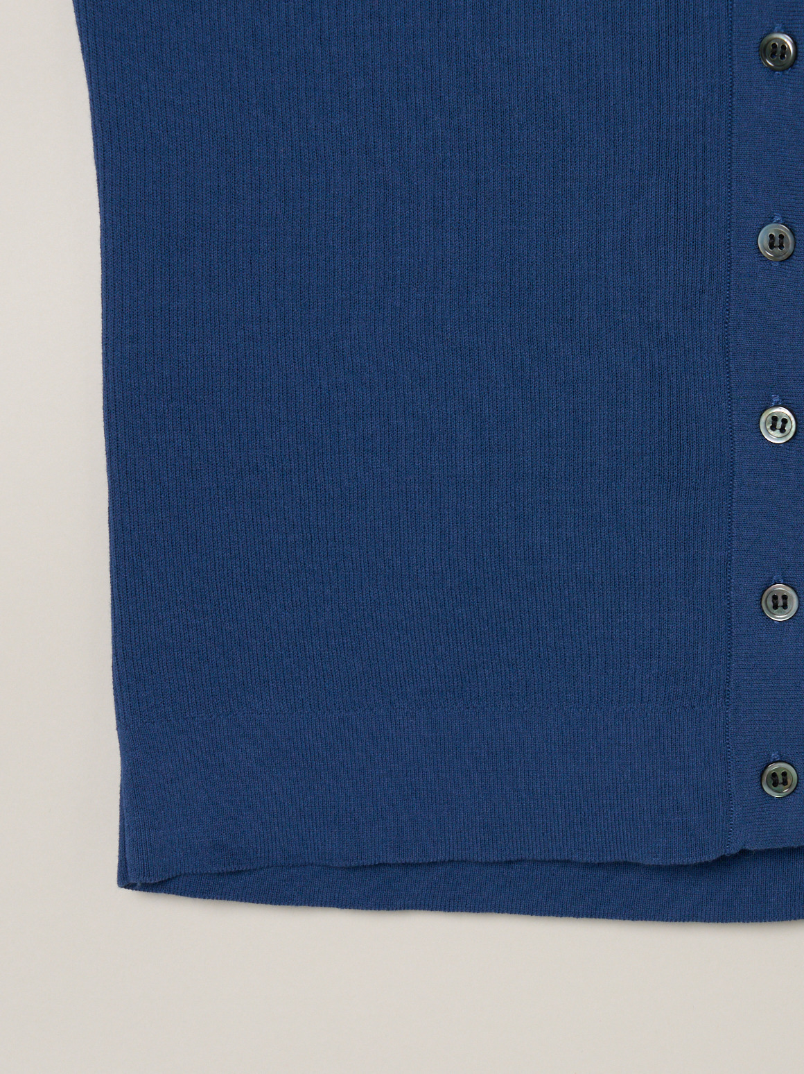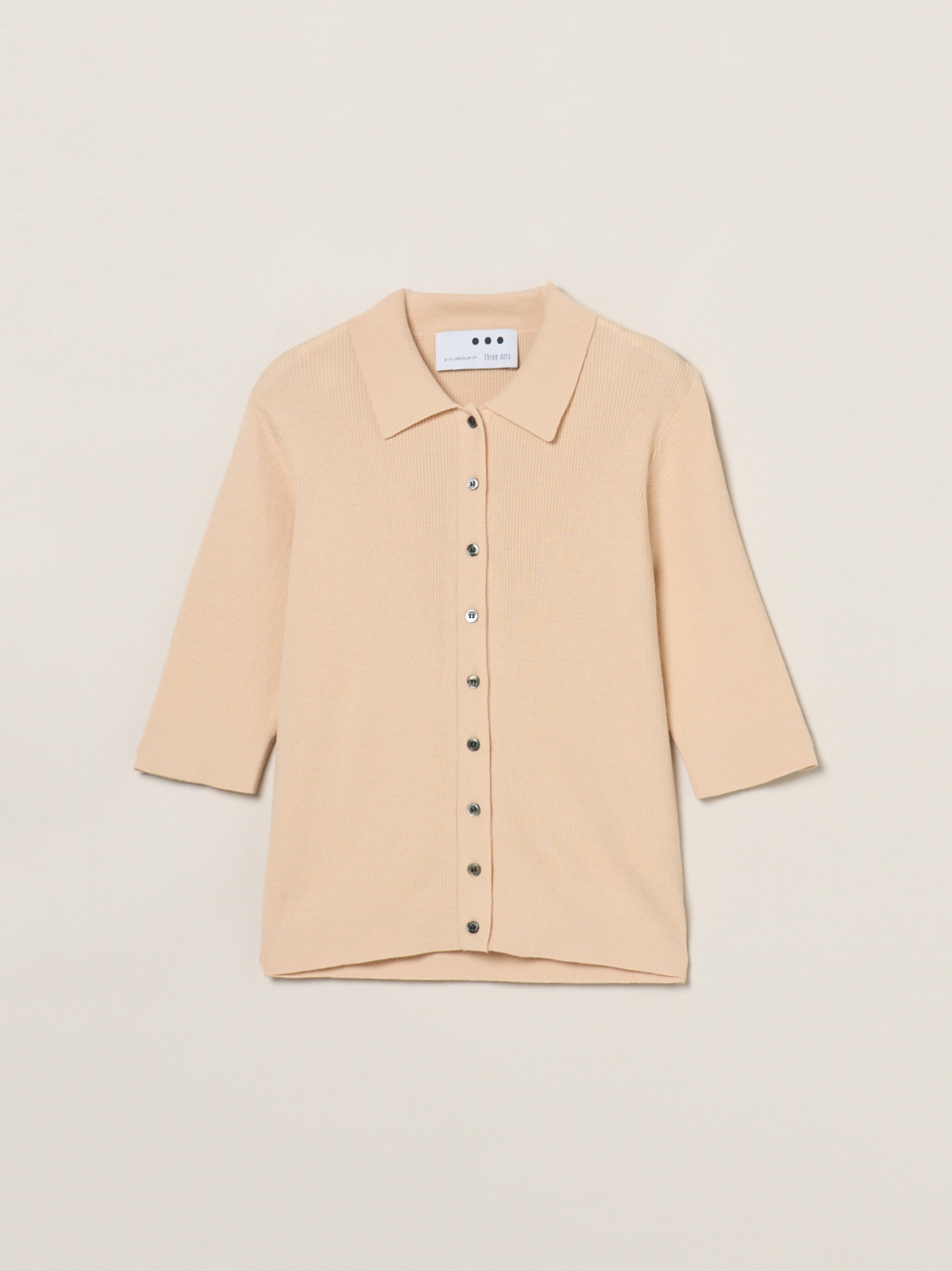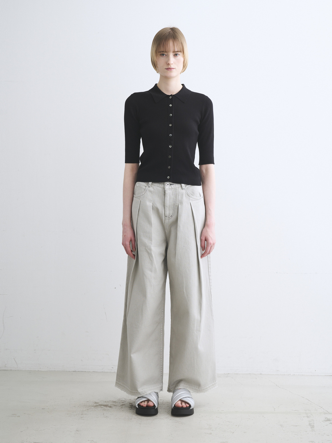 ハイツイストのコットン糸で若干凹凸のある表面に仕上げたニット。肌にまとわりつかないドライな質感が特徴です。フロントボタンのポロは羽織代わりにも活躍。小さなボタンで華奢な印象になるニットです。
