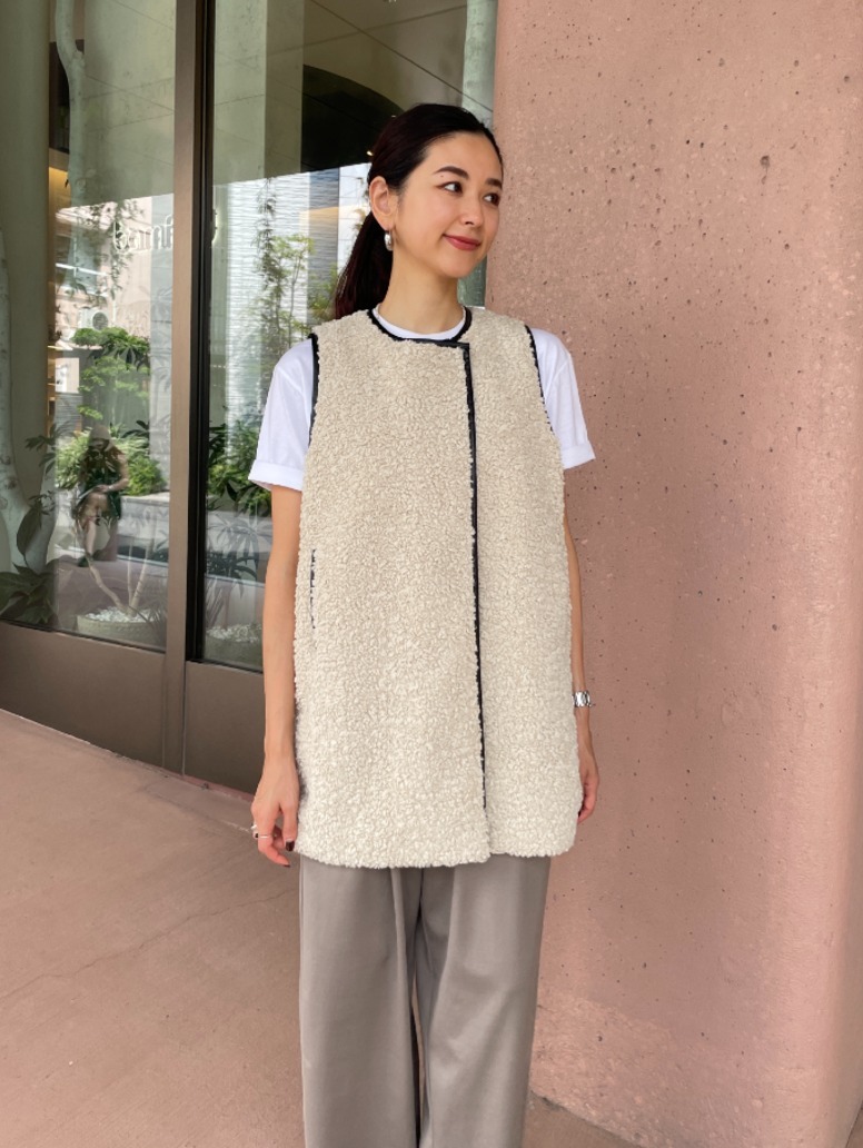 秋冬シーズンを代表するベストセラー、「POODLE BOA(プードルボア)」シリーズの定番人気スタイル、ノーカラーベスト。
