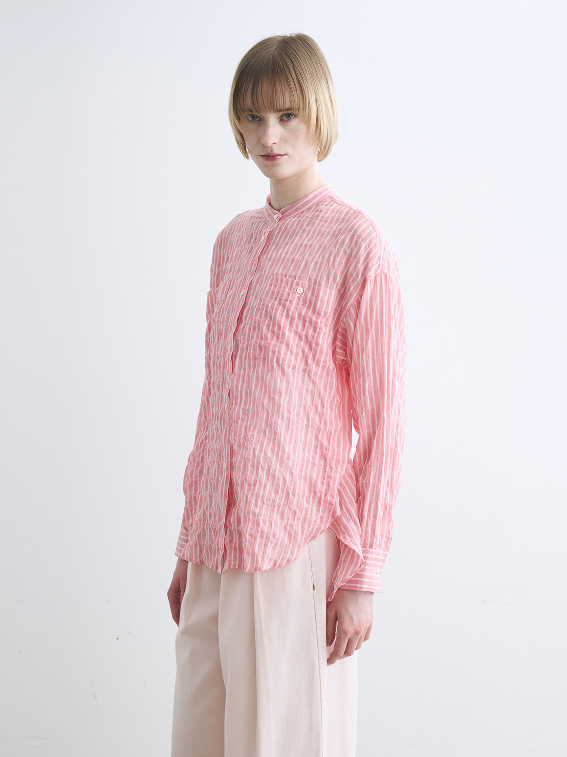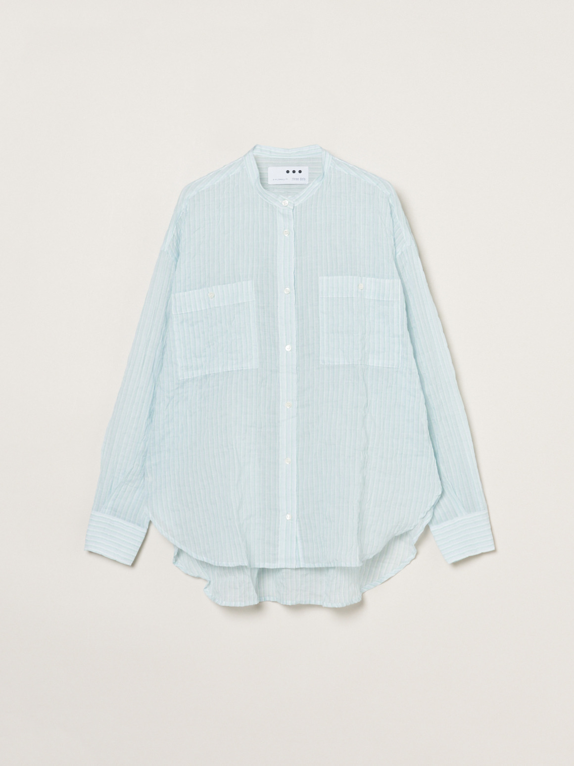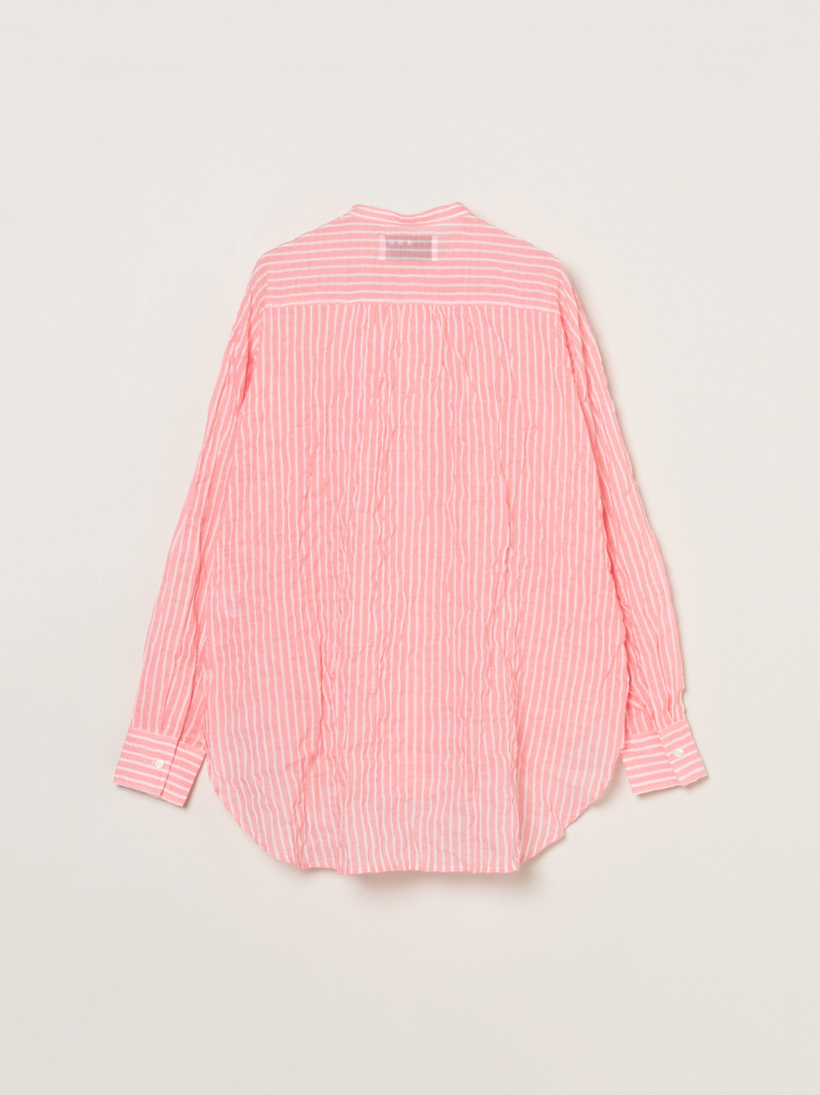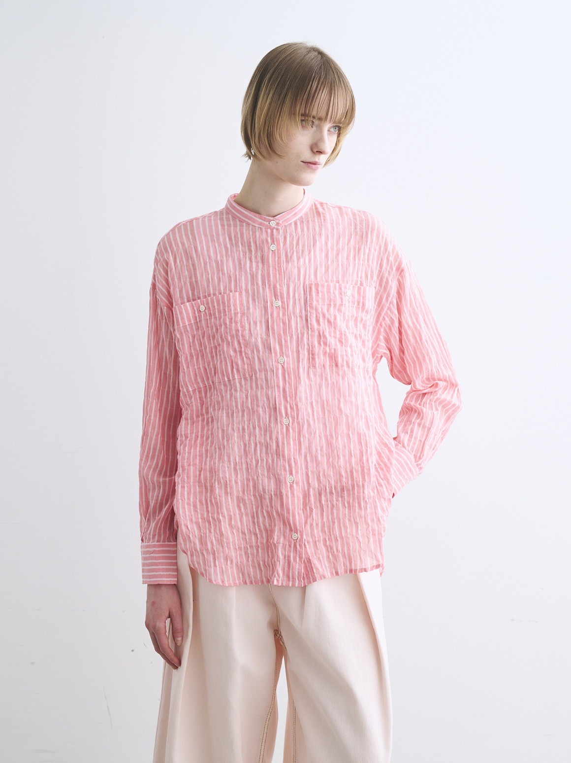 波打つステッチが特徴的な、ガーゼのようなシアーシャツ。軽く、薄手の素材なのでルーズシルエットも過度なボリュームを感じさせず体に沿って流れるようなシルエットに。動作によって風をはらみ、奥行きをかんじさせる着こなしが完成します。色によって異なる印象をもたらすので色違いでも活躍。インナーの色をひろって肩にかけたり、ジャケットとTシャツの間に挟んだり、さらにはボトムスのベルト通しに袖を通してベルト風の腰巻きにしたり。この薄さ・軽さならではの着こなしが楽しめます。シャーリング加工がされているので、シワが気にならず、冷房対策に持ち歩くのにも丁度よい1枚。