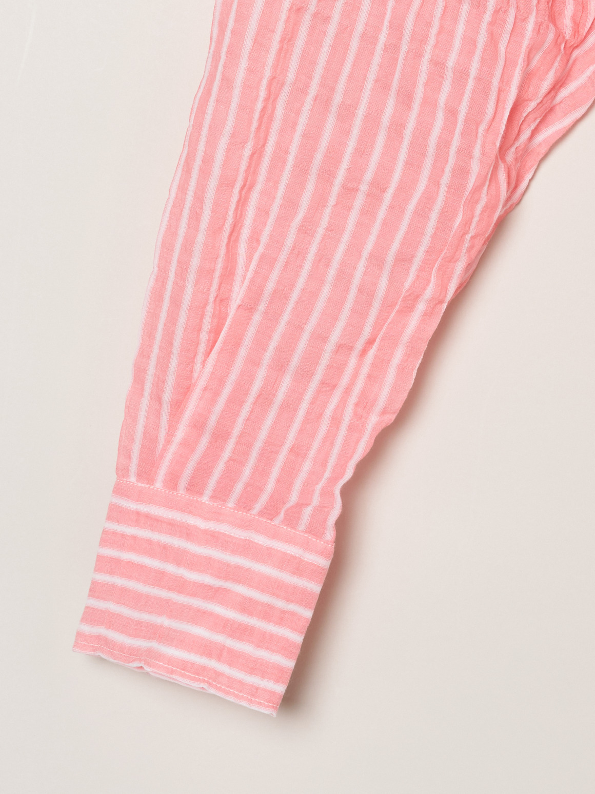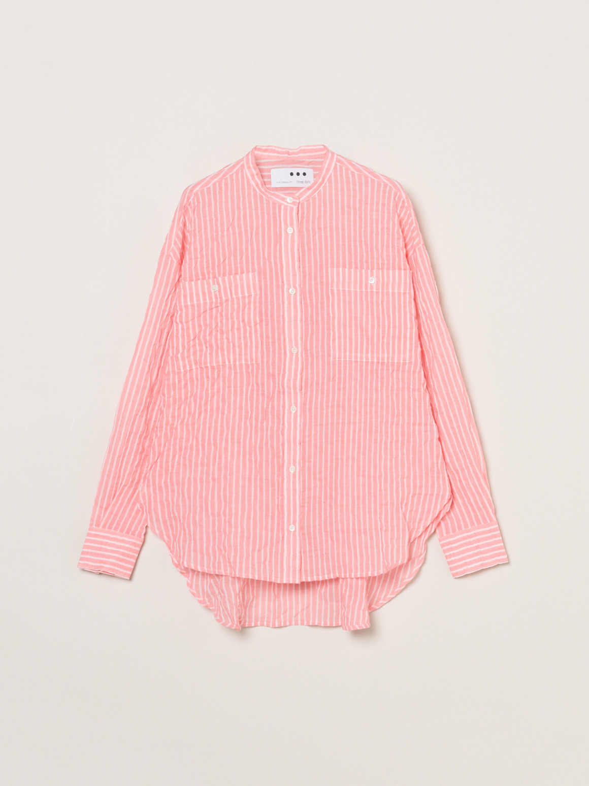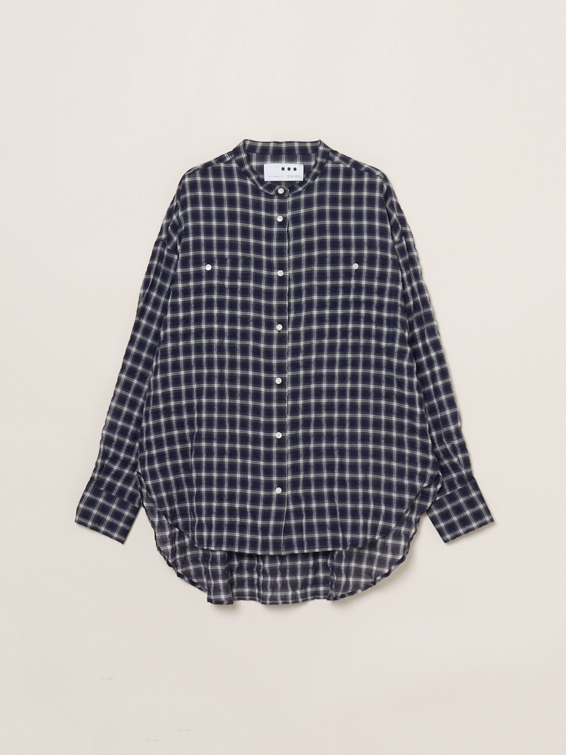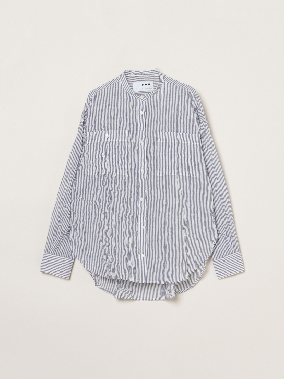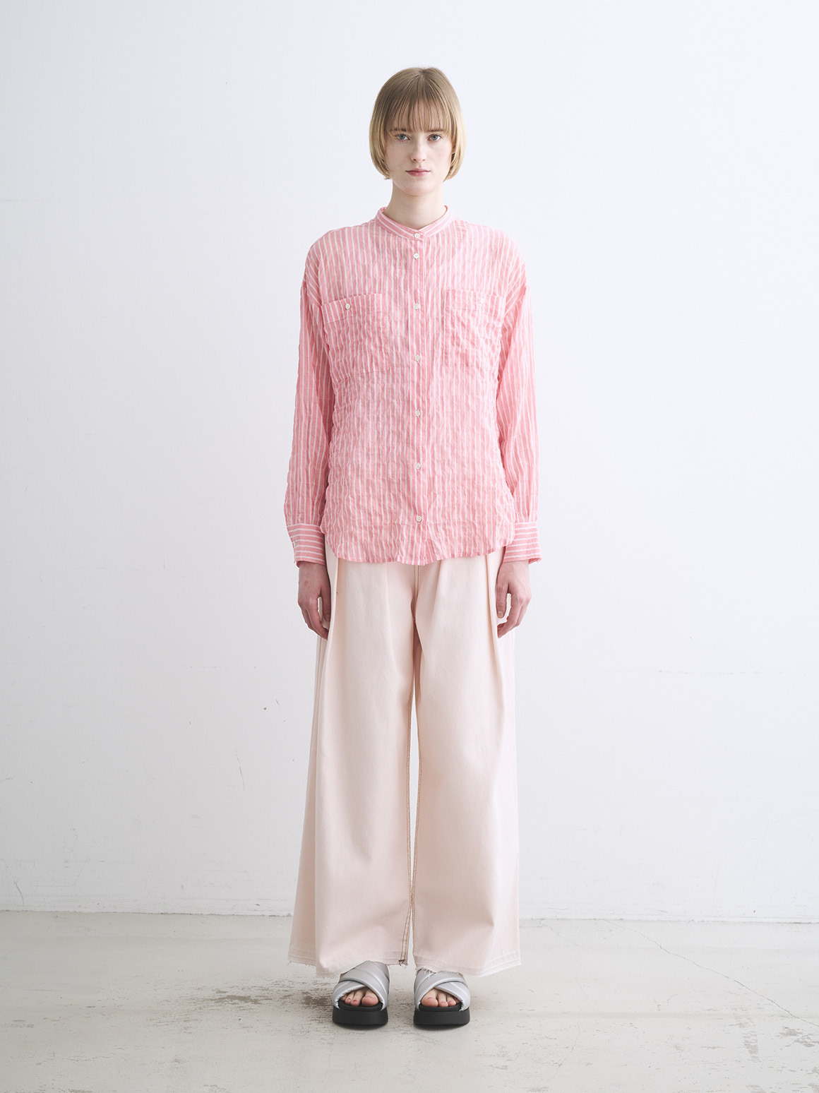 波打つステッチが特徴的な、ガーゼのようなシアーシャツ。軽く、薄手の素材なのでルーズシルエットも過度なボリュームを感じさせず体に沿って流れるようなシルエットに。動作によって風をはらみ、奥行きをかんじさせる着こなしが完成します。色によって異なる印象をもたらすので色違いでも活躍。インナーの色をひろって肩にかけたり、ジャケットとTシャツの間に挟んだり、さらにはボトムスのベルト通しに袖を通してベルト風の腰巻きにしたり。この薄さ・軽さならではの着こなしが楽しめます。シャーリング加工がされているので、シワが気にならず、冷房対策に持ち歩くのにも丁度よい1枚。