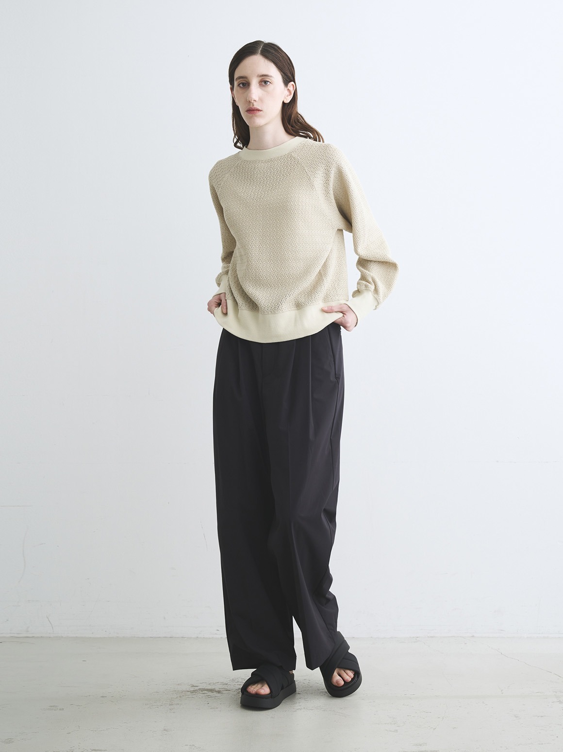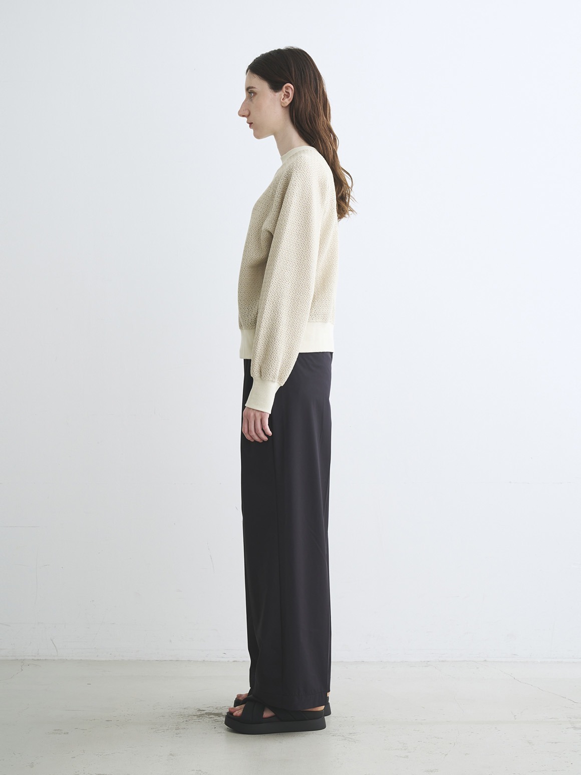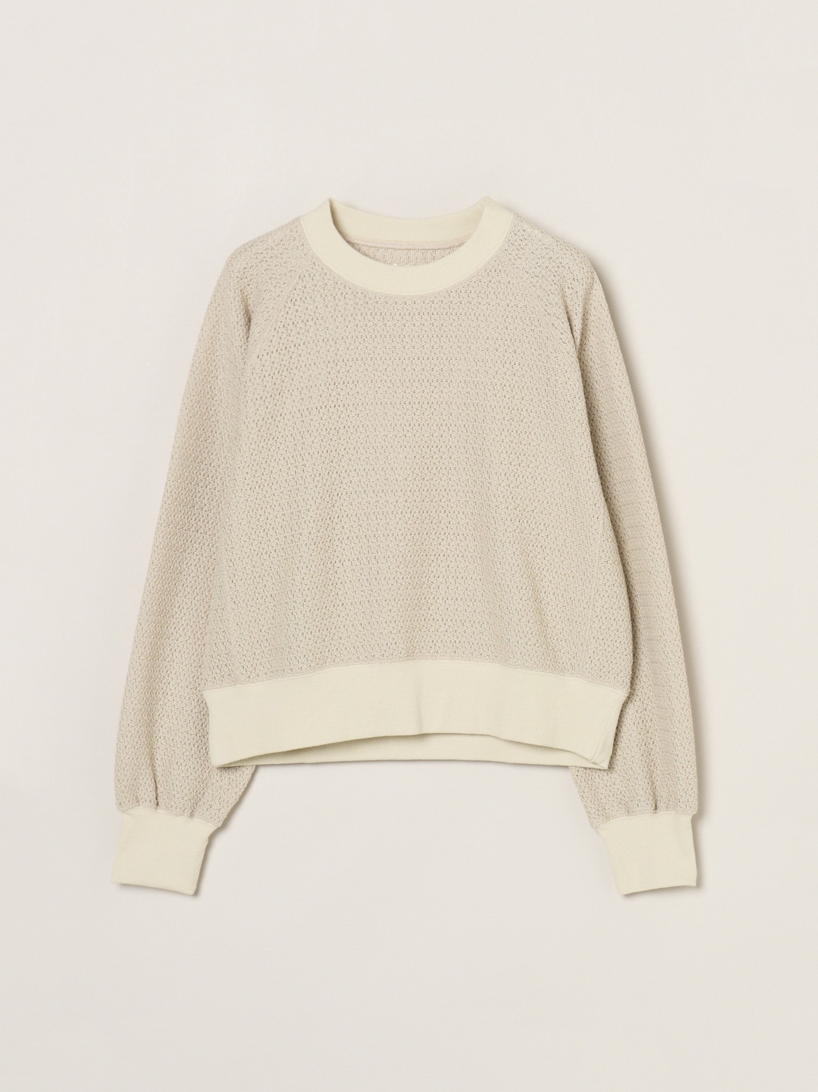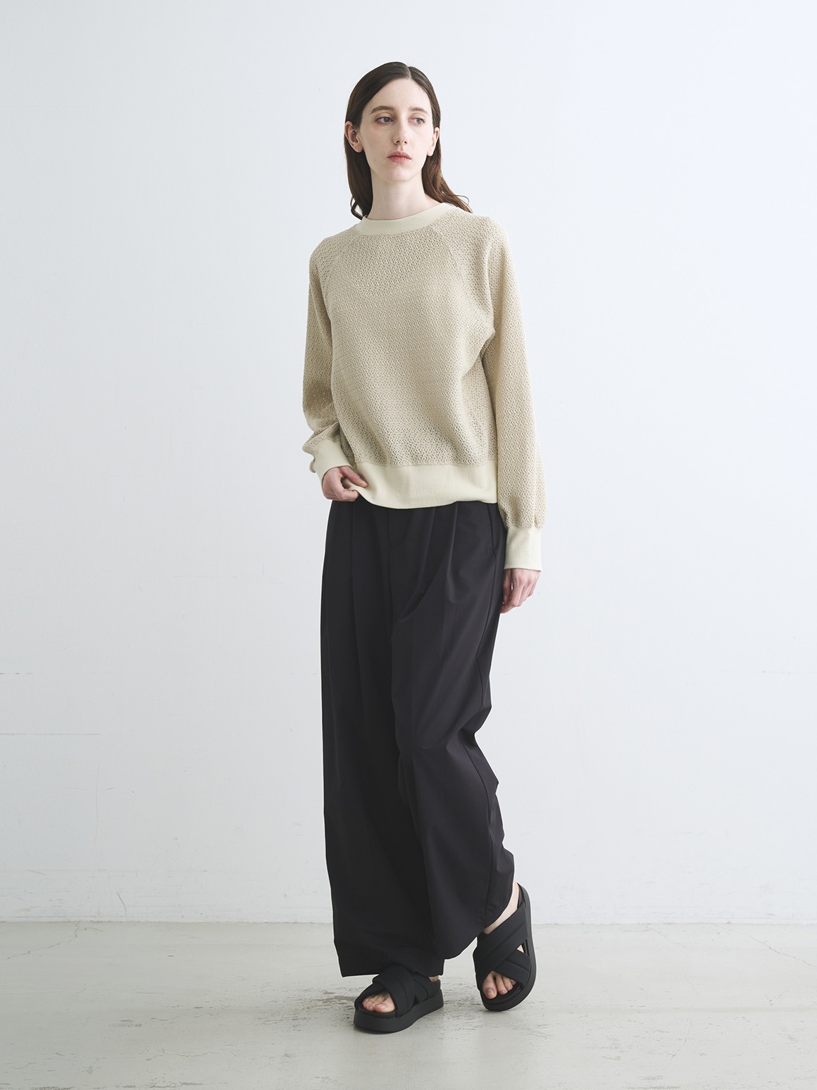 ラッセル機と呼ばれる機械で編んだレースのようなカットソー。軽やかでトレンド感がありながら、透けすぎないためスウェット感覚で着用可能。ハイネックカットソーなどを合わせれば季節をまたいで活躍します。同素材でバックリボンのデザイントップスも展開。