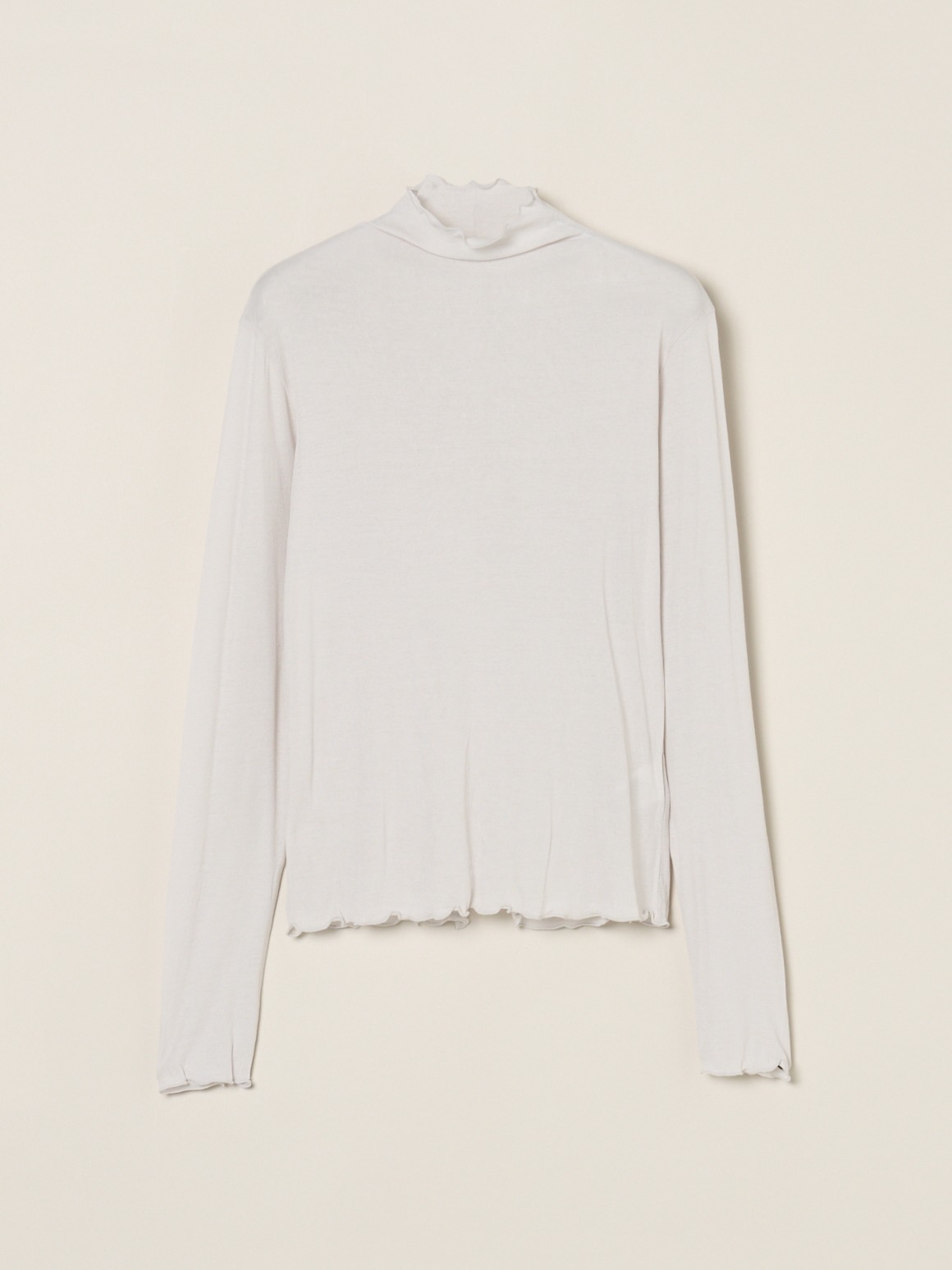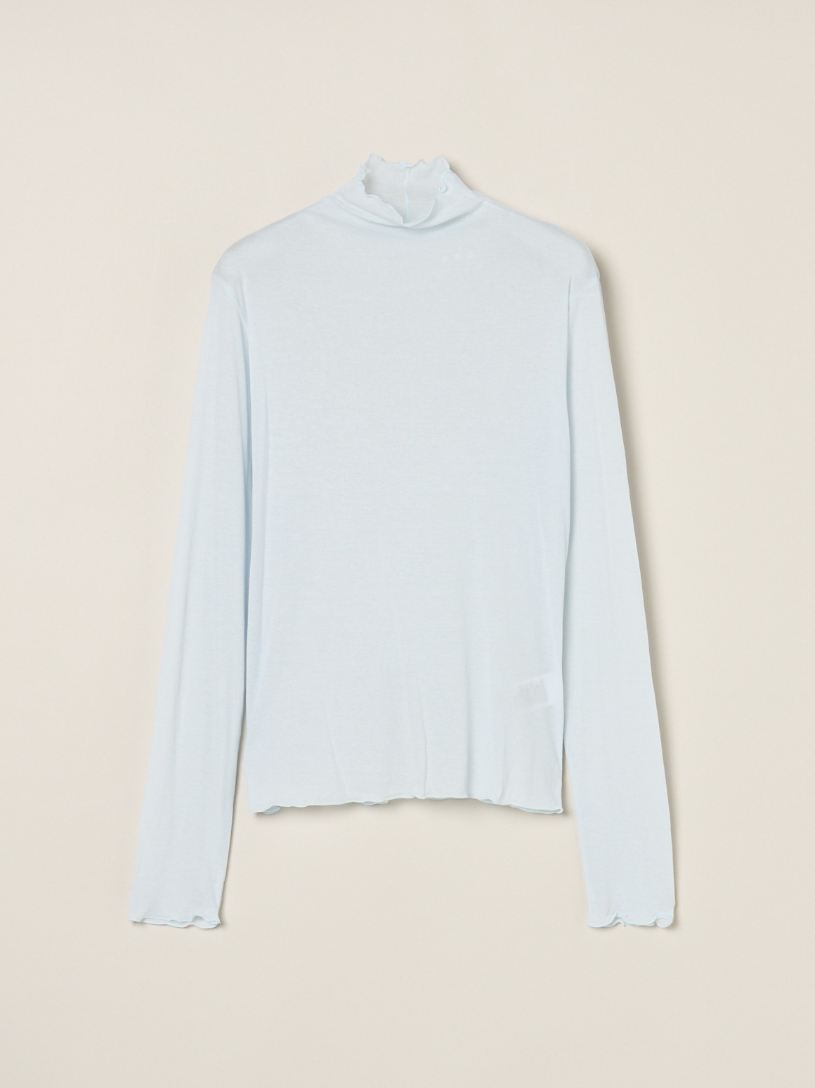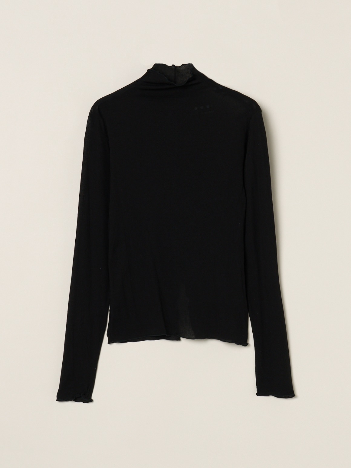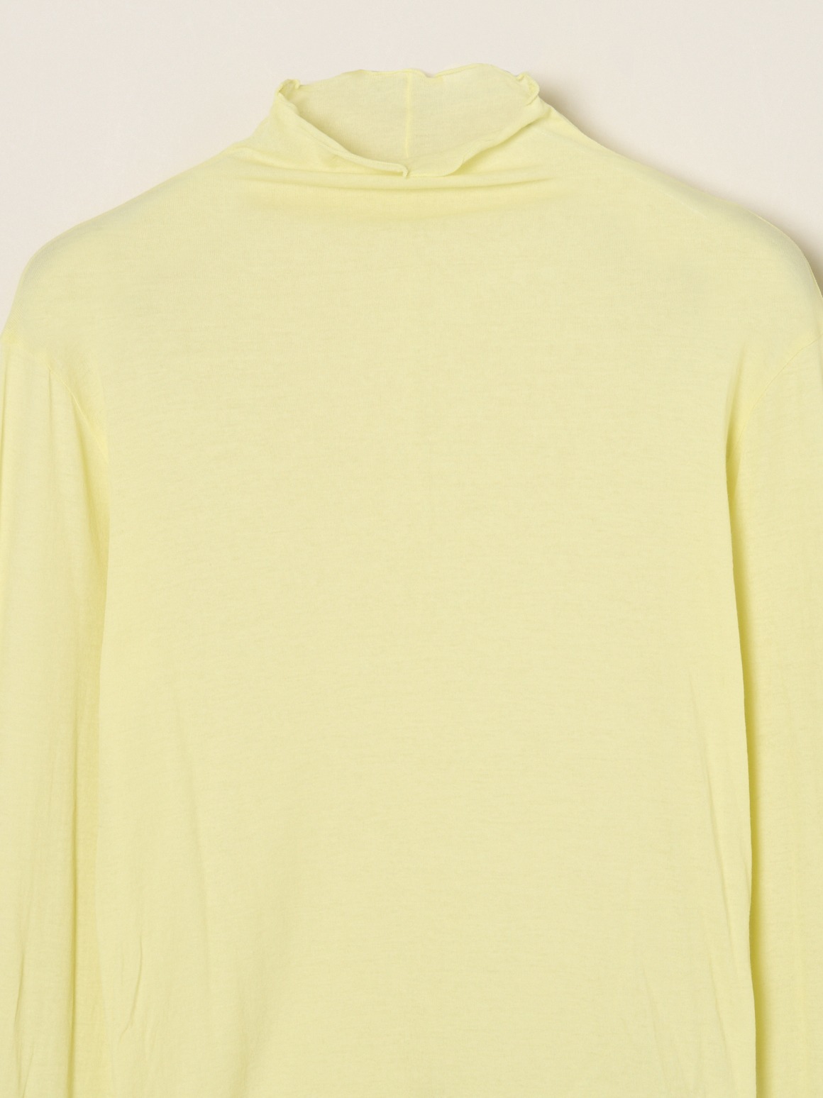 手の甲にかかる長めのロングスリーブです。ネック端などの始末はメロウと呼ばれる波打ったデザインで、重ね着のインにしても印象的。ネックが2重のタートルバージョンよりも軽やかに着用いただけます。